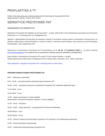 PROFILAKTYKA A TY Źródło: http://pat.policja.gov.pl/pat/wydarzenia/1612,Siemiatycki-Przystanek-PaT.html Wygenerowano: Sobota, 4 marca 2017, 00:04 SIEMIATYCKI PRZYSTANEK PAT ZAPRASZAMY DO SIEMIATYCZ! Siemiatycki Przystanek PaT odbędzie się 26 maja 2012 r. w godz. 9.00-22.00 na hali widowiskowo-sportowej przy Gimnazjum Publicznym nr 1 w Siemiatyczach (ul. Świętojańska 25). Zgodnie z ogólnopolską formułą Akcji do południa uczestnicy Przystanku wezmą udział w warsztatach artystycznych, po południu zaplanowana została PaTosfera w centrum miasta, a wieczorem gala finałowa, którą zakończy koncert Jarosława Chojnackiego - ikony społeczności PaT. Zgłoszenia na Siemiatycki Przystanek PaT przyjmowane są od 18 do 27 kwietnia 2012 r., na adres mailowy [email protected] oraz telefonicznie do koordynatora Elżbiety Jakubiuk 509766501 lub 856552675. Koszt udziału w Siemiatyckim Przystanku PaT wynosi 15 zł/os (pakiet startowy + posiłki). Istnieje ograniczona liczba miejsc noclegowych (10 zł z własną matą i śpiworem, 16 zł - łóżko z pościelą). Karta zgłoszenia i regulamin Przystanku PaT w Siemiatyczach na dole strony. PROGRAM SIEMIATYCKIEGO PRZYSTANKU PaT 8.00 - rejestracja uczestników 9.00 - 10.00 - uroczyste otwarcie Siemiatyckiego Przystanku PaT 10.00 - 13.00 - warsztaty artystyczne uczestników Przystanku PaT, spotkanie opiekunów grup 13.15 obiad - I tura 13.45 obiad - II tura 13.30 - zajęcia animacyjne w czasie posiłków (Sianie Dobra, Darmowe Przytulanie, Zabawy z Chustą, Belgijka) 14.30 - 16.00 - PaTosfera 16.00 - 18.00 - próby generalne – przygotowanie do koncertu finałowego 18.00 kolacja - I tura 18.30 kolacja - II tura 19.30 - Koncert finałowy Siemiatyckiego Przystanku PaT (estrada w hali widowiskowo-sportowej) 21.00 - Koncert Jarosława Chojnackiego 22.00 - zakończenie Siemiatyckiego Przystanku PaT Warsztaty Siemiatyckiego Przystanku PaT Wielkość grupy 10 Lp Nazwa warsztatu Prowadzący Wymagania prowadzącego 1 Coś z niczego - decupage Beata Korniluk 2 Teatr ulicy Hubert Prekurat 3 Dziennikarskie Redakcja Głosu Siemiatycz 4 Fryzjerski vintage Ewelina Dołoto 5 6 Wizaż Fotograficzne 7 Dramy 8 9 10 11 12 Malarskie Performance Wokalne Bezpieczeństwo jest w Tobie Hip Hop-owa mowa Taniec Polski w Formie Towarzyskiej Ewa Chrołowska Jan Goliński Agnieszka Buśk (Stowarzyszenie Stop-Klatka) Renata Prokopiak Paula Siniakowicz Urszula Tomasik Straż Pożarna Zespół „Raspal”, Jędrek Kupiec -------------------------Biały i czarny strój od góry do dołu, czyli białe bluzki bez 50 nadruków i biały gładki dół oraz czarne bluzki i czarny dół. Przy zgłoszeniu podać własny 8 adres mailowy Przy zgłoszeniu podać własny 8 adres mailowy Własne kosmetyki 8 Własne aparaty fot. 13 Krzysztof Szyszko 14 Karate Andrzej Nowaczuk 15 Teatralne Roman Holc 16 Capoeira Emilian Jarnutowski 17 18 Taniec nowoczesny Hip Hop (taniec) Agnieszka Kurek Johnson Branko Bielopotocky --------------------------------------------------Budziki Czarne koszulki --------------------------------------------------Obuwie taneczne Uczestnicy posiadają białe koszulki, ciemne sportowe spodnie, obuwie sportowe -------------------------Strój sportowy + dodatkowo na koncert strój w białym kolorze Obuwie taneczne Obuwie taneczne 20 10 30 30 b.o 30 30 30 50 30 50 80 ZAŁĄCZNIKI DO STRONY KARTA ZGŁOSZENIA I REGULAMIN 50.5 KB Ocena: 5/5 (1) Tweetnij
