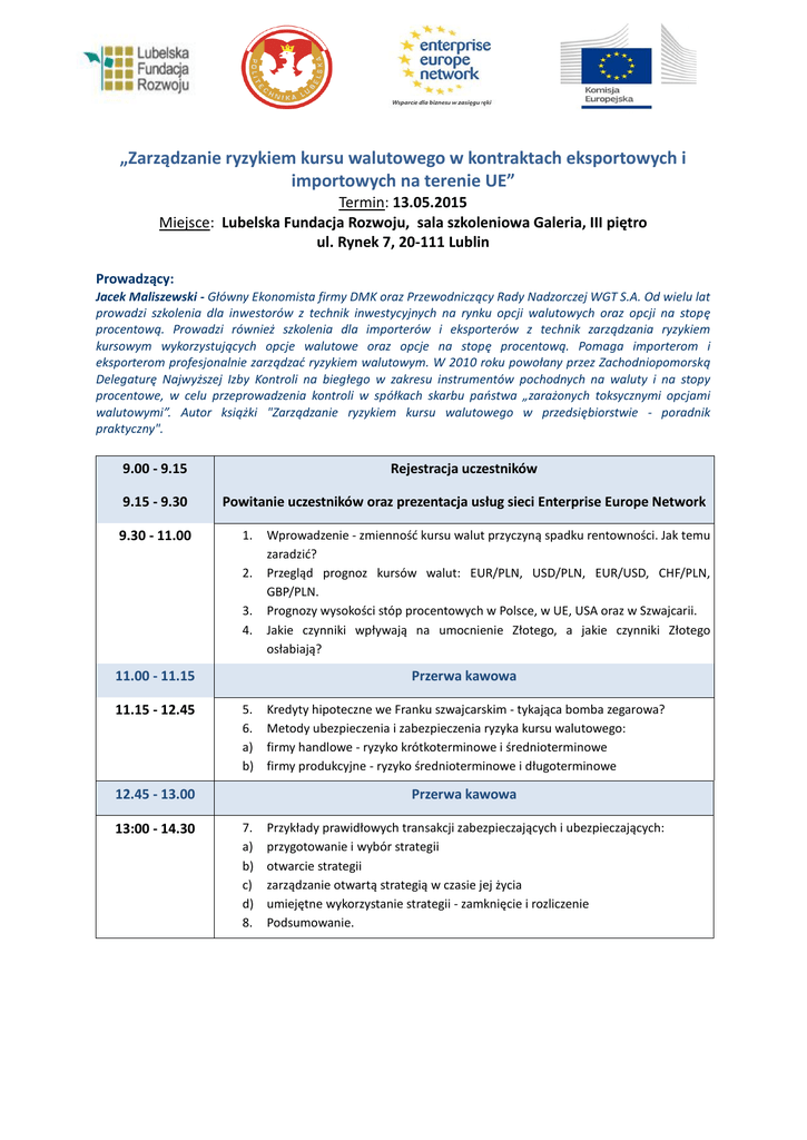 „Zarządzanie ryzykiem kursu walutowego w kontraktach eksportowych i importowych na terenie UE” Termin: 13.05.2015 Miejsce: Lubelska Fundacja Rozwoju, sala szkoleniowa Galeria, III piętro ul. Rynek 7, 20-111 Lublin Prowadzący: Jacek Maliszewski - Główny Ekonomista firmy DMK oraz Przewodniczący Rady Nadzorczej WGT S.A. Od wielu lat prowadzi szkolenia dla inwestorów z technik inwestycyjnych na rynku opcji walutowych oraz opcji na stopę procentową. Prowadzi również szkolenia dla importerów i eksporterów z technik zarządzania ryzykiem kursowym wykorzystujących opcje walutowe oraz opcje na stopę procentową. Pomaga importerom i eksporterom profesjonalnie zarządzać ryzykiem walutowym. W 2010 roku powołany przez Zachodniopomorską Delegaturę Najwyższej Izby Kontroli na biegłego w zakresu instrumentów pochodnych na waluty i na stopy procentowe, w celu przeprowadzenia kontroli w spółkach skarbu państwa „zarażonych toksycznymi opcjami walutowymi”. Autor książki "Zarządzanie ryzykiem kursu walutowego w przedsiębiorstwie - poradnik praktyczny". 9.00 - 9.15 Rejestracja uczestników 9.15 - 9.30 Powitanie uczestników oraz prezentacja usług sieci Enterprise Europe Network 9.30 - 11.00 1. 2. 3. 4. 11.00 - 11.15 11.15 - 12.45 Przerwa kawowa 5. 6. a) b) 12.45 - 13.00 13:00 - 14.30 Wprowadzenie - zmienność kursu walut przyczyną spadku rentowności. Jak temu zaradzić? Przegląd prognoz kursów walut: EUR/PLN, USD/PLN, EUR/USD, CHF/PLN, GBP/PLN. Prognozy wysokości stóp procentowych w Polsce, w UE, USA oraz w Szwajcarii. Jakie czynniki wpływają na umocnienie Złotego, a jakie czynniki Złotego osłabiają? Kredyty hipoteczne we Franku szwajcarskim - tykająca bomba zegarowa? Metody ubezpieczenia i zabezpieczenia ryzyka kursu walutowego: firmy handlowe - ryzyko krótkoterminowe i średnioterminowe firmy produkcyjne - ryzyko średnioterminowe i długoterminowe Przerwa kawowa 7. a) b) c) d) 8. Przykłady prawidłowych transakcji zabezpieczających i ubezpieczających: przygotowanie i wybór strategii otwarcie strategii zarządzanie otwartą strategią w czasie jej życia umiejętne wykorzystanie strategii - zamknięcie i rozliczenie Podsumowanie.