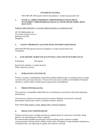 ETYKIETO-ULOTKA MYCOFLOR 200 mg/ml roztwór do podania w wodzie do picia dla świń 1. NAZWA I ADRES PODMIOTU ODPOWIEDZIALNEGO ORAZ WYTWÓRCY ODPOWIEDZIALNEGO ZA ZWOLNIENIE SERII, JEŚLI JEST INNY Podmiot odpowiedzialny i wytwórca odpowiedzialny za zwolnienie serii: SP VETERINARIA SA Ctra. Reus-Vinyols, km 4,1 Riudoms (43330) Hiszpania 2. NAZWA PRODUKTU LECZNICZEGO WETERYNARYJNEGO MYCOFLOR 200 mg/ml roztwór do podania w wodzie do picia dla świń Florfenikol 3. ZAWARTOŚĆ SUBSTANCJI CZYNNEJ (-CH) I INNYCH SUBSTANCJI Florfenikol 200 mg/ml Roztwór do podania w wodzie do picia Żółty, klarowny roztwór 4. WSKAZANIA LECZNICZE Świnie: Leczenie i zapobieganie zakażeniom układu oddechowego wywołanym przez szczepy Actinobacillus pleuropneumoniae i Pasteurella multocida wrażliwe na florfenikol. Obecność choroby w stadzie należy ustalić przed rozpoczęciem metafilaktyki. 5. PRZECIWWSKAZANIA Nie stosować w przypadku nadwrażliwości na substancję czynną lub na dowolną substancję pomocniczą. Nie stosować u knurów przeznaczonych do rozrodu. Badania na szczurach wykazały potencjalny niekorzystny wpływ na układ rozrodczy samców. Patrz punkt Stosowanie w ciąży, laktacji lub w okresie nieśności. 6. DZIAŁANIA NIEPOŻĄDANE Podczas leczenia może wystąpić nieznaczny spadek spożycia wody przez zwierzęta, mogą pojawić się ciemnobrązowe stolce i zaparcia. Po zastosowaniu produktu leczniczego weterynaryjnego może czasami wystąpić zaczerwienienie i obrzęk okolic odbytu i luźne stolce. Działania te mają charakter przejściowy, są krótkotrwałe i nie wpływają na ogólny stan zdrowia zwierząt. Może wystąpić wypadanie odbytu, które ustępuje bez konieczności leczenia. W przypadku zaobserwowania jakichkolwiek poważnych objawów lub innych objawów niewymienionych w etykieto-ulotce, poinformuj o nich lekarza weterynarii. 7. DOCELOWE GATUNKI ZWIERZĄT Świnie 8. DAWKOWANIE DLA KAŻDEGO GATUNKU, DROGA (-I) I SPOSÓB PODANIA Podanie w wodzie do picia Zalecana dawka wynosi 10 mg florfenikolu na kg masy ciała na dobę (co odpowiada 5 ml produktu/100 kg masy ciała), do podawania przez 5 kolejnych dni. Stopień pobrania wody zawierającej produkt leczniczy zależy od szeregu czynników, w tym od stanu klinicznego zwierząt oraz warunków lokalnych, takich jak temperatura otoczenia i wilgotność. W celu utrzymania prawidłowego dawkowania należy monitorować pobranie wody i w razie potrzeby dostosować stężenie florfenikolu. Jeśli nie jest możliwe uzyskanie odpowiedniego stopnia pobrania wody zawierającej produkt leczniczy, zwierzęta należy leczyć pozajelitowo. Dokładną ilość produktu weterynaryjnego do dziennego zastosowania należy obliczyć na podstawie zalecanej dawki, liczby i masy zwierząt poddawanych leczeniu według następującego wzoru: X ml produktu na średnia masa ciała (kg) zwierząt x kg m.c. na dobę poddawanych leczeniu średnie dzienne spożycie wody (w litrach) na zwierzę = X ml produktu na litr wody do picia W celu zapewnienia prawidłowego dawkowania masa ciała powinna zostać określona tak dokładnie, jak jest to możliwe, aby uniknąć przedawkowania. Odpowiednią ilość wody zawierającej produkt leczniczy należy przygotować na podstawie dziennego spożycia wody. Produkt leczniczy weterynaryjny należy dodać do wody do picia, mieszając do całkowitego rozpuszczenia. W celu zapewnienia odpowiedniego spożycia wody zawierającej produkt leczniczy, zwierzęta powinny mieć wystarczający dostęp do jej źródeł. Żadne inne źródło wody do picia nie powinno być dostępne w trakcie leczenia. W systemach chowu na wolnym wybiegu zwierzęta należy trzymać w odosobnieniu w trakcie leczenia. Po zakończeniu leczenia należy dokładnie oczyścić zbiornik na wodę, aby uniknąć podawania subterapeutycznych ilości substancji czynnej. DLA DOZOWNIKA: 1. Wprowadzić odpowiednią ilość roztworu doustnego Mycoflor 200 mg/ml do dozownika i rozcieńczyć wodą do picia w następujący sposób (przykłady): Masa zwierząt 500 kg Ilość produktu 25 ml Ilość wody (co odpowiada 1mg florfenikolu na 1 ml wody) 5l 1000 kg 10000 kg 50 ml 500 ml 10 l 100 l 2. Dokładnie wymieszać. 3. Ustawić dozownik na 10%. 4. Włączyć dozownik. 9. ZALECENIA DLA PRAWIDŁOWEGO PODANIA Uwaga: W przypadku roztworów o stężeniu wyższym niż 1,2 g florfenikolu na litr może wytrącać się osad. 10. OKRES KARENCJI Tkanki jadalne: 23 dni 11. SPECJALNE ŚRODKI OSTROŻNOŚCI PODCZAS PRZECHOWYWANIA Przechowywać w miejscu niewidocznym i niedostępnym dla dzieci. Brak specjalnych środków ostrożności dotyczących przechowywania. Nie używać tego produktu leczniczego weterynaryjnego po upływie terminu ważności (EXP) podanego na etykiecie. Termin ważności oznacza ostatni dzień danego miesiąca. Okres ważności po pierwszym otwarciu opakowania bezpośredniego: 3 miesiące Zawartość otwartego opakowania należy zużyć do________ Okres ważności po rozcieńczeniu zgodnie z instrukcją: 24 godziny. 12. SPECJALNE OSTRZEŻENIA Specjalne ostrzeżenia dla każdego z docelowych gatunków zwierząt Leczone świnie należy objąć szczególną obserwacją. W każdym z pięciu dni leczenia nie należy podawać wody do picia niezawierającej produktu leczniczego do momentu, aż całość wody do picia zawierającej dzienną dawkę leku nie zostanie przyjęta przez świnie. Jeśli po trzech dniach nie wystąpią oznaki poprawy, należy zweryfikować diagnozę i w razie konieczności zmienić sposób leczenia. W przypadku przyjmowania zbyt małej ilości wody, zwierzęta powinny być leczone pozajelitowo. Specjalne środki ostrożności dotyczące stosowania u zwierząt Stosowanie produktu powinno być oparte na badaniach oporności bakterii wyizolowanych od zwierząt. Stosowanie produktu w sposób niezgodny z instrukcjami zawartymi w Charakterystyce Produktu Leczniczego Weterynaryjnego może zwiększyć częstość występowania oporności bakterii na 