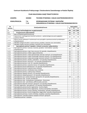 Centrum Kształcenia Praktycznego i Doskonalenia Zawodowego w Rudzie Śląskiej PLAN NAUCZANIA ZAJĘĆ PRAKTYCZNYCH ZAWÓD: 343404 TECHNIK ŻYWIENIA I USŁUG GASTRONOMICZNYCH KWALIFIKACJA: T.6 T.15 SPORZĄDZANIE POTRAW I NAPOJÓW ORGANIZACJA ŻYWIENIA I USŁUG GASTRONOMICZNYCH Nr tematu Dział/poddział/temat 1. Procesy technologiczne w gastronomii 1.1 1.1.1 Przygotowanie półproduktów Bhp w produkcji gastronomicznej Zapoznanie z wymaganiami kontroli sanitarno - epidemiologicznej pod względem systemu HACCP. Mycie naczyń stołowych i kuchennych oraz porządki w pomieszczeniach produkcyjno ekspedycyjnych. Obróbka wstępna brudna i czysta warzyw, grzybów, owoców oraz ziemniaków Obróbka cieplna warzyw, grzybów, owoców oraz ziemniaków Sporządzanie potraw i napojów z różnych surowców i półproduktów Sporządzanie potraw z warzyw, owoców, grzybów i ziemniaków i sposoby ekspediowania. Sporządzanie potraw z mąk i kasz oraz jaj i ich sposoby ekspediowania. Sporządzanie potraw z mleka i jego przetworów. Sporządzanie potraw z mięsa gotowanego zwierząt rzeźnych i ich ekspediowanie. Sporządzanie potraw z mięsa smażonego zwierząt rzeźnych i ich ekspediowanie. Sporządzanie potraw z mięsa pieczonego zwierząt rzeźnych i ich ekspediowanie. Sporządzanie potraw z drobiu, podrobów i ich sposoby ekspediowania. Sporządzanie potraw z dziczyzny i ich sposoby ekspediowania. Sporządzanie potraw z ryb i ich sposoby ekspediowania. Sporządzanie potraw z owoców morza i ich sposoby ekspediowania. Sporządzanie potraw półmięsnych i ich sposoby ekspediowania. Sporządzanie potraw z mięsnej masy mielonej. Sporządzanie potraw z drobiowej masy mielonej. Sporządzanie potraw z rybnej masy mielonej. Sporządzanie zakąsek zimnych i ich sposoby ekspediowania. Sporządzanie zakąsek gorących i ich sposoby ekspediowania. Sporządzanie zup i sosów (zimnych i gorących) i ich sposoby ekspediowania. Sporządzanie ciast - kruche, drożdżowe. Sporządzanie ciast - biszkoptowe, biszkoptowo - tłuszczowe. Sporządzanie ciast - piernikowe, półfrancuskie, parzone. Sporządzanie deserów zimnych i gorących i ich sposoby ekspediowania. Potrawy regionalne- sporządzanie i ich sposoby ekspediowania. Sporządzanie potraw kuchni regionalnej - kuchnia śląska Sporządzanie potraw kuchni regionalnej - kuchnia staropolska, kaszubska. Sporządzanie potraw z kuchni włoskiej, hiszpańskiej i sposoby ekspediowania. Sporządzanie potraw z kuchni bułgarskiej, węgierskiej i sposoby ekspediowania. Sporządzanie potrawy z kuchni chińskiej, rosyjskiej i sposoby ekspediowania. Sporządzanie i sposoby podania napojów zimnych i gorących. Ekspedycja potraw i napojów. 1.1.2 1.1.3 1.1.4 1.1.5 1.2 1.2.1 1.2.2 1.2.3 1.2.4 1.2.5 1.2.6 1.2.5 1.2.6 1.2.7 1.2.8 1.2.9 1.2.10 1.2.11 1.2.12 1.2.13 1.2.14 1.2.15 1.2.16 1.2.17 1.2.18 1.2.19 1.2.20 1.2.21 1.2.22 1.2.23 1.2.24 1.2.25 1.2.26 1.2.27 II Ilość godzin III R 150 115 265 60 10 15 5 75 15 20 10 30 10 - 10 10 10 90 100 10 10 190 10 - 10 10 10 10 10 10 10 10 10 - 5 5 5 5 5 5 5 5 5 5 5 5 5 5 5 5 5 5 5 5 10 10 10 10 10 10 10 5 5 5 5 5 5 5 5 10 5 5 5 5 5 5 5 5 5 5 5 5 2. Planowanie żywienia i produkcji gastronomicznej 10 30 40 2.2 2.2.1 2.2.2 2.2.3 2.3 2.3.1 2.3.2 Planowanie produkcji gastronomicznej Planowanie potraw i napojów dla różnych ofert. Schematy blokowe produkcji potraw, napojów. Schematy blokowe produkcji posiłków. Obliczanie zapotrzebowania surowcowego i cen gastronomicznych Receptury gastronomiczne. Zasady kalkulacji cen potraw i napojów. 0 10 10 - 25 5 5 15 5 5 25 5 5 15 15 10 5 3. Obsługa klientów w gastronomii 20 35 55 3.1 3.1.1 3.1.2 3.1.3 3.2 3.2.1 3.2.2 3.2.3 3.2.4 3.2.5 3.2.6 Planowanie i promocja usług gastronomicznych Zasady planowania ofert usługowych. Promocja w gastronomii. Programy komputerowe wspomagające planowanie usług. Obsługiwanie gości Przygotowanie stanowisk pracy. Bielizna i zastawa stołowa - rodzaje, pielęgnacja i przechowywanie. Metody obsługi gości - metoda francuska i angielska. Metody obsługi gości - metoda niemiecka i rosyjska. Organizacja przyjęć. Przygotowanie sali konsumenckiej do prowadzenia działalności. 0 20 10 10 - 15 5 5 5 20 5 5 5 5 15 5 5 5 40 10 10 5 5 5 5 Razem 180 180 360