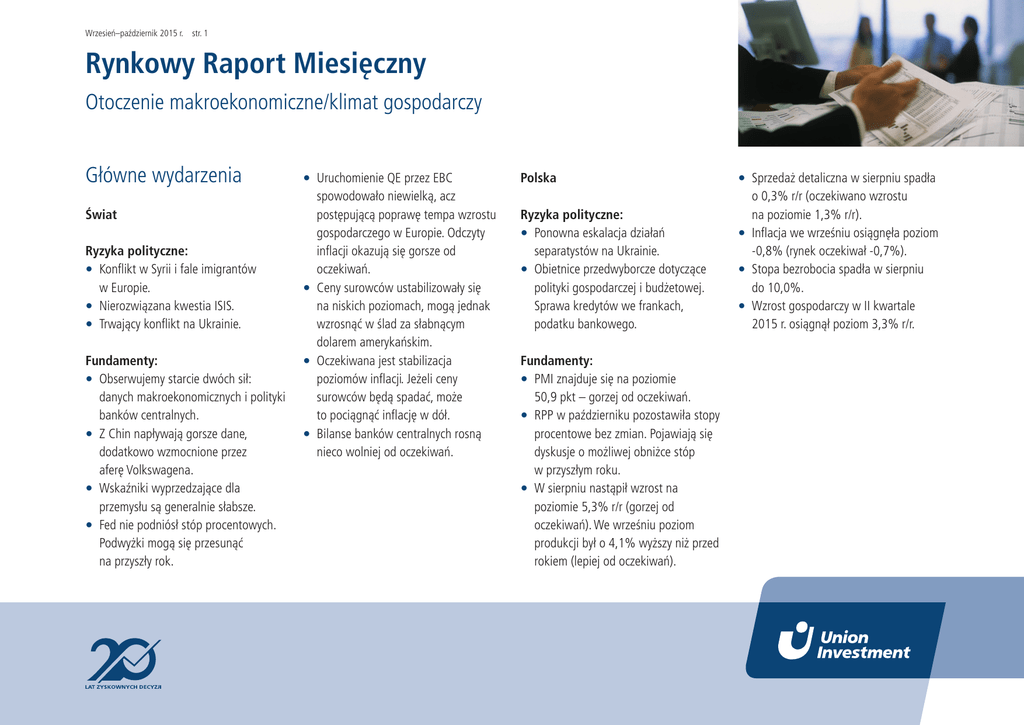 Wrzesień–październik 2015 r. str. 1 Rynkowy Raport Miesięczny Otoczenie makroekonomiczne/klimat gospodarczy Główne wydarzenia Świat Ryzyka polityczne: • Konflikt w Syrii i fale imigrantów w Europie. • Nierozwiązana kwestia ISIS. • Trwający konflikt na Ukrainie. Fundamenty: • Obserwujemy starcie dwóch sił: danych makroekonomicznych i polityki banków centralnych. • Z Chin napływają gorsze dane, dodatkowo wzmocnione przez aferę Volkswagena. • Wskaźniki wyprzedzające dla przemysłu są generalnie słabsze. • Fed nie podniósł stóp procentowych. Podwyżki mogą się przesunąć na przyszły rok. • Uruchomienie QE przez EBC spowodowało niewielką, acz postępującą poprawę tempa wzrostu gospodarczego w Europie. Odczyty inflacji okazują się gorsze od oczekiwań. • Ceny surowców ustabilizowały się na niskich poziomach, mogą jednak wzrosnąć w ślad za słabnącym dolarem amerykańskim. • Oczekiwana jest stabilizacja poziomów inflacji. Jeżeli ceny surowców będą spadać, może to pociągnąć inflację w dół. • Bilanse banków centralnych rosną nieco wolniej od oczekiwań. Polska • Sprzedaż detaliczna w sierpniu spadła Ryzyka polityczne: • Ponowna eskalacja działań separatystów na Ukrainie. • Obietnice przedwyborcze dotyczące polityki gospodarczej i budżetowej. Sprawa kredytów we frankach, podatku bankowego. o 0,3% r/r (oczekiwano wzrostu na poziomie 1,3% r/r). • Inflacja we wrześniu osiągnęła poziom -0,8% (rynek oczekiwał -0,7%). • Stopa bezrobocia spadła w sierpniu do 10,0%. • Wzrost gospodarczy w II kwartale 2015 r. osiągnął poziom 3,3% r/r. Fundamenty: • PMI znajduje się na poziomie 50,9 pkt – gorzej od oczekiwań. • RPP w październiku pozostawiła stopy procentowe bez zmian. Pojawiają się dyskusje o możliwej obniżce stóp w przyszłym roku. • W sierpniu nastąpił wzrost na poziomie 5,3% r/r (gorzej od oczekiwań). We wrześniu poziom produkcji był o 4,1% wyższy niż przed rokiem (lepiej od oczekiwań). Wrzesień–październik 2015 r. str. 2 Rynkowy Raport Miesięczny Otoczenie makroekonomiczne/klimat gospodarczy Sentyment pogorszenie nastrojów wpłynęła afera Volkswagena. • Pogarszają się nastroje analityków dla strefy euro. • Nastroje inwestorów są gorsze od wrześniowych. Europa • W dalszym ciągu pogarszają się nastroje analityków w zakresie sytuacji w Niemczech. • Oprócz czynnika chińskiego na Sentyment w Europie USA • Dalsza nieznaczna poprawa nastrojów w USA. Indeksy Conference Board oraz Michigan Consumer Sentiment znajdują się powyżej poziomów z zeszłego roku. • Nastroje nadal pozostają znacząco lepsze niż w Europie. Sentyment w USA Sentix Conference Board ZEW UE Indeks Michigan -20 ZEW Niemcy -16 -6 4 14 24 Październik Wrzesień Rok wstecz Źródło: Bloomberg, opracowanie własne, dane na dzień 12.10.2015 r. 34 44 20 40 60 80 100 Październik Wrzesień Rok wstecz Źródło: Bloomberg, opracowanie własne, dane na dzień 12.10.2015 r. 120 Wrzesień–październik 2015 r. str. 3 Rynkowy Raport Miesięczny Otoczenie makroekonomiczne/klimat gospodarczy Polityka banków centralnych w skrócie Gdzie powinny być stopy procentowe według reguły Taylora Podstawowe stopy procentowe banków centralnych Turcja, po podwyżkach z zeszłego roku, dokonała kilku obniżek. Pomimo osłabiającej się waluty bank centralny nie podnosi stóp 4,20 2,50 0,10 3,00 3,30 0,00 1,55 0,05 0,50 0,05 0,05 -4,80 -2,25 4 Fed UK Turcja Sie ‘15 Wrz ‘14 Paź ‘13 Lis ‘12 Gru ‘11 Sty ‘11 Mar ‘10 Kwi ‘09 Maj ‘08 Cze ‘07 Lip ‘06 Japonia UK Szwajcaria Reguła Taylora, wrzesień 2015 r. Źródło: Bloomberg, Baseline Taylor Rule Model, opracowanie własne, dane na dzień 21.10.2015 r. Polska Węgry EBC Sie‘05 0 Portugalia Grecja Hiszpania Włochy Francja Niemcy Non-core euro Core-euro Euro Fed EBC obcina stopy do 0,05% 2 -20 Reguła Taylora, styczeń 2015 r. RPP obniża stopy do poziomu 1,5% Paź ‘04 -15 Stopy obecnie Węgry poniżej Polski 10 6 -15,35 -13,65 -9,70 -7,10 -10 12 8 -3,30 -1,50 -5,68 -3,85 -5 0,05 0,05 0,65 0,15 0,05 0,05 0,05 2,81 3,00 0,10 0,05 0,05 -0,55 0 0,25 Stopy procentowe w % 5 2,32 2,86 5,15 5,90 10 Wydłużony okres niskich stóp w gospodarkach rozwiniętych i nie tylko Źródło: Bloomberg, opracowanie własne, dane na dzień 12.10.2015 r. USA – kiedy nastąpi podwyżka stóp procentowych? Wrzesień–październik 2015 r. str. 4 Rynkowy Raport Miesięczny Otoczenie makroekonomiczne/klimat gospodarczy Wartość bilansu POBC (wyrażona zarówno w juanach, jak i w dolarach) spadła W mld USD 6000 Fed mówi o zmniejszaniu skali dodruku pieniądza 5000 12 000 10 000 4000 8000 3000 6000 2000 4000 Projekcja EBC QE i BoJ 1000 2000 Fed BoJ EBC POBC Razem (prawa oś) Razem – tylko EBC (szacunek) BoJ – szacunek EBC QE – szacunek Źródło: Bloomberg, opracowanie własne, dane na dzień 12.10.2015 r. Wrz ‘16 Wrz ‘14 Wrz ‘12 Wrz ‘10 Wrz ‘08 0 Wrz ‘06 0 Wrz ‘04 z zapadających obligacji, jednak inwestuje w instrumenty o krótszych terminach zapadalności. • EBC od marca 2015 r. skupuje papiery za ok. 60 mld euro miesięcznie. Słabsze dane lub turbulencje na rynkach obligacji mogą powodować przyspieszenie tempa interwencji. • Bank Japonii utrzymuje dotychczasową politykę – dalszy wzrost aktywów postępuje zgodnie z projekcją. Bank Japonii zamierza Bilanse banków centralnych Wrz ‘02 • Fed wygasił QE3, reinwestuje środki zwiększać swój bilans o 80 bln jenów rocznie (ok. 68 mld dolarów). Słabe dane makroekonomiczne zwiększają prawdopodobieństwo zwiększenia skali skupu aktywów. • Wartość bilansu Centralnego Banku Chin nadal spada. Wrz ‘00 Bilanse banków centralnych Wrzesień–październik 2015 r. str. 5 Rynkowy Raport Miesięczny Otoczenie makroekonomiczne/klimat gospodarczy Wskaźniki wyprzedzające – PMI dla przemysłu • W Polsce koniunktura w sierpniu się poprawiła, nastąpił 