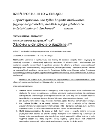 DZIEŃ SPORTU - III LO w ELBLĄGU „ Sport ujawnia nie tylko bogate możliwości fizyczne człowieka, ale także jego zdolności intelektualne i duchowe” Jan Paweł II FESTYN SPORTOWO - REKREACYJNY 00 TERMIN: 27 czerwca 2013 godz. 9 - 1300 Zbiórka przy szkole o godzinie 845 MIEJSCE: Stadion lekkoatletyczny przy szkole, szkolne obiekty sportowe. UCZESTNICY: uczniowie klas I i II IIILO w Elblągu REGULAMIN: Uczniowie i wychowawcy klas tworzą 20 osobowe zespoły, które przystąpią do rywalizacji sportowo - rekreacyjnej wykonując zespołowo 10 różnych prób . Wychowawca jest kapitanem zespołu (swojej klasy) i organizuje uczniów do udziału w próbach sprawnościowych według opisu na karcie startowej. Wygrywa zespół, który najdokładniej i najszybciej wykona zadania na poszczególnych punktach konkursowych. Dodatkowo każda grupa klasowa wyłoni 3-osobową reprezentację( w której znajdzie się przynajmniej jedna dziewczyna ), która weźmie udział w turnieju szachowym! Punktacja od 10 pkt – 1 pkt, w zależności od zajętego miejsca na każdym stanowisku. Suma zdobytych punktów wyłoni drużynę, która zwycięży w festynie. KONKURENCJE FESTYNU 1. Sztafeta Zespół podzielony jest na cztery grupy, które stoją w miejscu zmian sztafetowych na stadionie. Na sygnał prowadzącego, sędziego, uczniowie kolejno zmieniając się przekazując sobie pałeczkę sztafetową po przebiegnięciu odcinka ok. 70m. Bieg trwa 5 okrążeń stadionu. Zespół kolejno zmieniając się musi dokonać 18 zmian wówczas pokona dystans 1 mili (ok. 1650m).Start i koniec biegu mieści się na mecie. Sędzia dokonuje pomiaru czasu wyścigu. 2. Kto szybszy (boisko LA za metą). Kolejno każdy uczeń podejmuje próbę złapania przyboru(kijka) wypuszczonego i wyskalowanego od 10 – 1pkt przez sędziego. Suma punktów uzyskanych przez uczniów to wynik całego zespołu. Sędzia potwierdza wynik. 3. Skoki dodawane(rozbieg do skoku w dal). Każdy uczeń z zespołu kolejno wykonuje pojedynczy skok obunóż do przodu (żabką). Następny uczeń ustawia się z prawego lub lewego boku poprzednika tak, aby pięty były na jednej wysokości i oddaje skok do przodu. Wygrywa zespół ten, który wspólnie skoczy najdalej. Sędzia czuwa nad właściwym przebiegiem konkurencji i odnotowuje wynik zespołu (rozbieg do skoku w dal). 4. Zawiąż i rozwiąż (trybuna vis a vis szkoły). Każdy uczeń zespołu wiąże ósemkę żeglarską i rozwiązuje ją przekazując sznur koledze/koleżance. Sędzia dokonuje pomiaru czasu pracy całego zespołu i określa wynik w sekundach. 5. Bomba w górę( zewnętrzne boisko do siatkówki). Uczniowie kolejno podchodzą do 3 kg piłki lekarskiej i wyrzucają ją w górę. Sędzia dokonuje pomiaru czasu pionowego lotu piłki od momentu, gdy piłka opuści dłonie miotacza, do upadku piłki na ziemię. Suma wszystkich czasów to wynik zespołu w tej próbie. 6. Do celu (golf - boisko LA przy kuli) . Kolejno każdy uczeń próbuje z odległości 5m(8 kroków) trafić do wiaderka, podrzucając kijem piłkę do unihocke’a, a następnie uderza kijem golfowym piłkę do dołka Każde trafienie to 1pkt. Sędzia liczy trafienia i sumuje wynik, który jest osiągnięciem zespołu. 7. Wyciskanie (siłownia). Każdy kolejno podaje ciężar który wyciska leżąc na ławeczce. Dziewczęta wykonują wyciskanie na ergometrze a chłopcy na stanowisku z gryfem. Wynik to suma wyciśniętych kilogramów przez zespół. Jest jedna próba a sędzia decyduje o zaliczeniu uniesienia ciężaru. 8. Rzut do kosza(sala gimnastyczna) Zespół wykonuje serię rzutów osobistych do kosza. Każde celne trafienie to 1pkt. Sędzia sumuje punkty i określa wynik zespołu. 9. Tenis stołowy(mała sala gimnastyczna). Kapitan dzieli zespół na dwie równe grupy, które ustawiają się w szeregu po przeciwnych stronach stołu do gry. Pierwsze trzy osoby stoją po każdej stronie trzymając rakiety. Na sygnał grupy odbijają piłeczkę do siebie i po każdym odbiciu zmieniają się, przekazując rakietę kolejnej osobie oczekującej na odbicie. Sędzia dokonuje pomiaru 1 minuty i liczy ilość odbić piłeczki. Jeżeli piłka zostanie źle podana, spadnie podczas liczonego czasu, to należy kontynuować próbę, podając piłeczkę. Sędzia liczy ilość podań a ich suma określa wynik zespołu. 10. Tor przeszkód (sala gimnastyczna). Tor przeszkód z kozłowaniem piłki koszykowej uczniowie z zespołu pokonują kolejno biegnąc w dwie strony. Start kolejnej osoby do wyścigu odbywa się po przekazaniu piłki koszykowej. Sędzia dokonuje pomiaru czasu pokonania toru przeszkód przez wszystkich uczniów i zapisuje wynik w sekundach. 11. Turniej szachowy (czytelnia 303) 12. Rocznikowa rywalizacja w grach sportowych. Reprezentacje klas pierwszych zmierzą się z reprezentacjami klas drugich w: Chłopcy – halowa piłka nożna (duża sala gimnastyczna) Dziewczęta- siatkówka(mała sala gimnastyczna) Postanowienia końcowe. 1. Wszystkich obowiązuje strój sportowo-rekreacyjny. 2. Do każdej konkurencji kapitan - wychowawca wybiera 20 osób spośród uczniów swojej klasy. Jeżeli chłopców jest mniej niż 10-ciu to mogą oni przystąpić do próby więcej razy. 3. Przydział sędziów do konkurencji zostanie podany w osobnym komunikacie. 4. W przypadku uzyskania przez zespoły takiej samej liczby punktów o kolejności będzie decydował czas biegu sztafetowego. UWAGA!!! Wziąć ze sobą dobry humor!!! SĘDZIOWIE KONKURENCJI SPORTOWO – REKREACYJNYCH 1. Arkadiusz Jan Anna Małgorzata 2. Piotr Trochimczuk Pankowski Tokarewicz Karmasz Pietruczuk - konkurencja nr 1 - konkurencja nr 1 - konkurencja nr 1 - konkurencja nr 1 – konkurencja nr 2 3. Aleksandra Trochimczuk - konkurencja nr 3 4. Dorota Zakrzewska - konkurencja nr 4 5. Halina Rymkiewicz - konkurencja nr 5 6. Tomasz Stężała - konkurencja nr 6 7. Waldemar Maciesza - konkurencja nr 7 8. Ewa Romanowska - konkurencja nr 8 9. Iwona Stando - konkurencja nr 9 
