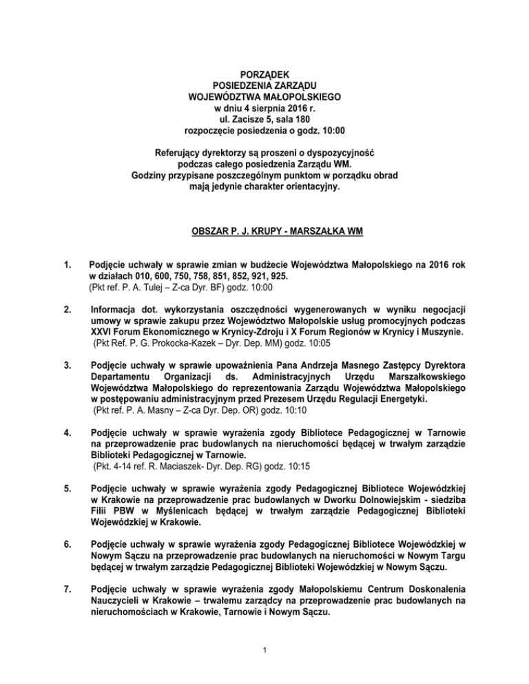 PORZĄDEK POSIEDZENIA ZARZĄDU WOJEWÓDZTWA MAŁOPOLSKIEGO w dniu 4 sierpnia 2016 r. ul. Zacisze 5, sala 180 rozpoczęcie posiedzenia o godz. 10:00 Referujący dyrektorzy są proszeni o dyspozycyjność podczas całego posiedzenia Zarządu WM. Godziny przypisane poszczególnym punktom w porządku obrad mają jedynie charakter orientacyjny. OBSZAR P. J. KRUPY - MARSZAŁKA WM 1. Podjęcie uchwały w sprawie zmian w budżecie Województwa Małopolskiego na 2016 rok w działach 010, 600, 750, 758, 851, 852, 921, 925. (Pkt ref. P. A. Tulej – Z-ca Dyr. BF) godz. 10:00 2. Informacja dot. wykorzystania oszczędności wygenerowanych w wyniku negocjacji umowy w sprawie zakupu przez Województwo Małopolskie usług promocyjnych podczas XXVI Forum Ekonomicznego w Krynicy-Zdroju i X Forum Regionów w Krynicy i Muszynie. (Pkt Ref. P. G. Prokocka-Kazek – Dyr. Dep. MM) godz. 10:05 3. Podjęcie uchwały w sprawie upoważnienia Pana Andrzeja Masnego Zastępcy Dyrektora Departamentu Organizacji ds. Administracyjnych Urzędu Marszałkowskiego Województwa Małopolskiego do reprezentowania Zarządu Województwa Małopolskiego w postępowaniu administracyjnym przed Prezesem Urzędu Regulacji Energetyki. (Pkt ref. P. A. Masny – Z-ca Dyr. Dep. OR) godz. 10:10 4. Podjęcie uchwały w sprawie wyrażenia zgody Bibliotece Pedagogicznej w Tarnowie na przeprowadzenie prac budowlanych na nieruchomości będącej w trwałym zarządzie Biblioteki Pedagogicznej w Tarnowie. (Pkt. 4-14 ref. R. Maciaszek- Dyr. Dep. RG) godz. 10:15 5. Podjęcie uchwały w sprawie wyrażenia zgody Pedagogicznej Bibliotece Wojewódzkiej w Krakowie na przeprowadzenie prac budowlanych w Dworku Dolnowiejskim - siedziba Filii PBW w Myślenicach będącej w trwałym zarządzie Pedagogicznej Biblioteki Wojewódzkiej w Krakowie. 6. Podjęcie uchwały w sprawie wyrażenia zgody Pedagogicznej Bibliotece Wojewódzkiej w Nowym Sączu na przeprowadzenie prac budowlanych na nieruchomości w Nowym Targu będącej w trwałym zarządzie Pedagogicznej Biblioteki Wojewódzkiej w Nowym Sączu. 7. Podjęcie uchwały w sprawie wyrażenia zgody Małopolskiemu Centrum Doskonalenia Nauczycieli w Krakowie – trwałemu zarządcy na przeprowadzenie prac budowlanych na nieruchomościach w Krakowie, Tarnowie i Nowym Sączu. 1 8. Podjęcie uchwały w sprawie wyrażenia zgody Muzeum Tatrzańskiemu im. dra T. Chałubińskiego w Zakopanem na nieodpłatne rozporządzenie mieniem stanowiącym własność Województwa Małopolskiego. 9. Podjęcie uchwały w sprawie opinii do „Projektu założeń do planu zaopatrzenia w ciepło, energię elektryczną i paliwa gazowe dla gminy Łabowa na lata 2016-2030” 10. Podjęcie uchwały w sprawie opinii do „Projektu założeń do planu zaopatrzenia w ciepło, energię elektryczną i paliwa gazowe dla gminy Lubień na lata 2016-2030”. 11. Podjęcie uchwały w sprawie podpisania porozumienia dotyczącego zasad współdziałania pomiędzy Województwem Małopolskim a Urzędem Patentowym RP przy organizacji sympozjum „Własność przemysłowa w innowacyjnej gospodarce”. 12. Informacja w sprawie wprowadzenia zmian w Małopolskim Planie Inwestycyjnym na lata 2015-2023 w zakresie projektu konkursowego „Business in Małopolska – Support and development for your company”, w ramach Poddziałania 3.3.1 Promocja gospodarcza Małopolski RPO WM 2014-2020. 13. Informacja w sprawie wprowadzenia zmian w Małopolskim Planie Inwestycyjnym na lata 2015-2023 w zakresie projektu konkursowego „Małopolski Festiwal Innowacji” w ramach Poddziałania 3.3.1 Promocja gospodarcza Małopolski RPO WM 2014-2020. 14. Informacja w sprawie oceny celowości realizacji zadania publicznego pn. „Doświadczeni w biznesie. Małopolska platforma samorządów gospodarczych” w trybie art. 19a ustawy o działalności pożytku publicznego i wolontariacie. 15. Podjęcie uchwały w sprawie zawarcia z Przewozy Regionalne Sp. z o.o. aneksu nr 2 do umowy o świadczenie usług w zakresie publicznego transportu zbiorowego w transporcie kolejowym na terenie województwa małopolskiego. (Pkt.15-19 ref. P. G. Sapoń – Dyr. Dep. TK) godz. 10:20 OBSZAR P. L. ZEGZDY – CZŁONKA ZWM 16. Podjęcie uchwały w sprawie zmiany uchwały nr 1067/05 Zarządu Województwa Małopolskiego z dnia 13 października 2005 r. w sprawie nadania numerów dla dróg gminnych na obszarze powiatu wielickiego w Województwie Małopolskim. 17. Podjęcie uchwały w sprawie zmiany uchwały nr 1078/05 Zarządu Województwa Małopolskiego z dnia 13 października 2005 r. w sprawie nadania numerów dla dróg gminnych na obszarze powiatu oświęcimskiego w Województwie Małopolskim. 18. Podjęcie uchwały w sprawie zmiany uchwały nr 1070/05 Zarządu Województwa Małopolskiego z dnia 13 października 2005 r. w sprawie nadania numerów dla dróg gminnych na obszarze powiatu brzeskiego w Województwie Małopolskim. 2 19. Podjęcie uchwały w sprawie zmiany uchwały nr 1074/05 Zarządu Województwa Małopolskiego z dnia 13 października 2005 r. w sprawie nadania numerów dla dróg gminnych na obszarze powiatu tarnowskiego w Województwie Małopolskim. OBSZAR P. S. SORYSA - WICEMARSZAŁKA WM 20. Podjęcie uchwały w sprawie zatwierdzenia wykazów projektów subregionalnych w ramach poddziałania 6.1.4 Lokalne trasy turystyczne - SPR (Pkt. 20-22 ref. J. Szymański ZPO ) godz. 10:30 21. Podjęcie uchwały w sprawie identyfikacji projektu pn. Wirtualna Małopolska planowanego do realizacji w trybie pozakonkursowym w ramach Poddziałania 2.1.2 Cyfrowe zasoby regionalne Działania 2.1 E-administracja i otwarte zasoby 2 Oś Priorytetowa Cyfrowa Małopolska Regionalnego Programu Operacyjnego Województwa Małopolskiego na lata 2014-2020. 22. Podjęcie uchwały w sprawie zawarcia z Ministrem Rozwoju aneksu nr 3 do Umowy dotacji dotyczącej projektu Pomocy Technicznej nr DIP/BDG-II/POPT/105/14 z dnia 3 lipca 2014 roku. OBSZAR P. L. ZEGZDY – CZŁONKA ZWM 23. Podjęcie uchwały w sprawie zawarcia aneksu nr 