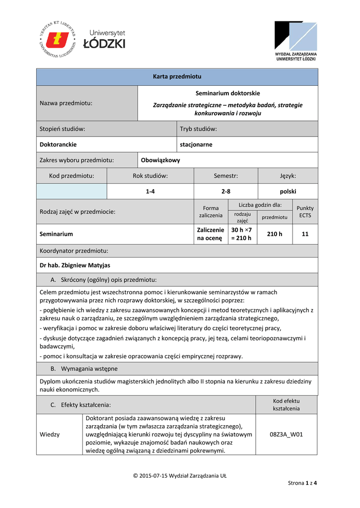 Karta przedmiotu Seminarium doktorskie Nazwa przedmiotu: Zarządzanie strategiczne – metodyka badań, strategie konkurowania i rozwoju Stopień studiów: Tryb studiów: Doktoranckie stacjonarne Zakres wyboru przedmiotu: Kod przedmiotu: Obowiązkowy Rok studiów: Semestr: Język: 1-4 2-8 polski Forma zaliczenia Rodzaj zajęć w przedmiocie: Zaliczenie na ocenę Seminarium Liczba godzin dla: rodzaju zajęć przedmiotu Punkty ECTS 30 h ×7 = 210 h 210 h 11 Koordynator przedmiotu: Dr hab. Zbigniew Matyjas A. Skrócony (ogólny) opis przedmiotu: Celem przedmiotu jest wszechstronna pomoc i kierunkowanie seminarzystów w ramach przygotowywania przez nich rozprawy doktorskiej, w szczególności poprzez: - pogłębienie ich wiedzy z zakresu zaawansowanych koncepcji i metod teoretycznych i aplikacyjnych z zakresu nauk o zarządzaniu, ze szczególnym uwzględnieniem zarządzania strategicznego, - weryfikacja i pomoc w zakresie doboru właściwej literatury do części teoretycznej pracy, - dyskusje dotyczące zagadnień związanych z koncepcją pracy, jej tezą, celami teoriopoznawczymi i badawczymi, - pomoc i konsultacja w zakresie opracowania części empirycznej rozprawy. B. Wymagania wstępne Dyplom ukończenia studiów magisterskich jednolitych albo II stopnia na kierunku z zakresu dziedziny nauki ekonomicznych. Kod efektu kształcenia C. Efekty kształcenia: Wiedzy Doktorant posiada zaawansowaną wiedzę z zakresu zarządzania (w tym zwłaszcza zarządzania strategicznego), uwzględniającą kierunki rozwoju tej dyscypliny na światowym poziomie, wykazuje znajomość badań naukowych oraz wiedzę ogólną związaną z dziedzinami pokrewnymi. 08Z3A_W01 © 2015-07-15 Wydział Zarządzania UŁ Strona 1 z 4 Umiejętności Kompetencji społecznych (postaw) Doktorant posiada wiedzę o charakterze szczegółowym związaną z obszarem prowadzonych badań naukowych, w tym wiedzę o najnowszych osiągnięciach naukowych w wybranym przez siebie obszarze badań oraz szczegółową specjalistyczną wiedzę umożliwiającą tworzenie nowych rozwiązań w teorii i praktyce. Doktorant posiada wiedzę dotyczącą metodyki prowadzonych badań naukowych, zasad prowadzenia prac badawczych, przygotowania publikacji, opracowania i przetwarzania wyników badań oraz wiedzę o zasadach wykorzystania badań naukowych w praktyce. Doktorant potrafi umiejętnie wykorzystać posiadaną wiedzę do krytycznej oceny wyników badań. Doktorant potrafi rozwiązać problemy występujące w obszarze nauk o zarządzaniu, wykorzystując posiadaną wiedzę i wyniki prac badawczych o charakterze praktycznym. Doktorant posiada umiejętność prezentacji w publikacjach i dyskusjach naukowych wyników badań indywidualnych i zespołowych. Doktorant posiada umiejętność pracy w zespołach badawczych oraz kierowania takimi zespołami. Doktorant odczuwa potrzebę poszerzenia swoich kompetencji poprzez ciągłe zapoznawanie się z najnowszymi osiągnięciami naukowymi w obszarze badań, z którymi jest związany. Doktorant zachowuje się w sposób odpowiedzialny i etyczny oraz potrafi egzekwować takie postawy wśród współpracowników. Doktorant wykazuje kreatywność oraz otwartość na nowe idee i koncepcje w poszukiwaniu nowych obszarów badań. D. Treści kształcenia (tematy/zagadnienia zajęć): 08Z3A_W02 08Z3A_W03 08Z3A_U02 08Z3A_U05 08Z3A_U06 08Z3A_K01 08Z3A_K02 08Z3A_K03 08Z3A_K04 L.g. dydaktycznych Rok I, Semestr 2 1. Przedstawienie wymagań i warunków zaliczenia seminarium w poszczególnych latach i semestrach. 2. Omówienie ogólnych zasad pisania artykułu naukowego i rozprawy doktorskiej, prowadzenia badań literaturowych i empirycznych. 3. Współczesne kierunki rozwoju dyscypliny zarządzanie strategiczne – zarys 30 problematyki. 4. Prezentacja zainteresowań badawczych przez doktorantów - szkic problemu badawczego do pracy doktorskiej. 5. Sformułowanie tematu i głównego celu pracy doktorskiej przez doktorantów. 6. Przedstawienie koncepcji pracy doktorskiej oraz wykazu podstawowych pozycji literatury. © 2015-07-15 Wydział Zarządzania UŁ Strona 2 z 4 Rok II, Semestr 3-4 1. Prezentowanie przez seminarzystów wstępnych planów rozpraw doktorskich. 2. Dyskusje na temat głównego i szczegółowych celów oraz tez rozpraw doktorskich poszczególnych doktorantów. 60 3. Sformułowanie przez doktorantów hipotez badawczych. 4. Dyskusja w zakresie planowanych metod prowadzenia badań empirycznych. 5. Prezentacja przez doktorantów treści pierwszego rozdziału pracy doktorskiej. Rok III, Semestr 5-6 1. Raport na temat międzynarodowego rozwoju zarządzania strategicznego w obszarach analogicznych do problematyki podejmowanej przez poszczególnych doktorantów - dyskusja. 2. Dyskusja na temat przygotowywanych artykułów naukowych i referatów konferencyjnych. 60 3. Prezentowanie przez doktorantów części teoretycznych prac doktorskich wraz z dyskusją. 4. Szczegółowy plan badań empirycznych dla realizacji celów rozprawy. 5. Dyskusja i weryfikacja przedstawionych metodyk prowadzenia badań empirycznych. Rok IV, Semestr 7-8 1. Dyskusja w zakresie najnowszych kierunków rozwojowych zarządzania strategicznego w kontekście przygotowywanych rozpraw doktorskich. 2. Raporty z badań empirycznych prowadzonych przez doktorantów - dyskusja w zakresie ewentualnych problemów i sposobów ich rozwiązania. 60 3. Prezentowanie przez doktorantów części empirycznych prac doktorskich. 4. Opracowanie i weryfikacja wstępu i zakończenia rozprawy doktorskiej. 5. Przygotowanie i prezentacja autoreferatu rozprawy doktorskiej na zebraniu katedry/zakładu. E. Metody i kryteria oceniania (algorytm obliczania oceny końcowej z przedmiotu): Kryteria oceniania: - zaangażowanie seminarzysty w wybór tematyki rozprawy doktorskiej, - postęp w sformułowaniu celów i podstawowej tezy pracy oraz w opracowaniu wstępnego planu (struktury) rozprawy, - postęp w doprecyzowaniu celów (głównego i szczegółowych) i hipotez badawczy