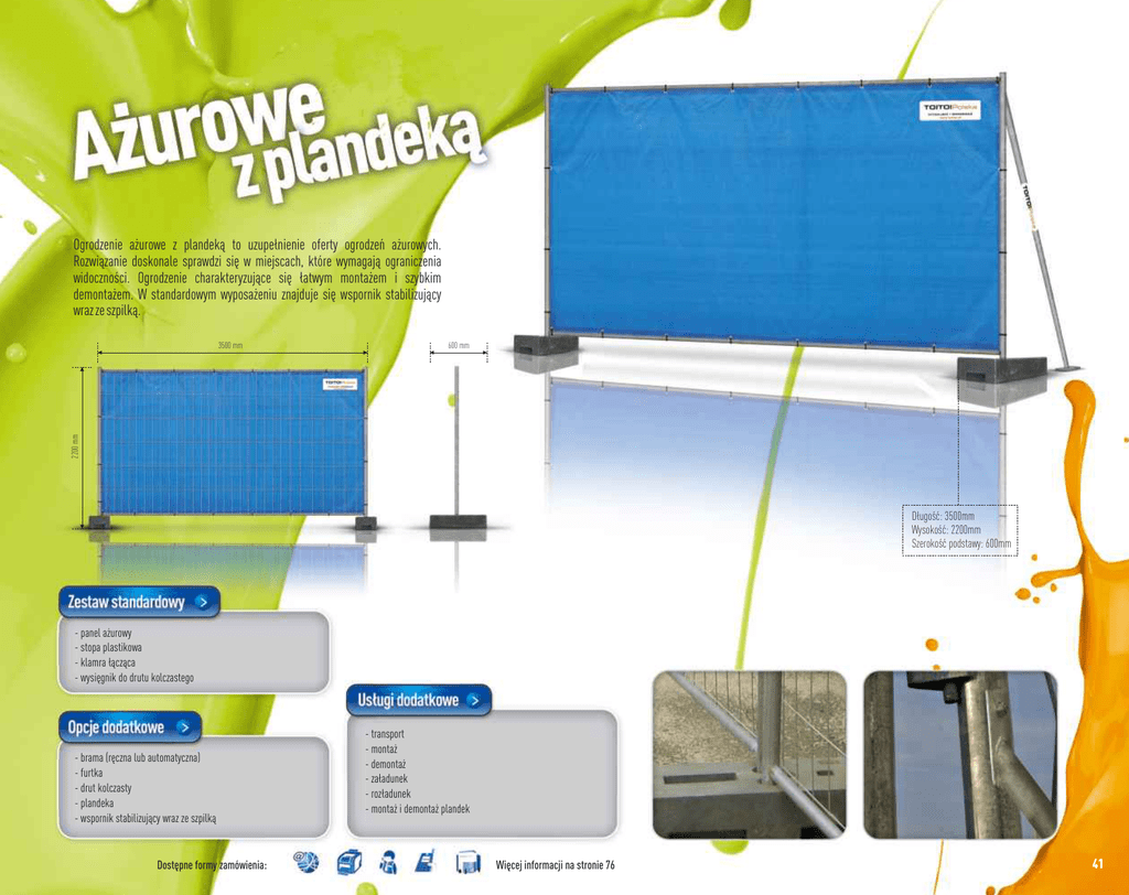 Ogrodzenie ażurowe z plandeką to uzupełnienie oferty ogrodzeń ażurowych. Rozwiązanie doskonale sprawdzi się w miejscach, które wymagają ograniczenia widoczności. Ogrodzenie charakteryzujące się łatwym montażem i szybkim demontażem. W standardowym wyposażeniu znajduje się wspornik stabilizujący wraz ze szpilką. 600 mm 2200 mm 3500 mm Długość: 3500mm Wysokość: 2200mm Szerokość podstawy: 600mm - panel ażurowy - stopa plastikowa - klamra łącząca - wysięgnik do drutu kolczastego - brama (ręczna lub automatyczna) - furtka - drut kolczasty - plandeka - wspornik stabilizujący wraz ze szpilką Dostępne formy zamówienia: - transport - montaż - demontaż - załadunek - rozładunek - montaż i demontaż plandek Więcej informacji na stronie 76 41