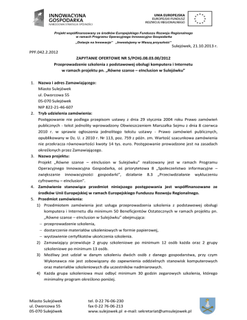 Projekt współfinansowany ze środków Europejskiego Funduszu Rozwoju Regionalnego w ramach Programu Operacyjnego Innowacyjna Gospodarka „Dotacje na Innowacje” „Inwestujemy w Waszą przyszłość” Sulejówek, 21.10.2013 r. PPF.042.2.2012 ZAPYTANIE OFERTOWE NR 5/POIG.08.03.00/2012 Przeprowadzenie szkolenia z podstawowej obsługi komputera i Internetu w ramach projektu pn. „Równe szanse – eInclusion w Sulejówku” 1. Nazwa i adres Zamawiającego: Miasto Sulejówek ul. Dworcowa 55 05-070 Sulejówek NIP 822-21-46-607 2. Tryb udzielenia zamówienia: Postępowanie nie podlega przepisom ustawy z dnia 29 stycznia 2004 roku Prawo zamówień publicznych - tekst jednolity wprowadzony Obwieszczeniem Marszałka Sejmu z dnia 8 czerwca 2010 r. w sprawie ogłoszenia jednolitego tekstu ustawy - Prawo zamówień publicznych, opublikowany w Dz. U. z 2010 r. Nr 113, poz. 759 z późn. zm. Wartość szacunkowa zamówienia nie przekracza równowartości kwoty 14 tys. euro. Postępowanie prowadzone jest na zasadach określonych przez Zamawiającego. 3. Nazwa projektu: Projekt „Równe szanse – eInclusion w Sulejówku” realizowany jest w ramach Programu Operacyjnego Innowacyjna Gospodarka, oś priorytetowa 8 „Społeczeństwo informacyjne – zwiększanie innowacyjności gospodarki”, działanie 8.3 „Przeciwdziałanie wykluczeniu cyfrowemu – eInclusion”. 4. Zamówienie stanowiące przedmiot niniejszego postępowania jest współfinansowane ze środków Unii Europejskiej w ramach Europejskiego Funduszu Rozwoju Regionalnego. 5. Przedmiot zamówienia: 1) Przedmiotem zamówienia jest usługa przeprowadzenia szkolenia z podstawowej obsługi komputera i Internetu dla minimum 50 Beneficjentów Ostatecznych w ramach projektu pn. „Równe szanse – eInclusion w Sulejówku” obejmująca: przeprowadzenie szkolenia, dostarczenie materiałów szkoleniowych w formie papierowej, wystawienie certyfikatów ukończenia szkolenia. 2) Zamawiający przewiduje 2 grupy szkoleniowe po minimum 12 osób każda oraz 2 grupy szkoleniowe po minimum 13 osób. 3) Możliwy jest udział w danym szkoleniu dwóch osób z danego gospodarstwa, przy czym Wykonawca nie jest zobowiązany do zapewnienia oddzielnych stanowisk komputerowych oraz materiałów szkoleniowych dla uczestników nadmiarowych. 4) Każda grupa szkoleniowa musi odbyć minimum 30 godzin zegarowych szkolenia, którego minimalny program określono poniżej. Miasto Sulejówek ul. Dworcowa 55 05-070 Sulejówek tel. 0-22 76-06-230 fax 0-22 76-06-213 www.sulejowek.pl e-mail: [email protected] 5) Godzina zegarowa szkolenia liczy 60 minut i obejmuje zajęcia liczące 45 minut oraz przerwę liczącą 15 minut. 6) Szkolenia odbywać się będą w dni robocze od poniedziałku do piątku w przedziale czasowym 17:00 – 20:00 i w soboty w przedziale czasowym 09:00 – 15:00. 7) Dokładny harmonogram przeprowadzenia szkolenia zostanie ustalony przez Zamawiającego i Wykonawcę po podpisaniu umowy. 8) Szkolenie należy przeprowadzić w sposób uwzględniający zróżnicowany stopień zaawansowania, dostosowany do indywidualnych potrzeb i możliwości Uczestników. 9) Wykonawca zobowiązuje się przed pierwszymi zajęciami przeprowadzić ankietę początkową dla uczestników, określającą poziom umiejętności komputerowych. Na podstawie ankiet oraz rozmów indywidualnych Wykonawca zobowiązany jest do przyporządkowania uczestników do odpowiedniej grupy zgodnie z poziomem zaawansowania. 10) Szkolenia będą prowadzone w języku polskim. Każde zajęcia powinny zawierać część teoretyczną oraz część praktyczną (praca przy komputerach). 11) Do dyspozycji Wykonawcy zostaną oddane 2 sale komputerowe wyposażone w sprzęt komputerowy. 12) Wymagane jest, aby stanowisko osób prowadzących szkolenie wyposażone było w komputer oraz rzutnik umożliwiając tym samym prezentację materiału dydaktycznego uczestnikom szkolenia. 13) Każdy uczestnik szkolenia na pierwszych zajęciach musi otrzymać program szkolenia, bezzwrotne materiały piśmiennicze (notes i długopis) oraz materiały szkoleniowe w wersji papierowej w formacie A4. 14) Zamawiający wymaga, aby na każdych zajęciach sprawdzane były listy obecności, na których uczestnicy składać będą podpisy. Listy będą przechowywane przez Wykonawcę. 15) Zamawiający wymaga, aby na ostatnich zajęciach Wykonawca przeprowadził wśród uczestników ankietę końcową pozwalającą na weryfikację zdobytej wiedzy oraz sprawdzenie poziomu zadowolenia z zajęć. 16) Wykonawca zobowiązany jest do wystawienia każdemu z uczestników imiennego certyfikatu potwierdzającego ukończenie szkolenia. Uczestnicy za potwierdzeniem odbioru powinni otrzymać certyfikaty na ostatnich zajęciach. 17) Wykonawca jest zobowiązany do oznakowania wszystkich materiałów dydaktycznych, list obecności, certyfikatów potwierdzających ukończenie szkolenia, ankiet oraz innych materiałów związanych ze szkoleniem, zgodnie z zaleceniami zawartymi w Przewodniku w zakresie promocji projektów finansowanych w ramach Programu Operacyjnego Innowacyjna Gospodarka 2007-2013 dla beneficjentów i instytucji zaangażowanych we wdrażanie Programu opracowanym przez Instytucję Zarządzającą oraz opublikowanym na stronie internetowej www.poig.gov.pl. 18) Wykonawca musi dysponować wykwalifikowaną kadrą do przeprowadzenia szkolenia oraz musi posiadać niezbędną wiedzę techniczną do przeprowadzenia szkoleń i doświadczenie zawodowe w prowadzeniu szkoleń informatycznych o podobnym zakresie. Osoby skierowane do prowadzenia szkoleń muszą posiadać wykształcenie wyższe informatyczne. 19) Wykonawca wykaże, że w okresie ostatnich 3 lat przed upływem terminu składania oferty (a jeżeli okres prowadzenia działalności jest krótszy – w tym okresie) wykonywał co najmniej 2 usługi polegające na przeprowadzeniu szkoleń w zakresie tożsamym z tematyką szkolenia. Wykonawca zobowiązany jest do przedstawienia dokumentu potwier