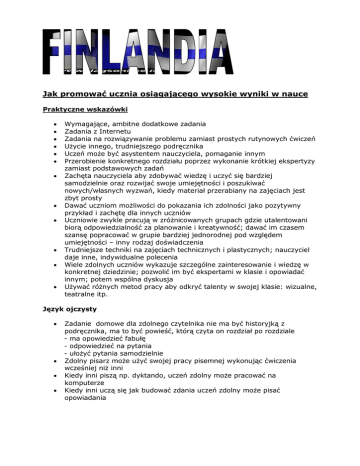 Jak promować ucznia osiągającego wysokie wyniki w nauce Praktyczne wskazówki • • • • • • • • • • • • Wymagające, ambitne dodatkowe zadania Zadania z Internetu Zadania na rozwiązywanie problemu zamiast prostych rutynowych ćwiczeń Użycie innego, trudniejszego podręcznika Uczeń może być asystentem nauczyciela, pomaganie innym Przerobienie konkretnego rozdziału poprzez wykonanie krótkiej ekspertyzy zamiast podstawowych zadań Zachęta nauczyciela aby zdobywać wiedzę i uczyć się bardziej samodzielnie oraz rozwijać swoje umiejętności i poszukiwać nowych/własnych wyzwań, kiedy materiał przerabiany na zajęciach jest zbyt prosty Dawać uczniom możliwości do pokazania ich zdolności jako pozytywny przykład i zachętę dla innych uczniów Uczniowie zwykle pracują w zróżnicowanych grupach gdzie utalentowani biorą odpowiedzialność za planowanie i kreatywność; dawać im czasem szansę popracować w grupie bardziej jednorodnej pod względem umiejętności – inny rodzaj doświadczenia Trudniejsze techniki na zajęciach technicznych i plastycznych; nauczyciel daje inne, indywidualne polecenia Wiele zdolnych uczniów wykazuje szczególne zainteresowanie i wiedzę w konkretnej dziedzinie; pozwolić im być ekspertami w klasie i opowiadać innym; potem wspólna dyskusja Używać różnych metod pracy aby odkryć talenty w swojej klasie: wizualne, teatralne itp. Język ojczysty • • • • Zadanie domowe dla zdolnego czytelnika nie ma być historyjką z podręcznika, ma to być powieść, którą czyta on rozdział po rozdziale - ma opowiedzieć fabułę - odpowiedzieć na pytania - ułożyć pytania samodzielnie Zdolny pisarz może użyć swojej pracy pisemnej wykonując ćwiczenia wcześniej niż inni Kiedy inni piszą np. dyktando, uczeń zdolny może pracować na komputerze Kiedy inni uczą się jak budować zdania uczeń zdolny może pisać opowiadania Matematyka • • • Uczeń zdolny robi postępy w swoim tempie; po skończeniu rocznego programu może zająć się działem którym się interesuje (mnożenie, geometria, sudoku itp.) Jeżeli dwie czwarte klasy mają matematykę w tym samym czasie, podzielić uczniów na trzy różne grupy (2 nauczycieli + jeden pedagog); jeden z nauczycieli pracuje z uczniami zdolnymi Uczeń zdolny może wymyślić zadania dla innych uczniów Języki obce • • • • • • • • • • Kiedy inni powtarzają gramatykę uczniowie zdolni mogą napisać krótkie opowiadania używając struktur o których mowa Rozumienie tekstu – inne teksty albo te same teksty ale inne pytania Rozumienie ze słuchu – trudniejsze pytania; jakbyś zakończył historyjkę – napisz w zeszycie Testy sprawdzające znajomość słownictwa – wyjaśnij znaczenie opisowo zamiast w języku ojczystym Zadania które pokazują rzeczywiste umiejętności ucznia, np. różne rodzaje prac projektowych (plakaty, wiersze, opowiadania); mogą być przygotowane w domu Tłumaczenie nauczyciela/ucznia podczas lekcji Dwóch zdolniejszych uczniów pracuje razem – mogą więcej mówić w języku obcym w trakcie lekcji i wykazać się kreatywnością w zadaniach interaktywnych (konwersacje, gry itp.) Mała biblioteczka w sali językowej – uczniowie mogą pożyczać książki (easy readers), magazyny i komiksy Z podanych słów utworzyć dłuższe niż pozostali zdania np. zdania celu lub napisać krótka historyjkę „brain teasers”: skomplikowane zdania do tłumaczenia