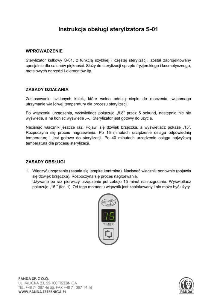 Instrukcja obsługi sterylizatora S-01 WPROWADZENIE Sterylizator kulkowy S-01, z funkcją szybkiej i częstej sterylizacji, został zaprojektowany specjalnie dla salonów piękności. Służy do sterylizacji sprzętu fryzjerskiego i kosmetycznego, metalowych narzędzi i elementów itp. ZASADY DZIAŁANIA Zastosowanie szklanych kulek, które wolno oddają ciepło do otoczenia, wspomaga utrzymanie właściwej temperatury dla procesu sterylizacji. Po włączeniu urządzenia, wyświetlacz pokazuje „8.8” przez 5 sekund, następnie nic nie wyświetla, a na koniec wyświetla „--„. Sterylizator jest gotowy do użycia. Nacisnąć włącznik jeszcze raz. Pojawi się dźwięk brzęczka, a wyświetlacz pokaże „15”. Rozpoczyna się proces nagrzewania. Po 15 minutach urządzenie osiąga odpowiednią temperaturę i jest gotowe do sterylizacji. Po 40 minutach urządzenie osiąga najwyższą temperaturą dla procesu sterylizacji. ZASADY OBSŁUGI 1. Włączyć urządzenie (zapala się lampka kontrolna). Nacisnąć włącznik ponownie (pojawia się dźwięk brzęczka). Rozpoczyna się proces nagrzewania. Używane po raz pierwszy urządzenie potrzebuje 15 minut na rozgrzanie. Wyświetlacz pokazuje „15.” (fot. 1). Od tego momentu włącznik jest zablokowany i nie może być użyty. 2. Po nagrzaniu urządzenie jest gotowe do sterylizacji (trójkrotnie pojawia się dźwięk brzeczka). Wyświetlacz pokazuje „00” (fot. 2). Nacisnąć włącznik w celu rozpoczęcia sterylizacji. Jednorazowo, urządzenie potrzebuje 20 sekund na sterylizację. Po zakończeniu procesu trójkrotnie pojawia się dźwięk brzeczka. Sterylizator jest gotowy do ponownego użycia i powtórnie wyświetla „00” (fot. 2). 3. Sterylizator posiada wbudowaną funkcję zabezpieczenia. Od momentu włączenia zabezpieczenie na 8 godzin zapobiega nagrzewaniu się urządzenia. W tym przypadku pięciokrotnie pojawia się dźwięk brzęczka, a wyświetlacz pokazuje „- -„ (fot. 3). Jeśli licznik nie zatrzyma się po 8 godzinach, poczekać na zakończenie pracy urządzenia. Po tym zabezpieczenie wyłączy proces nagrzewania. 4. Gdy po 8 godzinach wymagana jest dalsza praca urządzenia: włączyć sterylizator i po 1 sekundzie zrestartować. Urządzenie ponownie potrzebuje 15 minut na rozgrzanie. UWAGA 1. 2. 3. 4. 5. Nie używać urządzenia w wilgotnych pomieszczeniach np. w łazience. Umieścić urządzenie na płaskiej powierzchni w wietrzonych pomieszczeniach. Przed sterylizacją oczyścić przygotowane metalowe narzędzia i elementy. Codziennie po użyciu wyczyścić szklane kulki i wewnętrzny pojemnik. Nie używać szklanych kulek, gdy nastąpiło ich uszkodzenie. Utrudni to czyszczenie urządzenia. OSTRZEŻENIE 1. Przed włączeniem zamocować szklane kulki. 2. Nie wolno okrywać włączonego urządzenia materiałem, plastikową torbą, itp. 3. Nie wolno sterylizować narzędzi nieodpornych na działanie wysokich temperatur np. plastikowych noży.