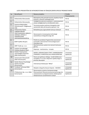 LISTA PROJEKTÓW DO WYKORZYSTANIA W ŚWIĄTECZNYM SPOCIE PROMOCYJNYM Lp. Beneficjent 1 Politechnika Warszawska 2 3 4 5 Politechnika Warszawska Centrum Materiałów Polimerowych i Węglowych PAN Politechnika Śląska LABORATORIUM PRZETWARZANIA OBRAZU I DŹWIĘKU SPÓŁKA Z OGRANICZONĄ ODPOWIEDZIALNOŚCIĄ 6 BLIRT Spółka Akcyjna 7 8 9 10 11 12 ZMP-Trade sp. z o.o. Instytut Farmakologii Polskiej Akademii Nauk Polskie Towarzystwo Technologów Żywności (lider konsorcjum) Uniwersytet Warszawski (lider konsorcjum) Szkoła Wyższa Psychologii Społecznej (lider konsorcjum) Fundacja Techsoup (lider konsorcjum) 13 CTAdventure Sp. z o.o. (lider konsorcjum) Nazwa projektu Bioimplanty dla potrzeb leczenia ubytków tkanki kostnej u chorych onkologicznych Inteligentne pancerze pasywne z zastosowaniem cieczy reologicznych ze strukturami nano Źródło finansowania PO IG PO IG Termosterowalne polimery biozgodne jako zamienniki skóry do leczenia oparzeń i ran PO IG Rehabilitacyjny egzoszkielet kończyn dolnych PO IG Opracowanie innowacyjnej technologii wyświetlacza holograficznego 3D PO IG Platforma produkcji fragmentów przeciwciał przeciwko schorzeniom immunologicznym i chorobom oka Mechatroniczny system do ćwiczeń kończyny górnej. PO IG PO IG Depresja - mechanizmy – terapia PO IG MODEL OGRANICZANIA STRAT I MARNOWANIA ŻYWNOŚCI Z KORZYŚCIĄ DLA SPOŁECZEŃSTWA Innowacje Społeczne Nowe perspektywy dialogu: model deliberacji i narzędzia IT na rzecz włączenia społecznego w procesy decyzyjne Innowacje Społeczne Interwencja Edukacyjna "Bliżej” Innowacje Społeczne Miejskie Usługi Na Danych Oparte - MUNDO Innowacje Społeczne Opracowanie systemu komputerowego Rzeczywistości Rozszerzonej przeznaczonego do zastosowania w programowaniu edukacyjnym dedykowanym przedmiotom ścisłym Innowacje Społeczne