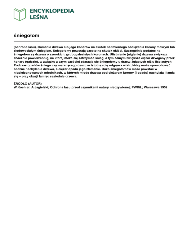 śniegołom (ochrona lasu), złamanie drzewa lub jego konarów na skutek nadmiernego obciążenia korony mokrym lub zlodowaciałym śniegiem. Śniegołomy powstają często na skutek okiści. Szczególnie podatne na śniegołom są drzewa o szerokich, grubogałęzistych koronach. Ulistnienie (uiglenie) drzewa zwiększa znacznie powierzchnię, na której może się zatrzymać śnieg, a tym samym zwiększa ciężar dźwigany przez konary (gałęzie), w związku z czym częściej zdarzają się śniegołomy u drzew iglastych niż u liściastych. Podczas opadów śniegu czy marznącego deszczu istotną rolę odgrywa wiatr, który może spowodować boczne nachylenie drzewa, a ciężar opadu jego złamanie. Dużo śniegołomów może powstać w niepielęgnowanych młodnikach, w których młode drzewa pod ciężarem korony (i opadu) nachylają i łamią się – przy okazji łamiąc sąsiednie drzewa. ŹRÓDŁO (AUTOR) W.Koehler, A.Jagielski; Ochrona lasu przed czynnikami natury nieozywionej; PWRiL; Warszawa 1952