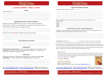 21 dniowa ZABAWA – Miłość - szablon Moja lista sukcesów tego dnia: Cieszyłem się dziś, sprawiło mi radość: …………………………………………………………………………………………….. Rano: ………………………………………………………………………………………………………………………………………………………… ………………………………………………………………………………………………………………………………………………………… ………………………………………………………………………………………………………………………………………………………… ………………………………………………………………………………………………………………………………………………………… ………………………………………………………………………………………………………………………………………………………… ………………………………………………………………………………………………………………………………………………………… Jestem wdzięczna/y za: ………………………………………………………………………………………………………………………………. ………………………………………………………………………………………………………………………………………………………… ………………………………………………………………………………………………………………………………………………………… ………………………………………………………………………………………………………………………………………………………… ………………………………………………………………………………………………………………………………………………………… ………………………………………………………………………………………………………………………………………………………… ………………………………………………………………………………………………………………………………………………………… Napisz co doceniasz w sobie, innych ludziach czy rzeczach:(co lubisz, kochasz, cenisz) Medytacja Kolorami lub Prysznic Mentalny™ Lubię Lubię Lubię Lubię Lubię Skupiając się na Twoim głębokim wdechu i wydechu – weź kilka wdechów i wydechów … Wykonaj Prysznic Mentalny™ wg instrukcji podanej na warsztacie lub Medytację Kolorami z CD Posiedź chwilę w ciszy! Wykonaj to co Ci przyjdzie do głowy: ………………………………………………………………………………………………………………………………………………………… ………………………………………………………………………………………………………………………………………………………… ………………………………………………………………………………………………………………..................................... w w w w w sobie:……………………………………………………………………………………………………………………………………………….. …………………………, ……………………………………………………………………………………………………………………………. …………………………, …………………………………………………………………………………………………………………………... …………………………, ……………………………………………………………………………………………………………………………. …………………………, ……………………………………………………………………………………………………………………………. Twoja intencja: czas snu i marzeń podczas snu. Postanawiam tworzyć podczas snu i zapamiętać go jak wstanę jeśli było to coś znaczącego dla mnie wskazówka. Kiedy wstanę zapytam siebie: jak się czułem we śnie! Pozytywny komunikat nt Miłość na dzisiejszy dzień: (posłuchaj nagrania) …………………………………………………………………………………………………………………………………………….…………… ……………………………………………………………………………………………………………………………….………………………… ………………………………………………………………………………………………………………….……………………………………… …………………………………………………………………………………………………………………………………………………………. ………………………………………………………………………………………………………………………………………………………… ………………………………………………………………………………………………………………………………………………………… ………………………………………………………………………………………………………………………………………………………… …………………………………………………………………………………………………………………………………………