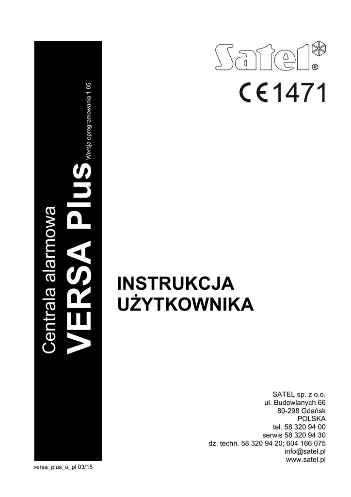 Centrala alarmowa Wersja oprogramowania 1.05 1471 INSTRUKCJA UŻYTKOWNIKA SATEL sp. z o.o. ul. Budowlanych 66 80-298 Gdańsk POLSKA tel. 58 320 94 00 serwis 58 320 94 30 dz. techn. 58 320 94 20; 604 166 075 [email protected] www.satel.pl versa_plus_u_pl 03/15 OSTRZEŻENIA Przed przystąpieniem do użytkowania centrali należy zapoznać się z niniejszą instrukcją w celu uniknięcia błędów, które mogą skutkować wadliwym działaniem sprzętu. Wprowadzanie w urządzeniu jakichkolwiek modyfikacji, które nie są autoryzowane przez producenta, lub dokonywanie samodzielnych napraw skutkuje utratą uprawnień wynikających z gwarancji. Centrala współpracuje tylko z analogowymi łączami abonenckimi. W przypadku zmiany analogowej sieci telefonicznej na inną należy skonsultować się z instalatorem systemu alarmowego. Należy zwrócić szczególną uwagę na częstą zajętość linii telefonicznej wykorzystywanej przez centralę oraz zgłaszanie awarii dotyczących tej linii lub monitoringu. Sytuacje takie należy niezwłocznie zgłaszać instalatorowi systemu alarmowego. Właściwą ochronę zapewnia tylko sprawny system alarmowy, dlatego firma SATEL zaleca jego regularne testowanie. Centrala wyposażona została w szereg funkcji autodiagnostycznych, które po odpowiednim skonfigurowaniu przez instalatora zapewniają kontrolę nad poprawnością działania systemu. System alarmowy nie zapobiegnie włamaniu, napadowi lub pożarowi, jednak gwarantuje, że w przypadku sytuacji alarmowej podjęte zostaną działania mające ograniczyć potencjalne szkody (poinformowanie o alarmie przy pomocy sygnalizacji optycznej lub dźwiękowej, powiadomienie o alarmie odpowiednich służb itd.). Dzięki temu może odstraszać potencjalnych włamywaczy. Firma SATEL stawia sobie za cel nieustanne podnoszenie jakości swoich produktów, co może skutkować zmianami w ich specyfikacji technicznej i oprogramowaniu. Aktualna informacja o wprowadzanych zmianach znajduje się na naszej stronie internetowej. Proszę nas odwiedzić: http://www.satel.pl Niniejszym SATEL sp. z o.o. deklaruje że urządzenie jest zgodne z zasadniczymi wymaganiami i innymi właściwymi postanowieniami Dyrektywy 1999/5/EC. Deklaracja zgodności jest dostępna pod adresem www.satel.eu/ce Hasła fabryczne: Hasło serwisowe: 12345 Hasło użytkownika 30: 1111 W instrukcji mogą wystąpić następujące symbole: - uwaga, - uwaga krytyczna. SPIS TREŚCI 1. 2. 3. 4. 5. 6. Wprowadzenie ................................................................................................................ 3 Sprawność techniczna systemu alarmowego.............................................................. 3 Koszty funkcjonowania systemu alarmowego............................................................. 3 Słownik terminów ........................................................................................................... 4 Centrala dostosowana do wymagań normy EN 50131 dla Grade 2............................ 5 Obsługa systemu alarmowego z manipulatora LCD ................................................... 6 6.1 Opis manipulatorów................................................................................................................ 7 6.1.1 6.1.2 6.1.3 6.1.4 6.1.5 6.2 Diody prezentujące stan stref i systemu........................................................................................7 Wyświetlacz ...................................................................................................................................8 Klawisze.........................................................................................................................................9 Wbudowany czytnik kart zbliżeniowych ........................................................................................9 Sygnalizacja dźwiękowa................................................................................................................9 Hasła .................................................................................................................................... 10 6.2.1 6.3 Hasła fabryczne ...........................................................................................................................11 Załączenie czuwania ............................................................................................................ 11 6.3.1 6.3.2 6.3.3 6.3.4 6.3.5 6.3.6 6.3.7 6.3.8 6.4 Załączenie czuwania bez wyboru strefy......................................................................................11 Załączenie czuwania kartą zbliżeniową VERSA-LCDM-WRL ....................................................11 Załączenie czuwania w wybranej strefie .....................................................................................11 Szybkie załączenie czuwania ......................................................................................................12 Załączenie czuwania bez opóźnienia..........................................................................................12 Informacja o zablokowanych wejściach ......................................................................................12 Odmowa załączenia czuwania i wymuszone załączenie czuwania ............................................12 Niepowodzenie procedury załączania czuwania.........................................................................13 Wyłączenie czuwania i kasowanie alarmu ........................................................................... 14 6.4.1 6.4.2 6.4.3 6.4.4 6.5 6.6 6.7 6.8 Wyłączenie czuwania i kasowanie alarmu bez wyboru strefy.....................................................14 Wyłączenie czuwania i kasowanie alarmu kartą zbliżeniową VERSA-LCDM-WRL ...................14 Wyłączenie czuwania i kasowanie alarmu w wybranej strefie ....................................................14 Przegląd wejść, które wywołały alarm........