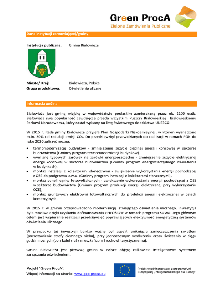Dane instytucji zamawiającej/gminy Instytucja publiczna: Gmina Białowieża Miasto/ Kraj: Grupa produktowa: Białowieża, Polska Oświetlenie uliczne Informacja ogólna Białowieża jest gminą wiejską w województwie podlaskim zamieszkaną przez ok. 2200 osób. Białowieża swą popularność zawdzięcza przede wszystkim Puszczy Białowieskiej i Białowieskiemu Parkowi Narodowemu, który został wpisany na listę światowego dziedzictwa UNESCO. W 2015 r. Rada gminy Białowieża przyjęła Plan Gospodarki Niskoemisyjnej, w którym wyznaczono m.in. 20% cel redukcji emisji CO2. Do przedsięwzięć przewidzianych do realizacji w ramach PGN do roku 2020 zaliczyć można: termomodernizację budynków - zmniejszenie zużycie cieplnej energii końcowej w sektorze budownictwa (Gminny program termomodernizacji budynków), wymianę typowych żarówek na żarówki energooszczędne - zmniejszenie zużycie elektrycznej energii końcowej w sektorze budownictwa (Gminny program energooszczędnego oświetlenia w budynkach), montaż instalacji z kolektorami słonecznymi - zwiększenie wykorzystania energii pochodzącej z OZE do podgrzewu c.w.u. (Gminny program instalacji z kolektorami słonecznymi), montaż paneli ogniw fotowoltaicznych - zwiększenie wykorzystania energii pochodzącej z OZE w sektorze budownictwa (Gminny program produkcji energii elektrycznej przy wykorzystaniu OZE), montaż gruntowych elektrowni fotowoltaicznych do produkcji energii elektrycznej w celach komercyjnych. W 2015 r. w gminie przeprowadzono modernizację istniejącego oświetlenia ulicznego. Inwestycja była możliwa dzięki uzyskaniu dofinansowania z NFOŚiGW w ramach programu SOWA. Jego głównym celem jest wspieranie realizacji przedsięwzięć poprawiających efektywność energetyczną systemów oświetlenia ulicznego. W przypadku tej inwestycji bardzo ważny był aspekt uniknięcia zanieczyszczenia światłem (pozostawienie strefy ciemnego nieba), przy jednoczesnym wydłużeniu czasu świecenia w ciągu godzin nocnych (co z kolei służy mieszkańcom i ruchowi turystycznemu). Gmina Białowieża jest pierwszą gmina w Polsce objętą całkowicie inteligentnym systemem zarządzania oświetleniem. Projekt “Green ProcA”. Więcej informacji na stronie: www.gpp-proca.eu Krótki opis zielonego zamówienia Projekt dotyczył modernizacji istniejącego oświetlenia ulicznego na terenie Gminy Białowieża. Zakres inwestycji obejmował: wymianę starych energochłonnych opraw (rtęciowych i sodowych) na oprawy LED Philips 538 szt., wraz z uzupełnieniem oświetlenia o 13 szt. nowych montaż i uruchomienie inteligentnego systemu sterowania. Kryteria oceny ofert: cena – 94 i okres gwarancji – 6. Przy ocenie ofert w kryterium okres gwarancji punkty były przyznawane w następujący sposób: udzielenie gwarancji na okres 6 lat – 0 pkt udzielenie gwarancji na okres 8 lat – 3 pkt udzielenie gwarancji na okres 10 lat – 6 pkt Wymagania dotyczące opraw oświetleniowych obejmowały m. in. warunki takie jak : możliwość wymiany panelu z diodami LED bez konieczności wymiany całej oprawy, zachowanie równomierności oświetlenia na całej powierzchni oświetlanej drogi w przypadku przepalenia się którejś z diod, możliwość wymiany modułu zasilającego oprawy, możliwość montażu oprawy zarówno na wysięgniku jak i bezpośrednio na słupie, oraz także na zmiany kąta nachylenia oprawy w zakresie minimum od 0 do 10° temperatura barwowa użytych diod z zakresu barwy neutralny biały 4000K +/-400K, wymagany wskaźnik oddawania barw minimum LED Ra≥70, skuteczność świetlna oprawy (stosunek strumienia świetlnego wychodzącego z oprawy do mocy całkowitej oprawy) nie mniejsza niż 90lm/W utrzymanie strumienia świetlnego w czasie: 80% po 60 000h (zgodnie z IES LM-80 – TM-21), układy optyczne opraw powinny spełniać wymagania normy PN-EN 62471:2010 „Bezpieczeństwo fotobiologiczne lamp i systemów lampowych”, elektroniczny układ zasilający umożliwiający płynną zmianę strumienia świetlnego oprawy i redukcję mocy ochrona przed przepięciami minimum 4kV, zakres temperatury pracy oprawy: od -30°C do +35°C, oprawy muszą posiadać deklaracje zgodności CE oraz certyfikacje na znak ENEC, wartości wskaźnika udziału światła wysyłanego ku górze (ULOR) zgodne z Rozporządzeniem WE nr 245/2009, oprawy muszą posiadać elektroniczny układ zasilający umożliwiający dowolną redukcję mocy w 5 dowolnych odcinkach czasowych, w celu udokumentowania zgodności oferowanego sprzętu oświetleniowego z wymogami SWIZ należy do oferty dołączyć kartę (karty) katalogową (katalogowe). Wykonawca był zobowiązany załączyć do składanej oferty: 1. Kartę katalogową proponowanych opraw oświetlenia ulicznego, 2. Certyfikat potwierdzający przyznanie proponowanym przez oświetleniowym znaku ENEC przez sygnatariusza porozumienia ENEC, Projekt “Green ProcA”. Więcej informacji na stronie: www.gpp-proca.eu wykonawcę oprawom 3. Certyfikat bezpieczeństwa fotobiologicznego wystawiony przez producenta proponowanych oprawy oświetleniowych, 4. Deklarację zgodności, wystawioną przez producenta proponowanych opraw, stwierdzającą zgodność wyrobu z wymaganiami zasadniczymi, 5. Oprawy oświetleniowe proponowane przez Wykonawcę, jedną oprawę dla mocy z przedziału do 50W i jedną oprawę dla mocy z przedziału powyżej 50W, 6. Obliczenia fotometryczne dla proponowanych opraw, w celu potwierdzenia, że oferowane oprawy oświetlenia ulicznego będą spełniać wymagania oświetleniowe zawarte w załączonych obliczeniach fotometrycznych i zgodne z normą PN-EN 13201. Ze względu na specyficzną dla opraw oświetleniowych drogowych niepowtarzalność charakterystyk świetlnych, Zamawiający dopuszcza tolerancje w stosunku do wymaganych projektem fotometrycznym załączonym do SIWZ parametrów oświetleniowych dróg. Tolerancje dla efektu oświetleniowego uzyskanego za pomocą opraw uznawanych za równoważn