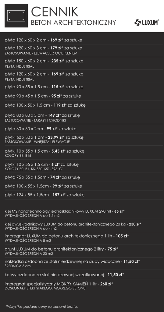 CENNIK BETON ARCHITEKTONICZNY płyta 120 x 60 x 2 cm - 169 zł* za sztukę płyta 120 x 60 x 3 cm - 179 zł* za sztukę ZASTOSOWANIE - ELEWACJE Z OCIEPLENIEM płyta 150 x 60 x 2 cm - 235 zł* za sztukę PŁYTA INDUSTRIAL płyta 120 x 60 x 2 cm - 169 zł* za sztukę PŁYTA INDUSTRIAL płyta 90 x 55 x 1,5 cm - 115 zł* za sztukę płyta 90 x 45 x 1,5 cm - 95 zł* za sztukę płyta 100 x 50 x 1,5 cm - 119 zł* za sztukę płyta 80 x 80 x 3 cm - 149 zł* za sztukę ZASTOSOWANIE - TARASY I CHODNIKI płyta 60 x 60 x 2cm - 99 zł* za sztukę płytki 60 x 30 x 1 cm - 23,99 zł* za sztukę ZASTOSOWANIE - WNĘTRZA I ELEWACJE płytki 10 x 55 x 1,5 cm - 5,45 zł* za sztukę KOLORY B8, B16 płytki 10 x 55 x 1,5 cm - 6 zł* za sztukę KOLORY B0, B1, KS, S50, S51, S96, C1 płyta 75 x 55 x 1,5cm - 74 zł* za sztukę płyta 100 x 55 x 1,5cm - 99 zł* za sztukę płyta 124 x 55 x 1,5cm - 157 zł* za sztukę klej MS nanotechnology jednoskładnikowy LUXUM 290 ml - 65 zł * WYDAJNOŚĆ ŚREDNIA do 1,5 m2 klej dwuskładnikowy LUXUM do betonu architektonicznego 20 kg - 230 zł* WYDAJNOŚĆ ŚREDNIA do 4 m2 impregnat LUXUM do betonu architektonicznego 1 litr - 105 zł* WYDAJNOŚĆ ŚREDNIA 8 m2 grunt LUXUM do betonu architektonicznego 2 litry - 75 zł* WYDAJNOŚĆ ŚREDNIA 20 m2 nakładka ozdobna ze stali nierdzewnej na śruby widoczne - 11,50 zł* ŚREDNICA 3 cm kotwy ozdobne ze stali nierdzewnej szczotkowanej - 11,50 zł* impregnat specjalistyczny MOKRY KAMIEŃ 1 litr - 260 zł* DOSKONAŁY EFEKT STAREGO, MOKREGO BETONU *Wszystkie podane ceny są cenami brutto. R