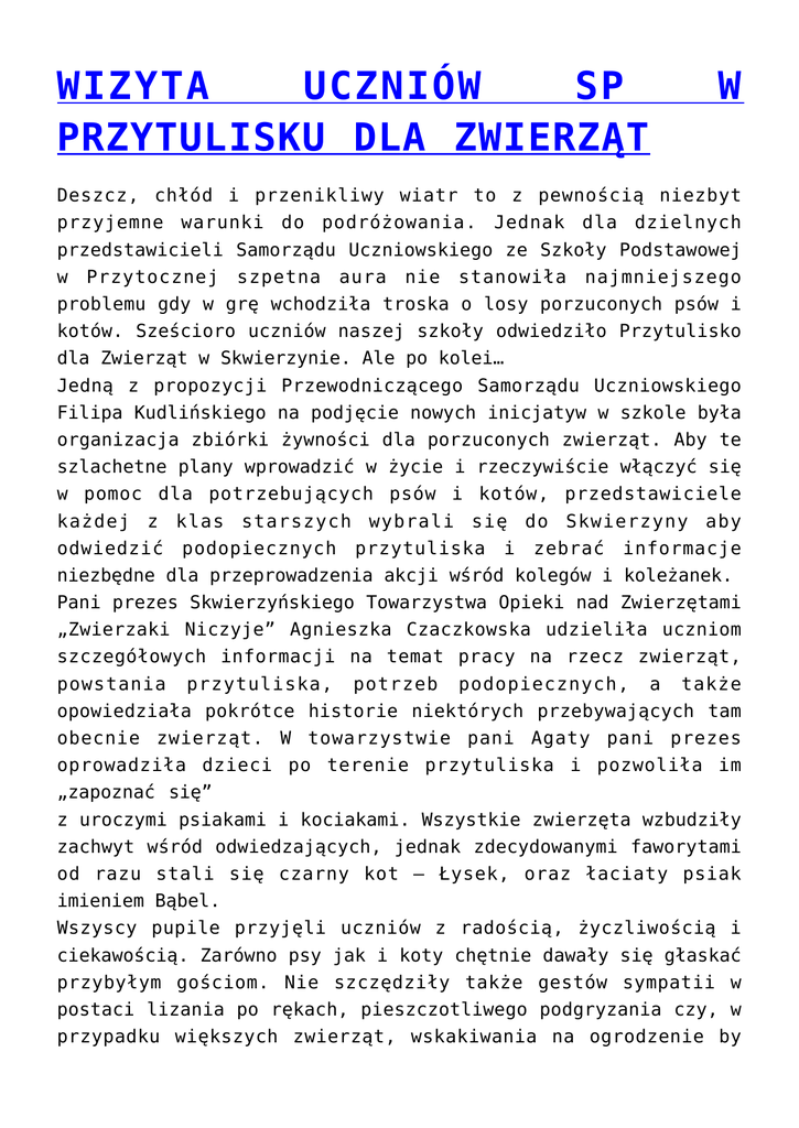 WIZYTA UCZNIÓW SP PRZYTULISKU DLA ZWIERZĄT W Deszcz, chłód i przenikliwy wiatr to z pewnością niezbyt przyjemne warunki do podróżowania. Jednak dla dzielnych przedstawicieli Samorządu Uczniowskiego ze Szkoły Podstawowej w Przytocznej szpetna aura nie stanowiła najmniejszego problemu gdy w grę wchodziła troska o losy porzuconych psów i kotów. Sześcioro uczniów naszej szkoły odwiedziło Przytulisko dla Zwierząt w Skwierzynie. Ale po kolei… Jedną z propozycji Przewodniczącego Samorządu Uczniowskiego Filipa Kudlińskiego na podjęcie nowych inicjatyw w szkole była organizacja zbiórki żywności dla porzuconych zwierząt. Aby te szlachetne plany wprowadzić w życie i rzeczywiście włączyć się w pomoc dla potrzebujących psów i kotów, przedstawiciele każdej z klas starszych wybrali się do Skwierzyny aby odwiedzić podopiecznych przytuliska i zebrać informacje niezbędne dla przeprowadzenia akcji wśród kolegów i koleżanek. Pani prezes Skwierzyńskiego Towarzystwa Opieki nad Zwierzętami „Zwierzaki Niczyje” Agnieszka Czaczkowska udzieliła uczniom szczegółowych informacji na temat pracy na rzecz zwierząt, powstania przytuliska, potrzeb podopiecznych, a także opowiedziała pokrótce historie niektórych przebywających tam obecnie zwierząt. W towarzystwie pani Agaty pani prezes oprowadziła dzieci po terenie przytuliska i pozwoliła im „zapoznać się” z uroczymi psiakami i kociakami. Wszystkie zwierzęta wzbudziły zachwyt wśród odwiedzających, jednak zdecydowanymi faworytami od razu stali się czarny kot – Łysek, oraz łaciaty psiak imieniem Bąbel. Wszyscy pupile przyjęli uczniów z radością, życzliwością i ciekawością. Zarówno psy jak i koty chętnie dawały się głaskać przybyłym gościom. Nie szczędziły także gestów sympatii w postaci lizania po rękach, pieszczotliwego podgryzania czy, w przypadku większych zwierząt, wskakiwania na ogrodzenie by powitać zwiedzających. Po tym jak przedstawiciele Samorządu odwiedzili milusińskich, pani Agnieszka udzieliła im wywiadu. Uczniowie dowiedzieli się m.in., że przytulisko dla zwierząt w Skwierzynie istnieje od 2011 roku i zostało złożone przez Skwierzyńskie Towarzystwo Opieki nad Zwierzętami „Zwierzaki Niczyje”, poznali zasady działania wolontariatu i dokładnie zapisali czego najbardziej potrzebują zwierzęta. W związku z tym Samorząd Uczniowski rozpoczyna zbiórkę rzeczy najbardziej niezbędnych podopiecznym STOZ „Zwierzaki Niczyje”. Są to: – karma dla psów i kotów – ręczniki, koce, kołdry, poduszki (z wyjątkiem wyrobów z pierza) – żwirek do kuwet – obroże, smycze – gryzaki i zabawki dla szczeniąt Każdy może pomóc. Uczniowie naszej szkoły nie raz pokazali, że mają wielkie serca. Wierzymy, że nie zabraknie w nich dobroci dla porzuconych zwierząt! Opiekun SU Natalia Baran INFORMACJA DLA WYBORCÓW W związku ze zbliżającymi się wyborami informuję, że lokale wyborcze będą otwarte w dniu wyborów od godz. 7:00 do godz. 21:00, a w obwodach odrębnych tj. DPS Rokitno 58 i DPS Rokitno 38 od godz. 9:00 do godz. 21:00. Jednocześnie podaję do publicznej wiadomości numery i granice obwodów głosowania, siedziby obwodowych komisji wyborczych oraz lokale wyborcze dostosowane do potrzeb wyborców niepełnosprawnych, a także lokale wyznaczone do głosowania korespondencyjnego w wyborach do Sejmu Rzeczypospolitej Polskiej i Senatu Rzeczypospolitej Polskiej zarządzonych na dzień 25 października 2015 r. Nr obwodu Granice obwodu głosowania Siedziba obwodowej komisji wyborczej 1. Sołectwo Chełmsko (wieś Chełmsko, wybud. Żabno) Sołectwo Twierdzielewo (wieś Twierdzielewo) Wiejski Dom Kultury w Chełmsku 15 2. Sołectwo Goraj (wieś Goraj) Sołectwo Krobielewo (wieś Krobielewo i osada Nowiny) Sołectwo Stryszewo (wieś Stryszewo i Stryszki) Sołectwo Lubikowo(wieś Lubikowo, przys.Lubikówko, osada Dziubielewo) Sołectwo Strychy (wieś Strychy) 3. Sołectwo Przytoczna (wieś Przytoczna, wybud. Murowiec) Sołectwo Dębówko (wieś Dębówko i Orłowce) Sołectwo Gaj-Poręba (wieś Gaj i Poręba) Sołectwo Rokitno 4. 5. (wieś Rokitno bez DPS nr 38 i 58) Sołectwo Wierzbno (wieś Wierzbno) Świetlica Wiejska w Goraju 24 Urząd Gminy ul. Rokitniańska 4 Przytoczna Lokal dostosowany do potrzeb osób niepełnosprawnych* Lokal wyznaczony do głosowania korespondencyjnego** Dom Strażaka w Rokitnie 12b Szkoła Podstawowa w Wierzbnie 31 Sołectwo Krasne Dłusko (wieś Krasne Dłusko) Sołectwo Nowa 6. Niedrzwica (wieś Nowa Niedrzwica, osada Chełmicko, Rokitno-Stacja) 7. Dom Pomocy Społecznej Rokitno 58 Świetlica Wiejska w Nowej Niedrzwicy 6 Lokal dostosowany do potrzeb osób niepełnosprawnych* Lokal wyznaczony do głosowania korespondencyjnego** DPS Rokitno 58 Lokal dostosowany do potrzeb osób niepełnosprawnych* DPS Rokitno 38 8. Dom Pomocy Społecznej Rokitno 38 Lokal dostosowany do potrzeb osób niepełnosprawnych* Wójt Gminy Przytoczna (-) Bartłomiej Kucharyk [wpdm_package id=27886 template=”link-template-default.php”] MULTIMEDIALNE KOMUNIKATY PKW ORAZ INFORMACJA O SPOSOBIE GŁOSOWANIA W związku ze zbliżającymi się wyborami do Sejmu RP i Senatu RP, zarządzonymi na dzień 25 października 2015 r. Krajowe Biuro Wyborcze zrealizowało cykl multimedialnych komunikatów Państwowej Komisji Wyborczej odnoszących się do najistotniejszych kwestii związanych z przebiegiem głosowania, tj. do kwestii terminu głosowania, ważności głosów, głosowania przez pełnomocnika, a także udogodnień niepełnosprawnych dostępnych pod adresem: dla osób http://parlament2015.pkw.gov.pl/aktualnosci/6_Multimedia Informacje dotyczące wyborów do Sejmu RP i Senatu RP oraz o sposobie głosowania znajdują się poniżej. http://www.przytoczna.bip.net.pl/?c=901 http://parlament2015.pkw.gov.pl/ [wpdm_package id=’27662′] [wpdm_package id=’27664′] HAPPENING PROMUJĄCY ZDROWIE LEKCJA WRAŻLIWOŚCI Uczniowie klasy VIa prze