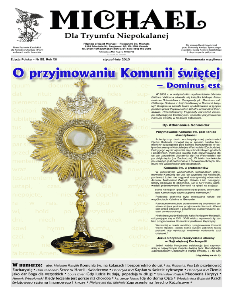 Dla Tryumfu Niepokalanej Pilgrims of Saint Michael – Pielgrzymi św. Michała Pismo Patriotów Katolickich dla Królestwa Chrystusa i Maryi w duszach rodzin i narodów Edycja Polska – Nr 55. Rok XII 1101 Principale St., Rougemont QC, J0L 1M0, Canada Tel.: (450) 469-2209; (514) 856-5714; Fax: (450) 469-2601 Publications Mail Reg. No 40063742 Printed in Canada styczeń-luty 2010 Dla sprawiedliwości społecznej przez Ekonomię Kredytu Społecznego w zgodzie z nauką Kościoła Katolickiego i nie przez partie polityczne Prenumerata wysyłkowa Tantum ergo Sacramentum veneremur cernui: et antiquum documentum novo ce- – Dominus est W 2008 r. w watykańskim wydawnictwie Libreria dat ritui: praestet fides sup- Editrice Vaticana ukazała się książka biskupa Athanasiusa Schneidera z Karagandy pt. „Dominus est. Biskupa z Azji Środkowej o Komunii święplementum sensuum defectui. Refleksje tej”. Książka ta została także opublikowana w języku polskim przez Wydawnictwo Sióstr Loretanek w WarGenitori, Genitoque laus et szawie. Przedstawiamy fragmenty rozważań Biskupa dotyczących Eucharystii i sposobu przyjmowania iubilatio, salus, honor, vir- Komunii świętej w Kościele katolickim. Bp Athanasius Schneider tus quoque sit et benedictio: Przyjmowanie Komunii św. pod koniec starożytności procedenti ab utroque com- Autentyczny duch eucharystycznej pobożności Ojców Kościoła rozwijał się w sposób bardzo har monijny szczególnie pod koniec starożytności w ca par sit laudatio. Amen. łym ówczesnym Kościele (na Wschodzie i Zachodzie). Pełny jego wyraz ujawniał się w konkretnych gestach Komunia święta była przyjmowana do przed tak wielkim sakra- iustpostawach. po uprzednim ukorzeniu się (na Wschodzie) lub po uklęknięciu (na Zachodzie). W takim kontekście pouczające jest porównanie z rozwojem obrzędu Ko mentem, upadajmy wszyscy munii we wspólnotach protestanckich. Komunia św. u protestantów wraz. niech przed nowym W pierwszych wspólnotach luterańskich przyj mowano Komunię do ust, co czyniono na kolanach, Luter nie negował rzeczywistej obecności testamentem starych praw ponieważ Jezusa. Natomiast Zwingli, Kalwin i ich następcy, którzy negowali tę obecność, już w XVI wieku wpro , ustapi , czas. co dla zmyslw wadzili przyjmowanie Komunii na rękę i na stojąco: , niepojete,, niech dopelni wia- Podobna praktyka była stosowana także we wspólnotach Kalwina w Genewie: ra w nas. bogu ojcu i syno, , wi, hold po wszystkie niesmy Niektóre synody Kościoła kalwińskiego w Holandii, odbywające się w XVI i XVII wieku, wprowadziły za dni. niech podaje wiek wie- kaz przyjmowania Komunii w postawie klęczącej: kowi hymn tryumfu, dzieki, , , czci. a rownemu im ducho- Jezus Chrystus rzeczywiście obecny w Najświętszej Eucharystii każda liturgiczna celebracja jest czynno wi niechaj wieczna chwa- ściąJeżeli w najwyższym stopniu świętą (por. Konstytucja Sacrosanctum Concilium o liturgii świętej, 7), to tym , brzmi. Amen. la O przyjmowaniu Komunii świętej Stanie na nogach i posuwanie się do przodu celem przy jęcia Komunii było czymś zupełnie normalnym.1 Rzeczą normalną było przesuwanie się do przodu i po stawa stojąca podczas przyjmowania Komunii. Wierni stali przed ołtarzem i przyjmowali eucharystyczne po staci do własnych rąk.2 Wcześniej w czasie modlitwy i przyjmowania Komunii wierni klęczeli, jednak liczne synody zabroniły takiej praktyki, aby wykluczyć możliwość oddawania czci chlebowi.3 (ciąg dalszy na str. 2) W numerze: abp. Malcolm Ranjith Komunia św. na kolanach i bezpośrednio do ust • ks. Robert J. Fox Jak przyjmować Eucharystię • Ron Tesoriero Serce w Hostii - świadectwo • Benedykt XVI Kapłan w świecie cyfrowym • Benedykt XVI Ziemia jako dar Boga dla wszystkich • Louis Even Gdy ludzie budują, popadają w długi • Stanisław Krajski Masoneria i kryzys • Henryk Wesołowski Kiedy leczenie jest gorsze niż choroba • ks. Jerzy Nemo Idę do domu Ojca • Włodzimierz Bojarski Krach światowego systemu finansowego i kryzys • Pielgrzymi św. Michała Zaproszenie na Jerycho Różańcowe •