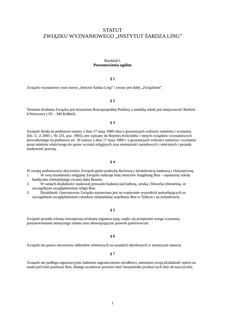 STATUT ZWIĄZKU WYZNANIOWEGO „INSTYTUT ŚARDZA LING” Rozdział I. Postanowienia ogólne §1 Związek wyznaniowy nosi nazwę „Instytut Śardza Ling” i zwany jest dalej „Związkiem”. §2 Terenem działania Związku jest terytorium Rzeczpospolitej Polskiej a siedzibą władz jest miejscowość Borków k/Warszawy ( 05 – 340 Kołbiel). §3 Związek działa na podstawie ustawy z dnia 17 maja 1989 roku o gwarancjach wolności sumienia i wyznania. (Dz. U. Z 2005 r. Nr 231, poz. 1965), jest wpisany do Rejestru Kościołów i innych związków wyznaniowych prowadzonego na podstawie art. 30 ustawy z dnia 17 maja 1989 r. o gwarancjach wolności sumienia i wyznania przez ministra właściwego do spraw wyznań religijnych oraz mniejszości narodowych i etnicznych i posiada osobowość prawną. §4 W swojej podstawowej aktywności Związek godzi praktykę duchową z działalnością naukową i charytatywną. 1. W swej działalności religijnej Związek realizuje linię mistrzów Jungdrung Bon – najstarszej szkoły buddyzmu tybetańskiego zwanej dalej Bonem. 2. W ramach działalności naukowej prowadzi badania nad kulturą, sztuką i filozofią tybetańską, ze szczególnym uwzględnieniem religii Bon. 3. Działalność charytatywna Związku nastawiona jest na wspieranie wszystkich potrzebujących ze szczególnym uwzględnieniem członków tybetańskiej wspólnoty Bon w Tybecie i na uchodźstwie. §5 Związek posiada własną wewnętrzną strukturę organizacyjną; rządzi się przepisami swego wyznania, postanowieniami niniejszego statutu oraz obowiązującym prawem państwowym. §6 Związek ma prawo otworzenia oddziałów terenowych na zasadach określonych w niniejszym statucie. §7 Związek nie podlega organizacyjnie żadnemu zagranicznemu ośrodkowi, natomiast swoją działalność opiera na tradycjach linii przekazu Bon, dlatego uczniowie powinni mieć bezpośredni przekaz tych linii od nauczyciela. 1 §8 Związek współpracuje z innymi związkami, stowarzyszeniami oraz organizacjami kultywującymi podobne cele, zarówno w kraju jak i zagranicą. Rozdział II. Cele działania oraz formy i zasady ich realizacji §9 Celem związku jest: 1. studiowanie nauk Buddy Tenpy Szenraba, tj. dziewięciu pojazdów Bon, czyli sutr, tantr i Wielkiej Doskonałości, historii i praktyki Bon, z naciskiem na „Wewnętrzną Praktykę Medytacji” tak, jak nauczał jej Śardza Taszi Gjaltsen – mistrz, który osiągnął ciało światła; 2. upowszechnianie zasad etycznych i moralnych pochodzących od prastarej tradycji Bon i mistrzów podążających za tą tradycją; 3. dążenie do rozwoju duchowego poprzez praktyki medytacyjne grupowe i indywidualne; 4. poszanowanie życia w każdej jego formie; 5. wychowywanie swoich członków w duchu wzajemnego poszanowania i tolerancji wobec innych poglądów i wyznań; 6. prowadzenie badań nad przeszłością i współczesnym stanem wiedzy religijnej , filozoficznej i naukowej, dziejami a także dziedzictwem kulturowym Tybetu oraz innych narodów historycznie z Tybetem związanych; 7. pogłębianie i upowszechnianie wiedzy o tybetańskiej tradycji Jungdrung Bon, dziejach Tybetu i krainie Siang Siung; 8. prowadzenie dialogu religijnego opartego na wzajemnym szacunku i tolerancji (w nawiązaniu do działalności przedstawiciela XIX- wiecznego instytucjonalnego tybetańskiego ruchu Rime – mistrza Śardza Taszi Gjaltsena); 9. szeroko rozumiana działalność charytatywna na rzecz ubogich i potrzebujących (inicjatywy o charakterze zdrowotnym, edukacyjnym i materialnym); 10. edukacja ekologiczna i działalność na rzecz środowiska naturalnego; 11. udzielanie pomocy członkom Związku. § 10 Związek realizuje swoje cele w szczególności poprzez: 1. studiowanie tybetańskiej tradycji Bon; 2. organizowanie spotkań z mistrzami religii Bon i innych szkół buddyzmu tybetańskiego; 3. organizowanie kursów medytacji i innych form praktykowania Nauk Buddy Tenpy Szenraba; 4. tworzenie ośrodków terenowych umożliwiających pełną praktykę Nauk Buddy Tenpy Szenraba; 5. inwestycje sakralne; 6. wytwarzanie oraz nabywanie przedmiotów potrzebnych do szerzenia kultu i praktyk religijnych oraz korzystanie z nich; 7. organizowanie seminariów, wykładów publicznych, wystaw, konferencji oraz kursów; 8. prowadzenie biblioteki naukowej; 9. organizowanie wyjazdów na teren Tybetu i do świętych miejsc tradycji Bon; 10. zapraszanie gości: wykwalifikowanych nauczycieli i uczonych tradycji Bon, naukowców, lekarzy medycyny tybetańskiej i artystów uprawiających tradycyjną tybetańską sztukę; 11. prowadzenie wymiany naukowej oraz innych kontaktów zgodnych z celami związku; 12. prowadzenie działalności wydawniczej i informacyjnej; 13. organizowanie zbiórek pieniężnych w celu wspierania osób potrzebujących i organizacji charytatywnych; 14. korzystanie ze środków masowego przekazu; 15. prowadzenie działalności pożytku publicznego po spełnieniu wymagań określonych w ustawie z dnia 24 kwietnia 2003 r. o działalności pożytku publicznego i o wolontariacie (Dz. U. Nr 96 poz. 873, z późn. zm.); 16. inne formy działalności służące realizacji celów statutowych. 2 Rozdział III Członkowie, ich prawa i obowiązki § 11 Członkowie Związku dzielą się na zwyczajnych i honorowych. § 12 1. 2. Członkiem zwyczajnym lub honorowym może zostać każdy pełnoletni obywatel Rzeczpospolitej Polskiej a także innego państwa, który pragnie współdziałać w urzeczywistnianiu celów Związku. Osoba niepełnoletnia może zostać członkiem zwyczajnym za zgodą rodziców lub opiekunów prawnych. § 13 Członków zwyczajnych przyjmuje Rada Związku na podstawie pisemnej deklaracji zainteresowanego o chęci wstąpienia do Związku. § 14 Członkowie zwyczajni mają prawo do: 1. studiowania tradycji Bon i uczestnictwa w kursach medytacji i innych formach praktykowania nauk Buddy Tenpy Szenraba zgodnie ze wskazówkami Głównego Nauczyciela w celu własnego roz