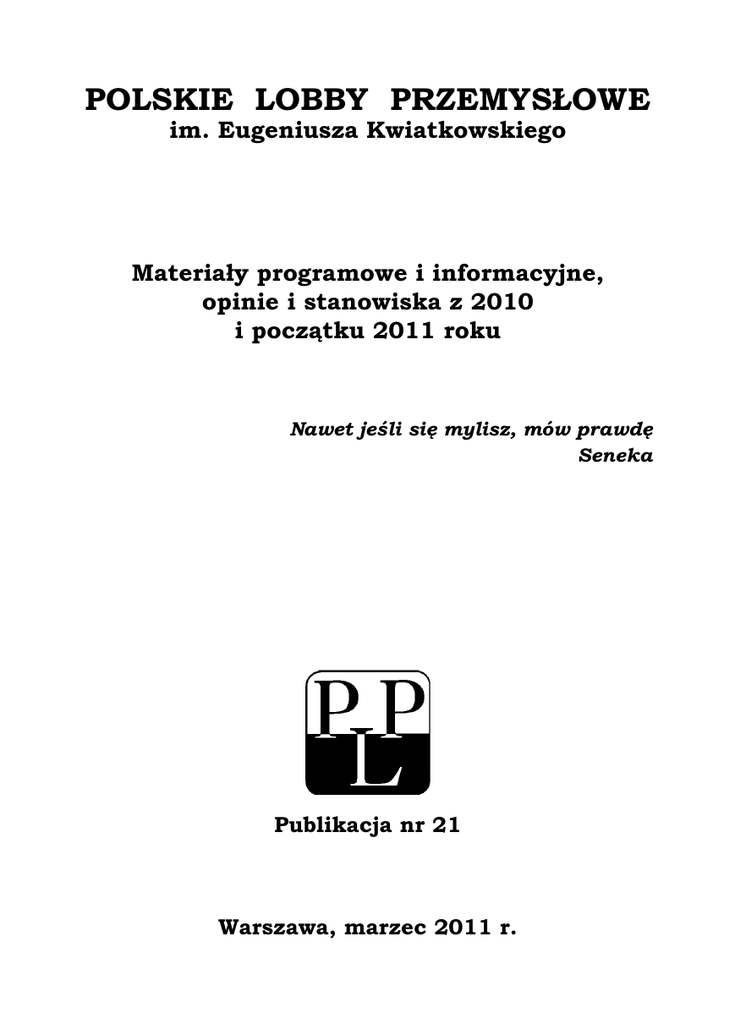 POLSKIE LOBBY PRZEMYSŁOWE im. Eugeniusza Kwiatkowskiego Materiały programowe i informacyjne, opinie i stanowiska z 2010 i początku 2011 roku Nawet jeśli się mylisz, mów prawdę Seneka Publikacja nr 21 Warszawa, marzec 2011 r. Redakcja: mgr Jerzy Horodecki, Edmund Misterski, dr Henryk Potrzebowski, prof. dr hab. Paweł Soroka Zdjęcia: Mikołaj Mazurkiewicz, dr Henryk Potrzebowski, dr Zbigniew Zaborowski, Rafał Zarzecki Realizacja: Ośrodek Wydawniczo-Poligraficzny SIM 00-669 Warszawa, ul. Emilii Plater 9/11, tel. 22 629 80 38 e-mail: [email protected] Nakład: 450 egz. Spis treści Wstęp .................................................................................. 9 Geneza, tożsamość i dorobek Polskiego Lobby Przemysłowego im. Eugeniusza Kwiatkowskiego ................... 11 Dokument założycielski PLP ................................................. 15 Pismo PLP do Ludwika Dorna – Wicepremiera, Ministra Spraw Wewnętrznych ........................................................... 19 Odpowiedź Ministra Spraw Wewnętrznych ........................... 20 List Gratulacyjny Prezydenta RP Lecha Kaczyńskiego do organizatorów i uczestników Jubileuszu 15-lecia Polskiego Lobby Przemysłowego ........................................... 21 Partnerzy Polskiego Lobby Przemysłowego Porozumienie o współpracy pomiędzy Stowarzyszeniem Inżynierów i Techników Mechaników Polskich a Polskim Lobby Przemysłowym ........................................... 25 Porozumienie o współpracy pomiędzy Polskim Lobby Przemysłowym a Towarzystwem Wiedzy Obronnej ................ 28 Porozumienie o współdziałaniu w sprawie strategicznych branż polskiego przemysłu ................................................... 31 Porozumienie Obywatelskie organizacji społecznych i związków zawodowych „Dla polskiej nauki, rozwoju ponad podziałami” z dnia 7 września 2004 roku ................... 45 Zasady wykonywania uprawnień Skarbu Państwa i problemy lobbingu Uwagi Polskiego Lobby Przemysłowego do projektu ustawy z dn. 30.10. 2009 r. o zasadach wykonywania niektórych uprawnień Skarbu Państwa ................................................. 56 Pismo Ministerstwa Skarbu Państwa do Koordynatora PLP .. 66 Pismo przewodniczącego Sejmowej Komisji Skarbu Państwa do Koordynatora PLP ........................................................... 67 Opinia i uwagi Polskiego Lobby Przemysłowego im. Eugeniusza Kwiatkowskiego na temat projektu założeń projektu ustawy o lobbingu ..................................... 69 Pismo Julii Pitery - Sekretarza Stanu w Kancelarii Prezesa Rady Ministrów do Koordynatora Polskiego Lobby Przemysłowego ..................................................................... 73 Przyszłość polskiego przemysłu obronnego i lotniczego Stanowisko Polskiego Lobby Przemysłowego im. Eugeniusza Kwiatkowskiego w sprawie restrukturyzacji i konsolidacji potencjału polskiego przemysłu obronnego ..... 79 Stanowisko Polskiego Lobby Przemysłowego i Zarządu Okręgu Przedsiębiorstw Wojskowych i Działalności Pozabudżetowej NSZZ Pracowników Wojska w sprawie przyszłości Wojskowych Przedsiębiorstw Remontowo-Produkcyjnych .................................................................... 86 Stanowisko Polskiego Lobby Przemysłowego im. Eugeniuszu Kwiatkowskiego w sprawie budżetu MON na rok 2011 i realizacji programów modernizacyjnych Sił Zbrojnych RP .................................................................. 94 Odpowiedź Marcina Idzika – Podsekretarza Stanu w MON ds. Uzbrojenia i Modernizacji ................................... 99 Propozycje Polskiego Lobby Przemysłowego dotyczące ustanowienia strategicznego programu rządowego związanego z pozyskaniem dla Sił Powietrznych samolotu szkolenia zaawansowanego (LIFT ) ....................................... 105 Pismo - opinia skierowana do Prezesa Rady Ministrów Donalda Tuska dotycząca Dyrektywy nr 2009/81WE ........... 125 Sytuacja polskich kolei regionalnych Stanowisko Polskiego Lobby Przemysłowego, Konfederacji Kolejowych Związków Zawodowych i Sekcji Krajowej Kolejarzy NSZZ „Solidarność” w sprawie usamorządowienia polskich kolei regionalnych .................................................. 137 Rewitalizacja Holdingu Stocznia Szczecińska S.A. Poparcie Polskiego Lobby Przemysłowego dla koncepcji rewitalizacji holdingu Stocznia Szczecińska Porta Holding S.A. w Szczecinie ................................................................. 145 Sygnatariusze Listu poparcia z dn. 17.03.2010 r. dla inicjatywy rewitalizacji Stoczni Szczecińskiej w trybie układu w upadłości przed Sądem Rejonowym w Szczecinie zgodnie z wnioskiem Zarządu Stoczni Szczecińskiej Porta Holding S.A. z dnia 17.11.2009 r. sygn. akt.XII U-24/09 .......................................................... 147 Pismo PLP do Ministra Skarbu Państwa Aleksandra Grada w sprawie rewitalizacji Stoczni Szczecińskiej Porta Holding S.A z dnia 2 września 2010 r. .................................. 153 Pismo PLP do Ministra Skarbu Państwa Aleksandra Grada w sprawie rewitalizacji Stoczni Szczecińskiej Porta Holding S.A z dnia 16 września 2010 r. ................................ 154 Odpowiedź Podsekretarzu Stanu w Ministerstwie Skarbu Państwa Zdzisława Gawlika ................................................. 156 Czyja będzie polska elektroenergetyka Stanowisko Polskiego Lobby Przemysłowego dotyczące konsolidacji i prywatyzacji sektora elektroenergetycznego oraz budowy elektrowni atomowej ........................................ 162 Zakończono prace nad Raportem o globalnym kryzysie gospodarczym Zakończono prace nad niezależnym Raportem o globalnym kryzysie finansowo-gospodarczym ..................... 175 Polskie Lobby Przemysłowe na łamach prasy i w Internecie (marzec 2010 r. – marzec 2011 r.) ..................................... 185 Kalendarium Polskiego Lobby Przemysłowego (marzec 2010 – marzec 2011 r