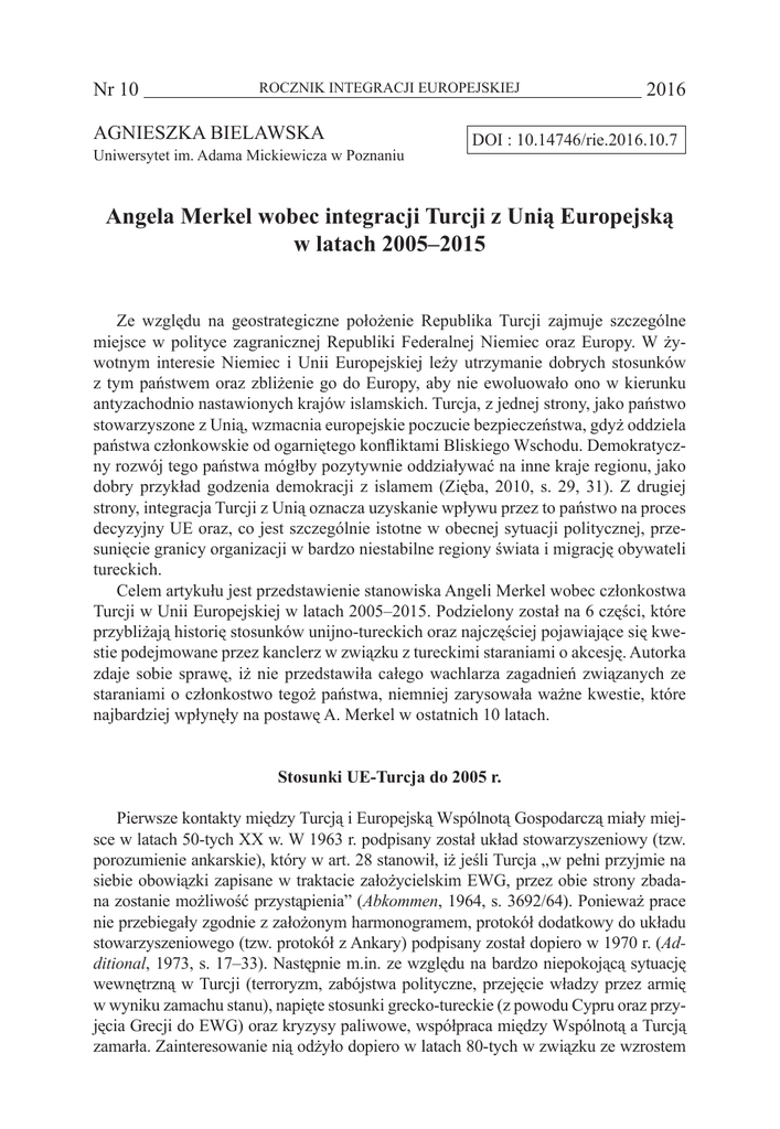 Nr 10 ROCZNIK INTEGRACJI EUROPEJSKIEJ AGNIESZKA BIELAWSKA Uniwersytet im. Adama Mickiewicza w Poznaniu 2016 DOI : 10.14746/rie.2016.10.7 Angela Merkel wobec integracji Turcji z Unią Europejską w latach 2005–2015 Ze względu na geostrategiczne położenie Republika Turcji zajmuje szczególne miejsce w polityce zagranicznej Republiki Federalnej Niemiec oraz Europy. W żywotnym interesie Niemiec i Unii Europejskiej leży utrzymanie dobrych stosunków z tym państwem oraz zbliżenie go do Europy, aby nie ewoluowało ono w kierunku antyzachodnio nastawionych krajów islamskich. Turcja, z jednej strony, jako państwo stowarzyszone z Unią, wzmacnia europejskie poczucie bezpieczeństwa, gdyż oddziela państwa członkowskie od ogarniętego konfliktami Bliskiego Wschodu. Demokratyczny rozwój tego państwa mógłby pozytywnie oddziaływać na inne kraje regionu, jako dobry przykład godzenia demokracji z islamem (Zięba, 2010, s. 29, 31). Z drugiej strony, integracja Turcji z Unią oznacza uzyskanie wpływu przez to państwo na proces decyzyjny UE oraz, co jest szczególnie istotne w obecnej sytuacji politycznej, przesunięcie granicy organizacji w bardzo niestabilne regiony świata i migrację obywateli tureckich. Celem artykułu jest przedstawienie stanowiska Angeli Merkel wobec członkostwa Turcji w Unii Europejskiej w latach 2005–2015. Podzielony został na 6 części, które przybliżają historię stosunków unijno-tureckich oraz najczęściej pojawiające się kwestie podejmowane przez kanclerz w związku z tureckimi staraniami o akcesję. Autorka zdaje sobie sprawę, iż nie przedstawiła całego wachlarza zagadnień związanych ze staraniami o członkostwo tegoż państwa, niemniej zarysowała ważne kwestie, które najbardziej wpłynęły na postawę A. Merkel w ostatnich 10 latach. Stosunki UE-Turcja do 2005 r. Pierwsze kontakty między Turcją i Europejską Wspólnotą Gospodarczą miały miejsce w latach 50-tych XX w. W 1963 r. podpisany został układ stowarzyszeniowy (tzw. porozumienie ankarskie), który w art. 28 stanowił, iż jeśli Turcja „w pełni przyjmie na siebie obowiązki zapisane w traktacie założycielskim EWG, przez obie strony zbadana zostanie możliwość przystąpienia” (Abkommen, 1964, s. 3692/64). Ponieważ prace nie przebiegały zgodnie z założonym harmonogramem, protokół dodatkowy do układu stowarzyszeniowego (tzw. protokół z Ankary) podpisany został dopiero w 1970 r. (Ad ditional, 1973, s. 17–33). Następnie m.in. ze względu na bardzo niepokojącą sytuację wewnętrzną w Turcji (terroryzm, zabójstwa polityczne, przejęcie władzy przez armię w wyniku zamachu stanu), napięte stosunki grecko-tureckie (z powodu Cypru oraz przyjęcia Grecji do EWG) oraz kryzysy paliwowe, współpraca między Wspólnotą a Turcją zamarła. Zainteresowanie nią odżyło dopiero w latach 80-tych w związku ze wzrostem 102 Agnieszka Bielawska RIE 10 ’16 napięcia na linii Wschód-Zachód. Wykorzystując sprzyjający klimat 14 kwietnia 1987 r., w imieniu rządu tureckiego, minister ds. europejskich Ali Bozer, złożył pierwszy formalny wniosek o członkostwo. W wydanej dwa lata później negatywnej opinii Komisji WE można było przeczytać, iż Turcja nie spełnia warunków członkostwa, a nawet gdyby było inaczej, nie zostałaby przyjęta, gdyż priorytetem jest przyjęcie nowego traktatu i utworzenie Unii Europejskiej (Osiewicz, 2009, s. 188–189). Stanowisko to pokrywało się z pozycją ówczesnego zachodnioniemieckiego kanclerza – Helmuta Kohla – oraz koalicyjnego rządu (CDU/CSU-FDP), iż należy wykorzystać możliwości, które stwarza układ stowarzyszeniowy, czyli np. stworzyć unię celną (Archiv der Gegenwart, 1987, s. 30974). Mimo iż, zgodnie z postulatem RFN, Komisja – 18 grudnia 1989 r. – oraz Rada Ministrów – 5 lutego 1990 r. – zobowiązały się do przedstawienia Turcji nowych propozycji zacieśnienia współpracy gospodarczej, dopiero w 1995 r. zakończone zostały prace nad umową o unii celnej (Koszel, 2008, s. 132). Po upadku ZSRR i komunizmu w państwach Europy Środkowo-Wschodniej rola Turcji jako strategicznego partnera uległa zdecydowanemu zmniejszeniu. Ponadto liczne problemy wewnętrzne tego państwa, które sugerowały, iż Turcja nie będzie mogła wypełnić ustalonych w 1993 r. tzw. kryteriów kopenhaskich, oraz wciąż niezbyt dobre stosunki z Grecją i Cyprem spowodowały, iż Unia skoncentrowała się na procesie rozszerzenia na Wschód. Mimo sprzeciwu Turcji, nie zdecydowano się na przyznanie jej statusu państwa kandydującego podczas szczytu w grudniu 1997 r. (Schlussfolge rungen, 1997; Osiewicz, 2009, s. 188–189). Stanowisko takie pokrywało się z ówczesnymi poglądami frakcji parlamentarnej CDU/CSU, która, wraz z koalicjantem, proponowała odrębne i uprzywilejowane traktowanie Turcji (Archiv der Gegenwart, 1997, s. 42505–06). Dopiero rok po bojkocie przez Turcję szczytu Rady Europejskiej w Cardiff, zdecydowano się uznać to państwo za kandydata do członkostwa w Unii Europejskiej. Podstawą zmiany decyzji była pozytywna opinia Komisji Europejskiej z listopada 1999 r. oraz poprawa stosunków z Grecją (1999 Regular Report, 1999). Perspektywa akcesji stała się asumptem do wprowadzania wielu zmian politycznych i gospodarczych w Turcji, w tym m.in. do zniesienia kary śmierci, zagwarantowania przestrzegania praw człowieka (także mniejszości kurdyjskiej), swobody wypowiedzi i zgromadzeń czy równości kobiet i mężczyzn (Koszel, 2008, s. 135). Wysiłki strony tureckiej zostały docenione i wkrótce podczas posiedzenia Rady Europejskiej 16–17 grudnia 2004 r. ustalono, iż negocjacje akcesyjne rozpoczną się niecały rok później. Warunkiem było unormowanie do tego czasu stosunków turecko-cypryjskich (Konkluzje Prezydencji, 2004). Ponadto zastrzeżono, że jeżeli Turcja nie spełni unijnych wymagań, mające trwać ok. 10 lat rokowania akcesyjne będą mogły być zerwane przez 