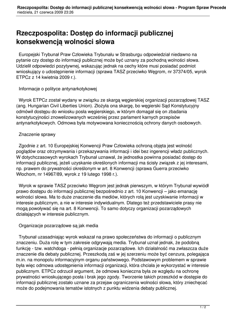Rzeczpospolita: Dostęp do informacji publicznej konsekwencją wolności słowa - Program Spraw Precede niedziela, 21 czerwca 2009 23:26 Rzeczpospolita: Dostęp do informacji publicznej konsekwencją wolności słowa Europejski Trybunał Praw Człowieka Trybunału w Strasburgu odpowiedział niedawno na pytanie czy dostęp do informacji publicznej może być uznany za pochodną wolności słowa. Udzielił odpowiedzi pozytywnej, wskazując jednak na cechy które musi posiadać podmiot wnioskujący o udostępnienie informacji (sprawa TASZ przeciwko Węgrom, nr 37374/05, wyrok ETPCz z 14 kwietnia 2009 r.). Informacje o polityce antynarkotykowej Wyrok ETPCz został wydany w związku ze skargą węgierskiej organizacji pozarządowej TASZ (ang. Hungarian Civil Liberties Union). Złożyła ona skargę, bo węgierski Sąd Konstytucyjny odmówił dostępu do wniosku posła węgierskiego, w którym domagał się on zbadania konstytucyjności znowelizowanych wcześniej przez parlament karnych przepisów antynarkotykowych. Odmowa była motywowana koniecznością ochrony danych osobowych. Znaczenie sprawy Zgodnie z art. 10 Europejskiej Konwencji Praw Człowieka ochroną objęta jest wolność poglądów oraz otrzymywania i przekazywania informacji i idei bez ingerencji władz publicznych. W dotychczasowych wyrokach Trybunał uznawał, że jednostka powinna posiadać dostęp do informacji publicznej, jeżeli uzyskanie określonych informacji ma ścisły związek z jej interesami, np. prawem do prywatności określonym w art. 8 Konwencji (sprawa Guerra przeciwko Włochom, nr 14967/89, wyrok z 19 lutego 1998 r.). Wyrok w sprawie TASZ przeciwko Węgrom jest jednak pierwszym, w którym Trybunał wywiódł prawo dostępu do informacji publicznej bezpośrednio z art. 10 Konwencji – jako emanację wolności słowa. Ma to duże znaczenie dla mediów, których rolą jest uzyskiwanie informacji w interesie publicznym, a nie w interesie indywidualnym. Dlatego też przedstawiciele prasy nie mogą powoływać się na art. 8 Konwencji. To samo dotyczy organizacji pozarządowych działających w interesie publicznym. Organizacje pozarządowe są jak media Trybunał uzasadniając wyrok wskazał na prawo społeczeństwa do informacji o publicznym znaczeniu. Duża rolę w tym zakresie odgrywają media. Trybunał uznał jednak, że podobną funkcję - tzw. watchdoga - pełnią organizacje pozarządowe. Ich działalność ma zwłaszcza duże znaczenie dla debaty publicznej. Przeszkodą zaś w jej szerzeniu może być cenzura, polegająca m.in. na monopolu informacyjnym organu państwowego. Podstawowym problemem w sprawie była więc odmowa udostępnienia informacji organizacji, która chciała je wykorzystać w interesie publicznym. ETPCz odrzucił argument, że odmowa konieczna była ze względu na ochronę prywatności wnioskującego posła i brak jego zgody. Tworzenie takich przeszkód w dostępie do informacji publicznej zostało uznane za przejaw ograniczenia wolności słowa, który zniechęcać może do podejmowania tematów istotnych z punktu widzenia debaty publicznej. 1/2 Rzeczpospolita: Dostęp do informacji publicznej konsekwencją wolności słowa - Program Spraw Preceden niedziela, 21 czerwca 2009 23:26 Brak jednak w wyroku Trybunału wskazania na generalne prawo każdego do dostępu do informacji publicznej. Trybunał uznał w komentowanej sprawie, że dostęp do informacji na gruncie art. 10 Konwencji jest uzależniony od wykazania działania w interesie publicznym – wydaje się więc, że informacji publicznej nie mogłaby żądać osoba indywidualna, która chciałaby wykorzystać ją w celach prywatnych. Zastanawiające jest w tym kontekście również to, dlaczego ETPCz widzi dostęp do informacji publicznej jako pochodną wolności wyrażania opinii (art. 10 ust. 1 zd. 1 Konwencji), a nie powołuje się wprost na prawo do otrzymywania i przekazywania informacji (art. 10 ust. 1 zd. 2 Konwencji). Na gruncie innych uregulowań dostęp do informacji publicznej nie musi wiązać się z wykazywanie żadnego interesu prawnego (por. art. 61 Konstytucji RP statuujący prawo dostępu do informacji publicznej w Polsce, czy art. 42 Karty Praw Podstawowych UE mówiący o dostępie do dokumentów UE; por. także www.access-info.org). Nowe standardy Wyrok Trybunału ma duże znaczenie dla poprawy standardów dostępu do informacji publicznej w krajach Europy Środkowej i Wschodniej. Obecnie obowiązująca polska ustawa o dostępie do informacji publicznej jest krytykowana jako nieskuteczna (m.in. ze względu na wprowadzenie licznych wyjątków od zasady dostępu do informacji publicznej i niejasne procedury odwoławcze). Dostrzegane jest również nadużywanie jako podstawy odmowy udostępnienia informacji powoływania ochrony danych osobowych i ochrony prywatności. W związku z wyrokiem w pełni możliwe staje się skarżenie Polski do ETPCz, w przypadku odmowy udostępniania informacji, która jest istotna z punktu widzenia interesu publicznego i debaty publicznej, jeżeli adresatem odmowy byłyby media, organizacje pozarządowe lub inni reprezentanci społeczeństwa obywatelskiego. Maciej Bernatt Koordynator Programu Spraw Precedensowych HFPCz Joomla SEF URLs by Artio 2/2