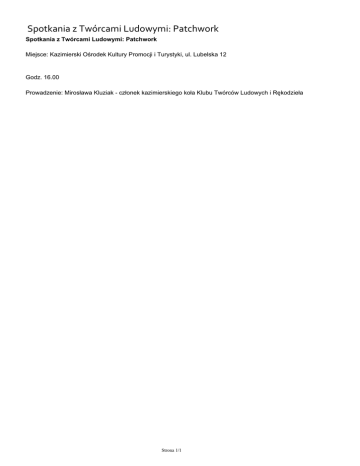 Spotkania z Twórcami Ludowymi: Patchwork Spotkania z Twórcami Ludowymi: Patchwork Miejsce: Kazimierski Ośrodek Kultury Promocji i Turystyki, ul. Lubelska 12 Godz. 16.00 Prowadzenie: Mirosława Kluziak - członek kazimierskiego koła Klubu Twórców Ludowych i Rękodzieła Strona 1/1 Powered by TCPDF (www.tcpdf.org)