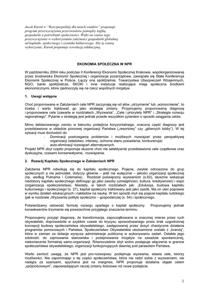 Jacek Kuroń w “Rzeczpospolitej dla moich wnuków” proponuje program przezwyciężenia przeciwieństw pomiędzy logiką gospodarki a potrzebami społeczności. Widzi on szanse tego przezwyciężenie w wykorzystaniu zależności gospodarki globalnej od kapitału społecznego i czynnika kulturowego. Aby tę szansę wykorzystać, Kuroń proponuje rewolucję edukacyjną. EKONOMIA SPOŁECZNA W NPR W październiku 2004 roku podczas II Konferencji Ekonomii Społecznej Krakowie, współorganizowanej przez środowiska Ekonomii Społecznej i organizacje pozarządowe, zawiązała się Stała Konferencja Ekonomii Społecznej w Polsce. Łączy ona spółdzielnie, Towarzystwa Ubezpieczeń Wzajemnych, NGO, banki spółdzielcze, SKOKi i inne instytucje realizujące misję społeczna środkami ekonomicznymi, które zjednoczyły się na rzecz wspólnych inicjatyw. 1. Uwagi wstępne Choć proponowane w Założeniach cele NPR zaczynają się od słów „utrzymanie” lub „wzmocnienie”, to trzeba i warto traktować go jako strategię zmiany. Przyjmujemy proponowaną diagnozę i proponowane cele (zawarte w rozdziałach „Wyzwania”, „Cele i priorytety NPR” i „Strategia rozwoju regionalnego”. Pytanie o strategię jest jednak przede wszystkim pytaniem o sposób osiągania celów. Mimo deklarowanego zwrotu w kierunku podejścia horyzontalnego, znaczna część diagnozy jest przedstawiona w układzie pionowej organizacji Państwa („resortowy” czy „głównych lobby”). W tej sytuacji musi dochodzić do - Dominacji postrzegania problemów i możliwych rozwiązań przez perspektywę organizacji (władztwo, interesy, ochrona stanu posiadania, konkurencja) - auto-eliminacji rozwiązań alternatywnych. Projekt NPR zbyt często proponuje słuszne choć nie selektywnie przedstawione cele cząstkowe oraz dyskusyjne, czasami konserwatywne, rozwiązania. 2. Rozwój Kapitału Społecznego w Założeniach NPR Założenia NPR odwołują się do kapitału społecznego. Pojęcie, zwykle odnoszone do grup społecznych a nie jednostek, dotyczy głównie – jeśli nie wyłącznie – jakości organizacji społecznej (np. według Putnama i Colemana). Rozdział poświęcony wyzwaniom (s.62), słusznie wskazuje niedobory kapitału społecznego definiując go jako zasoby (umiejętności, kultura, kreatywność) i więzi (organizacja społeczeństwa). Niestety, w takich rozdziałach jak: „Edukacja, budowa kapitału kulturowego i społecznego”(s. 27), kapitał społeczny traktowany jest jako zasób. Ma on ulec poprawie w wyniku działań edukacyjnych i nakładów na naukę. W ten sposób myli się pojęcie kapitału ludzkiego (jak w rozdziale „Wyzwania polityki społeczno – gospodarczej (s. 54) i społecznego. Potwierdzamy celowość formuły rozwoju opartego o kapitał społeczny. konsekwentne trzymanie się powszechnie przyjętego znaczenia terminu Proponujemy jednak Proponujemy przyjąć diagnozę, że transformacja, zapoczątkowana w znacznej mierze przez ruch obywatelski, doprowadziła w szybkim czasie do kryzysu spowodowanego przez brak uzgodnionej koncepcji budowy społeczeństwa obywatelskiego, zastępowanej przez dosyć chaotyczne działania programów pomocowych i Państwa. Społeczeństwo Obywatelskie utożsamione zostało z „branżą”, która w zamian za dotacje wyręcza administracje publiczną w wykonywaniu zadań. Osłabła jego zdolność: do zajmowania stanowiska i podejmowania inicjatyw na zasadzie spontanicznej, niekoniecznie formalnej samo-organizacji. Równocześnie zbyt wolno postępuje włączenie w granice społeczeństwa obywatelskiego, organizacji funkcjonujących dawniej pod parasolem Państwa. Warto zwrócić uwagę, że NPR jest pro-rozwojowy: podejmuje wyzwania, stawia cele, tworzy możliwości. Nie zapominając o tej części społeczeństwa, która nie radzi sobie z wyzwaniami, nie nadąża za szansami, spychana jest na margines, NPR proponuje działania objęte celem „spójnościowym”, zapowiadającym raczej zmiany ilościowe niż nowe podejście. 1 3. Proponowany program horyzontalny Rozwój Społeczeństwa Obywatelskiego Proponujemy aby wśród zapowiadanych programów horyzontalnych NPR, znalazł się program lub blok programowy poświęcony społeczeństwu obywatelskiemu jako niezbędnemu partnerowi w procesach rozwoju. 3.1. Program ten powinien być powiązany, a raczej wykorzystany przez zapowiedzianą Narodową Strategią Rozwoju Regionalnego. Możliwości kapitału społecznego powinny stanowić także instrumenty realizacji szeregu proponowanych priorytetów (programów sektorowych). Szczególnie dotyczy to: a) Decentralizacji i terytorializacji zarządzania rozwojem, schodzącej do poziomu subregionalnego i lokalnego b) Współpracy między regionami c) Wzrostu działań partnerskich (nie tylko inwestycyjne PPP i współpracy przy realizacji zadań publicznych pomiędzy władzą, przedsiębiorstwami i NGO) d) Praktycznego wdrożenia zasady subsydiarności, wykorzystania dorobku „trzeciego sektora” i Ekonomii Społecznej, szczególnie w obszarach gdzie słabo radzi sobie zarówno administracja publiczna jak i sektor komercyjny. 3.2. Program powinien tworzyć możliwości intensywnego wykorzystania inicjatyw i wartości kapitału społecznego w takich działaniach jak: a) Rozwój obszarów wiejskich i małych miast b) Przeciwdziałanie marginalizacji terytoriów c) Rozwój oparty o innowacje ale i o inicjatywy, zasoby lokalne i dziedzictwo d) Tworzenie przedsiębiorstw i miejsc pracy w różnych formułach, dostępnych dla różnych typów aktywności e) Rewolucja edukacyjna i kulturalna f) Lepsza, bardziej efektywna walka z wykluczeniem i pomoc społeczna 3.3. Dziedziny szczególnie wartościowych inicjatyw to: a) Ochrona zdrowia (zdrowotne ubezpieczenia wzajemne, być może świadczenie usług) b) Kultura i edukacja c) Pomoc społeczna (do rozwinięcia) odmienne jakości i filozofia d) Rozwój regionalny i lokalny e) Mieszkalnictwo f) Przedsiębiorc