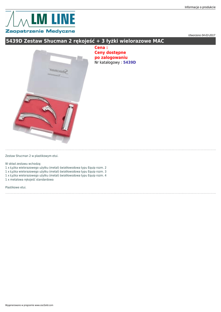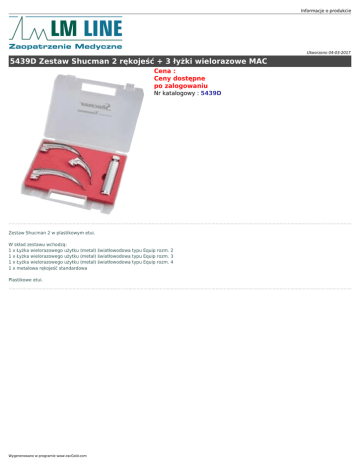 Informacje o produkcie Utworzono 04-03-2017 5439D Zestaw Shucman 2 rękojeść + 3 łyżki wielorazowe MAC Cena : Ceny dostępne po zalogowaniu Nr katalogowy : 5439D Zestaw Shucman 2 w plastikowym etui. W skład zestawu wchodzą: 1 x Łyżka wielorazowego użytku (metal) światłowodowa typu Equip rozm. 2 1 x Łyżka wielorazowego użytku (metal) światłowodowa typu Equip rozm. 3 1 x Łyżka wielorazowego użytku (metal) światłowodowa typu Equip rozm. 4 1 x metalowa rękojeść standardowa Plastikowe etui. Wygenerowano w programie www.oscGold.com