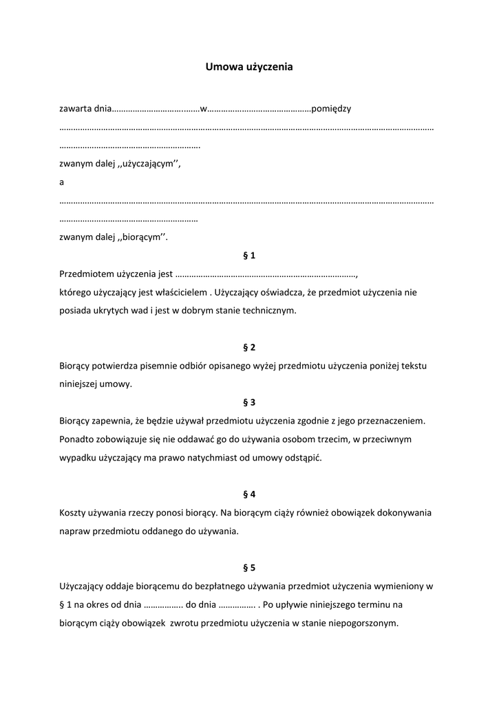 Umowa użyczenia zawarta dnia…………………………..……w………………………………………pomiędzy ……………………………………………………………………………………………………………………………………………… ……………………………………………………. zwanym dalej ,,użyczającym’’, a ……………………………………………………………………………………………………………………………………………… …………………………………………………… zwanym dalej ,,biorącym’’. §1 Przedmiotem użyczenia jest ……………………………………………………………………, którego użyczający jest właścicielem . Użyczający oświadcza, że przedmiot użyczenia nie posiada ukrytych wad i jest w dobrym stanie technicznym. §2 Biorący potwierdza pisemnie odbiór opisanego wyżej przedmiotu użyczenia poniżej tekstu niniejszej umowy. §3 Biorący zapewnia, że będzie używał przedmiotu użyczenia zgodnie z jego przeznaczeniem. Ponadto zobowiązuje się nie oddawad go do używania osobom trzecim, w przeciwnym wypadku użyczający ma prawo natychmiast od umowy odstąpid. §4 Koszty używania rzeczy ponosi biorący. Na biorącym ciąży również obowiązek dokonywania napraw przedmiotu oddanego do używania. §5 Użyczający oddaje biorącemu do bezpłatnego używania przedmiot użyczenia wymieniony w § 1 na okres od dnia …………….. do dnia ……………. . Po upływie niniejszego terminu na biorącym ciąży obowiązek zwrotu przedmiotu użyczenia w stanie niepogorszonym. §6 Wszelkie ewentualne zmiany umowy mogą nastąpid tylko w formie pisemnej pod rygorem nieważności. §7 W sprawach nie uregulowanych w umowie mają zastosowanie przepisy Kodeksu cywilnego. §8 Umowa zostaje sporządzona w dwóch jednobrzmiących egzemplarzach, po jednym dla każdej Ze stron. ……………………………….. Użyczający …………………………... Biorący do używania