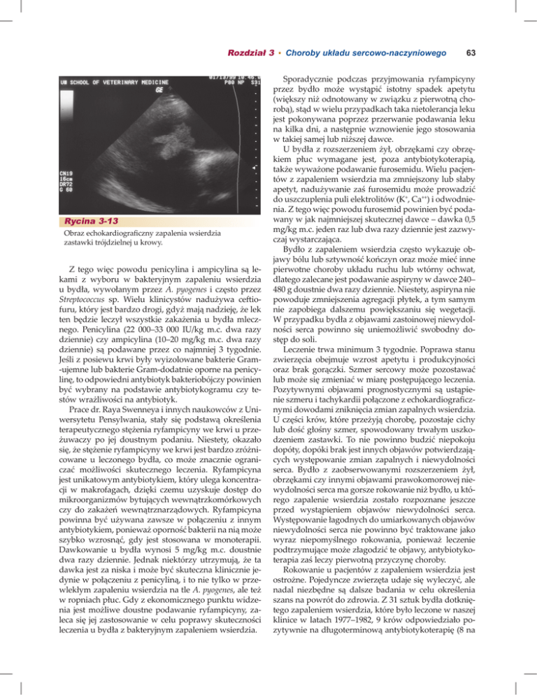 Rozdział 3 ▪ Choroby układu sercowo-naczyniowego Rycina 3-13 Obraz echokardiograficzny zapalenia wsierdzia zastawki trójdzielnej u krowy. Z tego więc powodu penicylina i ampicylina są lekami z wyboru w bakteryjnym zapaleniu wsierdzia u bydła, wywołanym przez A. pyogenes i często przez Streptococcus sp. Wielu klinicystów nadużywa ceftiofuru, który jest bardzo drogi, gdyż mają nadzieję, że lek ten będzie leczył wszystkie zakażenia u bydła mlecznego. Penicylina (22 000–33 000 IU/kg m.c. dwa razy dziennie) czy ampicylina (10–20 mg/kg m.c. dwa razy dziennie) są podawane przez co najmniej 3 tygodnie. Jeśli z posiewu krwi były wyizolowane bakterie Gram-ujemne lub bakterie Gram-dodatnie oporne na penicylinę, to odpowiedni antybiotyk bakteriobójczy powinien być wybrany na podstawie antybiotykogramu czy testów wrażliwości na antybiotyk. Prace dr. Raya Swenneya i innych naukowców z Uniwersytetu Pensylwania, stały się podstawą określenia terapeutycznego stężenia ryfampicyny we krwi u przeżuwaczy po jej doustnym podaniu. Niestety, okazało się, że stężenie ryfampicyny we krwi jest bardzo zróżnicowane u leczonego bydła, co może znacznie ograniczać możliwości skutecznego leczenia. Ryfampicyna jest unikatowym antybiotykiem, który ulega koncentracji w makrofagach, dzięki czemu uzyskuje dostęp do mikroorganizmów bytujących wewnątrzkomórkowych czy do zakażeń wewnątrznarządowych. Ryfampicyna powinna być używana zawsze w połączeniu z innym antybiotykiem, ponieważ oporność bakterii na nią może szybko wzrosnąć, gdy jest stosowana w monoterapii. Dawkowanie u bydła wynosi 5 mg/kg m.c. doustnie dwa razy dziennie. Jednak niektórzy utrzymują, że ta dawka jest za niska i może być skuteczna klinicznie jedynie w połączeniu z penicyliną, i to nie tylko w przewlekłym zapaleniu wsierdzia na tle A. pyogenes, ale też w ropniach płuc. Gdy z ekonomicznego punktu widzenia jest możliwe doustne podawanie ryfampicyny, zaleca się jej zastosowanie w celu poprawy skuteczności leczenia u bydła z bakteryjnym zapaleniem wsierdzia. 63 Sporadycznie podczas przyjmowania ryfampicyny przez bydło może wystąpić istotny spadek apetytu (większy niż odnotowany w związku z pierwotną chorobą), stąd w wielu przypadkach taka nietolerancja leku jest pokonywana poprzez przerwanie podawania leku na kilka dni, a następnie wznowienie jego stosowania w takiej samej lub niższej dawce. U bydła z rozszerzeniem żył, obrzękami czy obrzękiem płuc wymagane jest, poza antybiotykoterapią, także wyważone podawanie furosemidu. Wielu pacjentów z zapaleniem wsierdzia ma zmniejszony lub słaby apetyt, nadużywanie zaś furosemidu może prowadzić do uszczuplenia puli elektrolitów (K+, Ca++) i odwodnienia. Z tego więc powodu furosemid powinien być podawany w jak najmniejszej skutecznej dawce – dawka 0,5 mg/kg m.c. jeden raz lub dwa razy dziennie jest zazwyczaj wystarczająca. Bydło z zapaleniem wsierdzia często wykazuje objawy bólu lub sztywność kończyn oraz może mieć inne pierwotne choroby układu ruchu lub wtórny ochwat, dlatego zalecane jest podawanie aspiryny w dawce 240– 480 g doustnie dwa razy dziennie. Niestety, aspiryna nie powoduje zmniejszenia agregacji płytek, a tym samym nie zapobiega dalszemu powiększaniu się wegetacji. W przypadku bydła z objawami zastoinowej niewydolności serca powinno się uniemożliwić swobodny dostęp do soli. Leczenie trwa minimum 3 tygodnie. Poprawa stanu zwierzęcia obejmuje wzrost apetytu i produkcyjności oraz brak gorączki. Szmer sercowy może pozostawać lub może się zmieniać w miarę postępującego leczenia. Pozytywnymi objawami prognostycznymi są ustąpienie szmeru i tachykardii połączone z echokardiograficznymi dowodami zniknięcia zmian zapalnych wsierdzia. U części krów, które przeżyją chorobę, pozostaje cichy lub dość głośny szmer, spowodowany trwałym uszkodzeniem zastawki. To nie powinno budzić niepokoju dopóty, dopóki brak jest innych objawów potwierdzających występowanie zmian zapalnych i niewydolności serca. Bydło z zaobserwowanymi rozszerzeniem żył, obrzękami czy innymi objawami prawokomorowej niewydolności serca ma gorsze rokowanie niż bydło, u którego zapalenie wsierdzia zostało rozpoznane jeszcze przed wystąpieniem objawów niewydolności serca. Występowanie łagodnych do umiarkowanych objawów niewydolności serca nie powinno być traktowane jako wyraz niepomyślnego rokowania, ponieważ leczenie podtrzymujące może złagodzić te objawy, antybiotykoterapia zaś leczy pierwotną przyczynę choroby. Rokowanie u pacjentów z zapaleniem wsierdzia jest ostrożne. Pojedyncze zwierzęta udaje się wyleczyć, ale nadal niezbędne są dalsze badania w celu określenia szans na powrót do zdrowia. Z 31 sztuk bydła dotkniętego zapaleniem wsierdzia, które było leczone w naszej klinice w latach 1977–1982, 9 krów odpowiedziało pozytywnie na długoterminową antybiotykoterapię (8 na