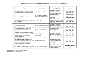 PRZYRODNICZY UNIWERSYTET TRZECIEGO WIEKU – semestr zimowy 2016/2017 Temat Prowadzący 7 grudnia 2016 godz. 10.00, sala D Dr Anita SchroeterZakrzewska Wydział Ogrodnictwa i Architektury Krajobrazu, Katedra Roślin Ozdobnych 24 stycznia 2017 godz. 17.00, sala A Dr Monika Wojcieszak Wydział EkonomicznoSpołeczny, Katedra Rynku i Marketingu 7 lutego 2017 godz. 17.00, sala A Dr inż. Anna Malinowska Wydział Nauk o Żywności i Żywieniu, Katedra Higieny Żywienia Człowieka Wymagane zapisy na zajęcia 1. Dr Barbara Frąszczak 2. Jak rośliny reagują na stresy? Dr inż. Karolina Ratajczak Mgr Dominika Radzikowska 3. Ochrona praw konsumentów, czyli jak nie dać się oszukać . Agnieszka Ciucias 4. Kwiaty w naszym życiu. Dr hab. Agnieszka Krzymińska 6. 7. 8. Co zrobić aby pamiętać swoje sny? Komfort użytkowania materacy meblowych. Użytkowe rośliny ozdobne – możliwość wykorzystania roślin ozdobnych nie tylko do dekoracji, ale także w kuchni, kosmetyce, farmacji. Przedsiębiorczość dla pokolenia X – różnica pokoleniowa, przedsiębiorcze projekty gospodarcze podejmowane przez seniorów, ćwiczenia warsztatowe na koncentrację i dobrą pracę mózgu. Czy odżywiasz się prawidłowo – warsztaty. Sala A oraz sala D – ul. Wojska Polskiego 28 Sala Biocentrum – ul. Dojazd 11 Termin Wydział Ogrodnictwa i Architektury Krajobrazu, Katedra Warzywnictwa Wydział Rolnictwa i Bioinżynierii, Katedra Agronomii Zastępca Dyrektora Delegatury Urzędu Ochrony Konkurencji i Konsumentów w Poznaniu Wydział Ogrodnictwa i Architektury Krajobrazu, Katedra Roślin Ozdobnych Wydział Technologii Drewna, Katedra Meblarstwa Żeń-szeń i spółka – czyli zioła na ciężkie czasy i możliwość ich uprawy w ogrodzie. 5. Wydział, Katedra Dr inż. Łukasz Matwiej 15 listopada 2016 godz. 17.00, sala A 22 listopada 2016 godz. 17.00, sala Biocentrum 13 grudnia 2016 godz. 17.00, sala A 10 stycznia 2017 godz. 17.00, sala A