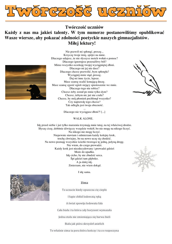 Twórczość uczniów Każdy z nas ma jakieś talenty. W tym numerze postanowiliśmy opublikować Wasze wiersze, aby pokazać zdolności poetyckie naszych gimnazjalistów. Miłej lektury! Nie pozwól mi spłonąć, proszę... Krzyczę twoje imię, spójrz na mnie. Dlaczego udajesz, że nie słyszysz moich wołań o pomoc? Dlaczego ignorujesz przeraźliwy ból? Mimo wszystko oczekuję twojej wyciągniętej dłoni. Dlaczego mi jej nie dasz? Dlaczego chcesz pozwolić, bym spłonęła? Wyciągnij mnie stąd, proszę. Daj mi inne życie, lepsze. Masz szansę ocalić konającą duszę. Masz szansę zgasić ogień siejący spustoszenie we mnie. Dlaczego tego nie robisz? Chcesz żeby został po mnie tylko dym? Chcesz, żebym nic już nie czuła? Chcesz, by mój płomień pochłonął wszystko? Czy naprawdę tego chcesz? Tak odległa jest twoja obecność. ... Dlaczego nie wyciągasz dłoni?! [...] WALK ALONE. Idę przed siebie i już tylko marzenia trzymają mnie tutaj, na tej właściwej drodze. Słyszę ciszę, dobitnie dźwięczy wszędzie wokół, bo nie mogę na nikogo liczyć. Na nikogo nie mogę liczyć. Niepewnie stawiam i odmierzam każdy kolejny krok, trochę chwiejny, bo na nowo uczę się chodzić. Na nowo poznaję wszystkie ścieżki tworzące tę jedną, jedyną drogę. Nie wiem, do czego prowadzi. Każdy krok jest niezdecydowany i prowadzi gdzieś Może do upadku. Idę cicho, by nie zbudzić serca. Śpi gdzieś tam głęboko. A ja dalej idę. Zmierzam, nie wiem dokąd. I idę sama. Zima To uczucie kiedy opuszcza cię ciepło I łapie chłód lodowatą ręką A świat spowija lodowata fala Cała biała i ta która cały horyzont wymazała Jedna stała nie zmieniająca się barwa bieli Biała jak pióra skrzydeł anielich To właśnie zima ta pora która kończy i ta co rozpoczyna 2