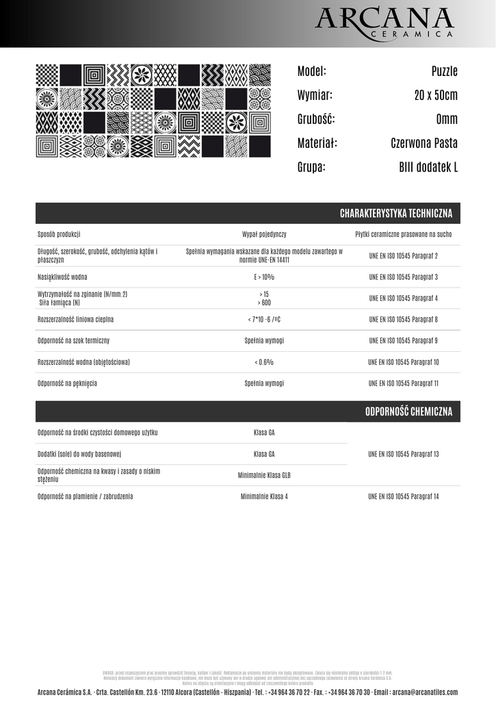 Model: Puzzle Wymiar: 20 x 50cm Grubość: 0mm Materiał: Czerwona Pasta Grupa: BIII dodatek L CHARAKTERYSTYKA TECHNICZNA Sposób produkcji Długość, szerokość, grubość, odchylenia kątów i płaszczyzn Nasiąkliwość wodna Wytrzymałość na zginanie (N/mm.2) Siła łamiąca (N) Rozszerzalność liniowa cieplna Odporność na szok termiczny Rozszerzalność wodna (objętościowa) Odporność na pęknięcia Wypał pojedynczy Płytki ceramiczne prasowane na sucho Spełnia wymagania wskazane dla każdego modelu zawartego w normie UNE-EN 14411 UNE EN ISO 10545 Paragraf 2 E > 10% UNE EN ISO 10545 Paragraf 3 > 15 > 600 UNE EN ISO 10545 Paragraf 4 < 7*10 -6 /ºC UNE EN ISO 10545 Paragraf 8 Spełnia wymogi UNE EN ISO 10545 Paragraf 9 < 0.6% UNE EN ISO 10545 Paragraf 10 Spełnia wymogi UNE EN ISO 10545 Paragraf 11 ODPORNOŚĆ CHEMICZNA Odporność na środki czystości domowego użytku Klasa GA Dodatki (sole) do wody basenowej Klasa GA Odporność chemiczna na kwasy i zasady o niskim stężeniu Odporność na plamienie / zabrudzenia UNE EN ISO 10545 Paragraf 13 Minimalnie Klasa GLB Minimalnie Klasa 4 UNE EN ISO 10545 Paragraf 14 UWAGA: przed rozpoczęciem prac prosimy sprawdzić tonację, kaliber i jakość. Reklamacje po ułożeniu materiału nie będą akceptowane. Zaleca się minimalny odstęp o szerokości 1-2 mm. Niniejszy dokument zawiera wyłącznie informacje handlowe, nie może być używany ani w drodze sądowej ani administracyjnej bez uprzedniego zezwolenia ze strony Arcana Ceràmica S.A. Kolory na zdjęciu są orientacyjne i mogą odbiegać od rzeczywistego koloru produktu Arcana Cerámica S.A. · Crta. Castellón Km. 23.6 · 12110 Alcora (Castellón - Hiszpania) · Tel. : +34 964 36 70 22 · Fax. : +34 964 36 70 30 · Email : [email protected] Powered by TCPDF (www.tcpdf.org)
