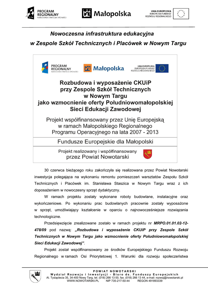 Nowoczesna infrastruktura edukacyjna w Zespole Szkół Technicznych i Placówek w Nowym Targu 30 czerwca bieżącego roku zakończyła się realizowana przez Powiat Nowotarski inwestycja polegająca na wykonaniu remontu pomieszczeń warsztatów Zespołu Szkół Technicznych i Placówek im. Stanisława Staszica w Nowym Targu wraz z ich doposażeniem w nowoczesny sprzęt dydaktyczny. W ramach projektu zostały wykonane roboty budowlane, instalacyjne oraz wykończeniowe. Po wykonaniu prac budowlanych pracownie zostały wyposażone w sprzęt, umożliwiający kształcenie w oparciu o najnowocześniejsze rozwiązania technologiczne. Przedsięwzięcie zrealizowane zostało w ramach projektu nr MRPO.01.01.02-12478/09 pod nazwą: „Rozbudowa i wyposażenie CKUiP przy Zespole Szkół Technicznych w Nowym Targu jako wzmocnienie oferty Południowomałopolskiej Sieci Edukacji Zawodowej”. Projekt został współfinansowany ze środków Europejskiego Funduszu Rozwoju Regionalnego w ramach Osi Priorytetowej 1. Warunki dla rozwoju społeczeństwa POW IAT NOW OTARSKI W ydział Rozwoju i Inwestycji - Biuro ds. Funduszy Europejskich Al. Tysiąclecia 35, 34-400 Nowy Targ, tel. (018) 266 13 00, fax. (018) 266 13 44, e-mail: [email protected] WWW.NOWOTARSKI.PL NIP 735-217-50-44 REGON 491893339 opartego na wiedzy, Działania 1.1. Poprawa jakości usług edukacyjnych, Schematu B: Rozwój infrastruktury kształcenia ustawicznego oraz kształcenia zawodowego. Projekt został wybrany do dofinansowania w dniu 25.02.2010. Uchwałą nr 209/2010 Zarządu Województwa Małopolskiego, a umowa o dofinansowanie została podpisana w dniu 20.05.2010r. Realizacja przedmiotowego projektu rozpoczęła się 15.09.2009 roku. Całkowity koszt przedsięwzięcia to kwota 5 573 257,41 PLN, z czego dofinansowanie ze środków Europejskiego Funduszu Rozwoju Regionalnego wynosi 2 999 981,29 PLN i stanowi 56,01% kosztów kwalifikowalnych. Pozostałe koszty poniesione zostały ze środków Powiatu Nowotarskiego. Realizacja inwestycji niewątpliwie przyczyni się do poprawy dostępności do infrastruktury szkolnictwa zawodowego i ustawicznego mieszkańców południowej Małopolski oraz udoskonalenie poziomu kształcenia umiejętności zawodowych służące zwiększeniu szans na lokalnym i regionalnym rynku pracy. Inwestycja ta wpłynęła na poprawę oferty edukacyjnej Powiatu Nowotarskiego. Podniesiony został standard kształcenia, poprawie uległy warunki kształcenia młodzieży. Dzięki wsparciu ze środków Europejskiego Funduszu Rozwoju Regionalnego w ramach Małopolskiego Regionalnego Programu Operacyjnego na lata 2007-2013, organ prowadzący oddał do użytku następujące pracownie dydaktyczne: 1) diagnostyki samochodowej; 2) diagnostyki i napraw podzespołów samochodowych; 3) obróbki materiału: a) obrabiarek CNC, b) spawalnicza; 4) miernicza; 5) techniki budowlanej i drogowej; 6) projektowo-obliczeniowa; 7) automatyki przemysłowej. Dzięki realizacji przedmiotowego projektu Zespół Szkół Technicznych i Placówek w Nowym Targu może przygotować atrakcyjną ofertę dydaktyczną, zapewniając naukę w warunkach odpowiadających wyzwaniom współczesnego rynku pracy, stwarzającą uczniom dobre perspektywy na podjęcie pracy po ukończeniu nauki oraz dorosłym na dokształcanie i poznanie nowych technologii. POW IAT NOW OTARSKI W ydział Rozwoju i Inwestycji - Biuro ds. Funduszy Europejskich Al. Tysiąclecia 35, 34-400 Nowy Targ, tel. (018) 266 13 00, fax. (018) 266 13 44, e-mail: [email protected] WWW.NOWOTARSKI.PL NIP 735-217-50-44 REGON 491893339