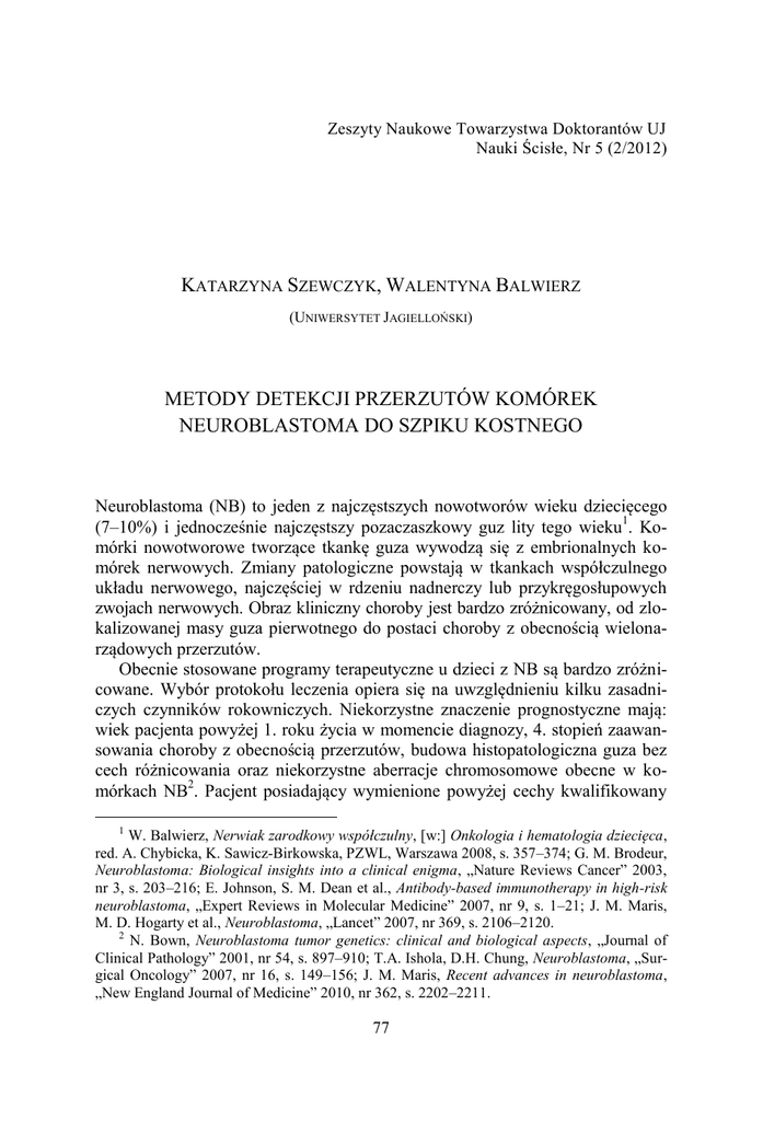 Zeszyty Naukowe Towarzystwa Doktorantów UJ Nauki Ścisłe, Nr 5 (2/2012) KATARZYNA SZEWCZYK, WALENTYNA BALWIERZ (UNIWERSYTET JAGIELLOŃSKI) METODY DETEKCJI PRZERZUTÓW KOMÓREK NEUROBLASTOMA DO SZPIKU KOSTNEGO Neuroblastoma (NB) to jeden z najczęstszych nowotworów wieku dziecięcego (7–10%) i jednocześnie najczęstszy pozaczaszkowy guz lity tego wieku1. Komórki nowotworowe tworzące tkankę guza wywodzą się z embrionalnych komórek nerwowych. Zmiany patologiczne powstają w tkankach współczulnego układu nerwowego, najczęściej w rdzeniu nadnerczy lub przykręgosłupowych zwojach nerwowych. Obraz kliniczny choroby jest bardzo zróżnicowany, od zlokalizowanej masy guza pierwotnego do postaci choroby z obecnością wielonarządowych przerzutów. Obecnie stosowane programy terapeutyczne u dzieci z NB są bardzo zróżnicowane. Wybór protokołu leczenia opiera się na uwzględnieniu kilku zasadniczych czynników rokowniczych. Niekorzystne znaczenie prognostyczne mają: wiek pacjenta powyżej 1. roku życia w momencie diagnozy, 4. stopień zaawansowania choroby z obecnością przerzutów, budowa histopatologiczna guza bez cech różnicowania oraz niekorzystne aberracje chromosomowe obecne w komórkach NB2. Pacjent posiadający wymienione powyżej cechy kwalifikowany 1 W. Balwierz, Nerwiak zarodkowy współczulny, [w:] Onkologia i hematologia dziecięca, red. A. Chybicka, K. Sawicz-Birkowska, PZWL, Warszawa 2008, s. 357–374; G. M. Brodeur, Neuroblastoma: Biological insights into a clinical enigma, „Nature Reviews Cancer” 2003, nr 3, s. 203–216; E. Johnson, S. M. Dean et al., Antibody-based immunotherapy in high-risk neuroblastoma, „Expert Reviews in Molecular Medicine” 2007, nr 9, s. 1–21; J. M. Maris, M. D. Hogarty et al., Neuroblastoma, „Lancet” 2007, nr 369, s. 2106–2120. 2 N. Bown, Neuroblastoma tumor genetics: clinical and biological aspects, „Journal of Clinical Pathology” 2001, nr 54, s. 897–910; T.A. Ishola, D.H. Chung, Neuroblastoma, „Surgical Oncology” 2007, nr 16, s. 149–156; J. M. Maris, Recent advances in neuroblastoma, „New England Journal of Medicine” 2010, nr 362, s. 2202–2211. 77 Katarzyna Szewczyk, Walentyna Balwierz __________________________________________________________________________________________________________________________________________________________________________________________________________________________________ jest do grupy wysokiego ryzyka niepowodzenia leczenia, stanowiącej około 50% wszystkich przypadków3. Wyniki leczenia w tej grupie dzieci z NB pozostają nadal niezadowalające. Pomimo zwiększenia intensywności terapii 5-letnie EFS (ang. event free survival) pozostaje na poziomie 40%4. Jedną z przyczyn niepowodzenia leczenia może być obecność przetrwałych po chemioterapii, opornych na dostępne cytostatyki, nowotworowych komórek macierzystych, które mogą zagnieżdżać się zwłaszcza w jamach szpikowych5. Dlatego istotnym elementem diagnostyki w NB jest badanie szpiku kostnego w celu potwierdzenia lub wykluczenia obecności komórek nowotworowych zarówno w trakcie diagnozy, jak i podczas prowadzonego leczenia. Dzięki istniejącym technikom laboratoryjnym możliwa jest detekcja nawet pojedynczych komórek NB i monitorowanie tzw. minimalnej choroby resztkowej (ang. minimal residual disease, MRD). MIKROSKOPIA ŚWIETLNA Jest to technika bazująca na ocenie cytomorfologicznej rozmazów szpiku kostnego, barwionych odczynnikiem Wrighta-Giemsy, w poszukiwaniu komórek nowotworowych. Komórki NBL są nieznacznie lub zdecydowanie większe od erytrocytów. Ich charakterystyczną cechą morfologiczną jest okrągły kształt i bardzo duże jądro komórkowe przy znikomej ilości cytoplazmy. Nie są to jednak na tyle specyficzne własności, aby rozpoznać komórki nowotworowe, zwłaszcza pojedyncze, pomiędzy różnymi komórkami hematopoetycznymi. Detekcja komórek NB w szpiku kostnym jest dodatkowo utrudniona przez ich nierównomierny rozkład i tendencję do tworzenia skupisk zwanych pseudorozetkami6. Podsumowując, klasyczna ocena cytomorfologiczna szpiku kostnego stosowana do wykrywania komórek NB, pomimo pełnej akceptacji INSS (ang. International Neuroblastoma Staging System), jest metodą o niskiej czułości. Pozwala na postawienie pozytywnego wyniku dopiero wtedy, gdy komórki guza stanowią ponad 0,1%, a w niektórych przypadkach nawet 10% komórek szpiku7. 3 W. Balwierz, op. cit., s. 357–374; J. M. Maris, M. D. Hogarty et al., Neuroblastoma, op. cit., s. 2106–2120; J. M. Maris, Recent advances in neuroblastoma, op. cit., s. 2202–2211. 4 J. Hara, Development of treatment strategies for advanced neuroblastoma, „International Journal of Clinical Oncology” 2012, nr 17, s. 196–203. 5 J. M. Maris, Recent advances in neuroblastoma, op. cit., s. 2202–2211; T. Kuroda, Cellular kinetics of neuroblastoma and the role of surgery, „Pediatric Surgery International” 2011, nr 27, s. 913–917; S. Ootsuka, S. Asami et al., Useful markers for detecting minimal residual disease in cases of neuroblastoma, „Biological and Pharmaceutical Bulletin” 2008, nr 31, s. 1071–1074. 6 A. Rajwanshi, R. Srinivas et al., Malignant small round cell tumors, „Journal of Cytology” 2009, nr 26, s. 1–10. 7 P. F. Ambros, G. Mehes et al., Disseminated tumor cells in the bone marrow – Chances and consequences of microscopical detection methods, „Cancer Letters” 2003, nr 197, s. 29–34. 78 Metody detekcji przerzutów komórek neuroblastoma do szpiku kostnego __________________________________________________________________________________________________________________________________________________________________________________________________________________________________ IMMUNOCYTOCHEMIA ENZYMATYCZNA I FLUORESCENCYJNA (ANG. IMMUNOCYTOCHEMISTRY) W metodzie immunocytochemicznej detekcja badanych komórek odbywa się dzięki specyficznemu wiązaniu przeciwciała z antygene