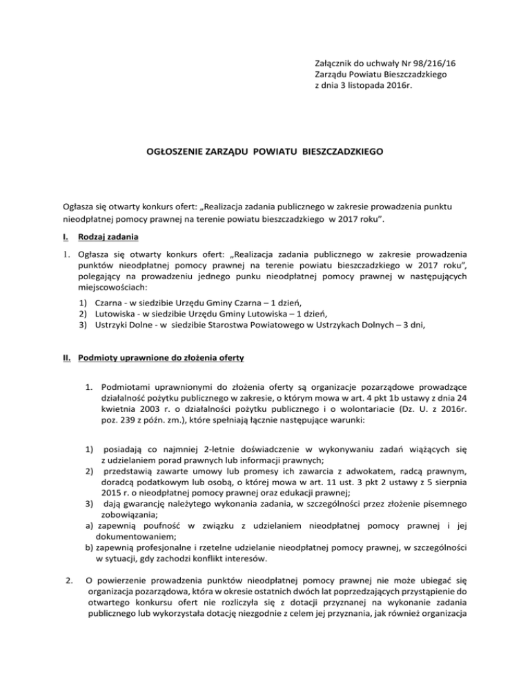 Załącznik do uchwały Nr 98/216/16 Zarządu Powiatu Bieszczadzkiego z dnia 3 listopada 2016r. OGŁOSZENIE ZARZĄDU POWIATU BIESZCZADZKIEGO Ogłasza się otwarty konkurs ofert: „Realizacja zadania publicznego w zakresie prowadzenia punktu nieodpłatnej pomocy prawnej na terenie powiatu bieszczadzkiego w 2017 roku”. I. Rodzaj zadania 1. Ogłasza się otwarty konkurs ofert: „Realizacja zadania publicznego w zakresie prowadzenia punktów nieodpłatnej pomocy prawnej na terenie powiatu bieszczadzkiego w 2017 roku”, polegający na prowadzeniu jednego punku nieodpłatnej pomocy prawnej w następujących miejscowościach: 1) Czarna - w siedzibie Urzędu Gminy Czarna – 1 dzień, 2) Lutowiska - w siedzibie Urzędu Gminy Lutowiska – 1 dzień, 3) Ustrzyki Dolne - w siedzibie Starostwa Powiatowego w Ustrzykach Dolnych – 3 dni, II. Podmioty uprawnione do złożenia oferty 1. Podmiotami uprawnionymi do złożenia oferty są organizacje pozarządowe prowadzące działalność pożytku publicznego w zakresie, o którym mowa w art. 4 pkt 1b ustawy z dnia 24 kwietnia 2003 r. o działalności pożytku publicznego i o wolontariacie (Dz. U. z 2016r. poz. 239 z późn. zm.), które spełniają łącznie następujące warunki: 1) posiadają co najmniej 2-letnie doświadczenie w wykonywaniu zadań wiążących się z udzielaniem porad prawnych lub informacji prawnych; 2) przedstawią zawarte umowy lub promesy ich zawarcia z adwokatem, radcą prawnym, doradcą podatkowym lub osobą, o której mowa w art. 11 ust. 3 pkt 2 ustawy z 5 sierpnia 2015 r. o nieodpłatnej pomocy prawnej oraz edukacji prawnej; 3) dają gwarancję należytego wykonania zadania, w szczególności przez złożenie pisemnego zobowiązania; a) zapewnią poufność w związku z udzielaniem nieodpłatnej pomocy prawnej i jej dokumentowaniem; b) zapewnią profesjonalne i rzetelne udzielanie nieodpłatnej pomocy prawnej, w szczególności w sytuacji, gdy zachodzi konflikt interesów. 2. O powierzenie prowadzenia punktów nieodpłatnej pomocy prawnej nie może ubiegać się organizacja pozarządowa, która w okresie ostatnich dwóch lat poprzedzających przystąpienie do otwartego konkursu ofert nie rozliczyła się z dotacji przyznanej na wykonanie zadania publicznego lub wykorzystała dotację niezgodnie z celem jej przyznania, jak również organizacja pozarządowa, z którą starosta rozwiązał umowę. Termin dwóch lat biegnie odpowiednio od dnia rozliczenia się z dotacji i zwrotu nienależnych środków wraz z odsetkami albo od dnia rozwiązania umowy. III. Wysokość środków publicznych przeznaczonych na realizację zadania Na realizację zadania planuje się przeznaczyć dotację w wysokości 60 726,00 zł (słownie: sześćdziesiąt tysięcy złotych siedemset dwadzieścia sześć złotych 00/100) IV. Zasady przyznawania dotacji 1. Zasady przyznawania dotacji na powierzenie realizacji zadania publicznego określają przepisy: - ustawy z dnia 5 sierpnia 2015 r. o nieodpłatnej pomocy prawnej oraz edukacji prawnej ( Dz. U. z 2015 r., poz. 1255), - ustawy z dnia 24 kwietnia 2003 r. o działalności pożytku publicznego i o wolontariacie ( tj. Dz. U. z 2016 r., poz. poz. 239 z późn. zm.), - ustawy z dnia 27 sierpnia 2009 r. o finansach publicznych (Dz. U. z 2013 r., poz. 885 z późn. zm.). 2. Dotacja przyznana organizacji pozarządowej zostanie przekazana po zawarciu umowy o wykonanie zadania publicznego na warunkach w niej określonych. V. Termin i warunki realizacji zadania 1. Realizacja zadania publicznego powinna nastąpić w terminie od 2 stycznia do 29 grudnia 2017 roku w przeciętnym wymiarze 5 dni w tygodniu, przez co najmniej 4 godziny dziennie zgodnie z harmonogramem wyznaczonym przez Zamawiającego. 2. Osoby realizujące bezpośrednio zadania muszą posiadać odpowiednie kwalifikacje i doświadczenie w tym zakresie, zgodnie art. 5 oraz art. 11 ust. 3 ustawy o nieodpłatnej pomocy prawnej oraz edukacji prawnej. 3. Warunki realizacji zadania określi umowa sporządzona z powiatem bieszczadzkim zawierająca w szczególności zapisy o których mowa w art. 6 ust.2 pkt 1 i 3-6 ustawy z dnia 5 sierpnia 2015 r. o nieodpłatnej pomocy prawnej oraz edukacji prawnej ( Dz. U. z 2015 r., poz. 1255). 4. Zleceniobiorca zobowiązany jest do złożenia sprawozdania z wykonania zadania publicznego według wzoru określonego rozporządzeniem Ministra Rodziny, Pracy i Polityki Społecznej z dnia 17 sierpnia 2016 r. w sprawie wzorów ofert i ramowych wzorów umów dotyczących realizacji zadań publicznych oraz wzorów sprawozdań z wykonania tych zadań (Dz. U. poz. 1300), w terminie 30 dni od zakończenia realizacji zadania. 5. Zadania z zakresu udzielania nieodpłatnej pomocy prawnej w 2015 roku nie były realizowane, a w 2016 r. wysokość środków publicznych przeznaczonych na jego realizację wynosiła 59 946 zł. brutto. 6. Szczegółowy harmonogram dyżurów z określenim dni tygodnia, godzinami oraz lokalizacją punktu stanowić będzie integralną część umowy. 7. W przypadku zmiany lokalizacji punktu bądź godzin udzielania nieodpłatnej pomocy prawnej zleceniobiorca zobowiązany jest do świadczenia nieodpłatnej pomocy prawnej w zmienionej lokalizacji bądź w zmienionych godzinach. VI. Termin i warunki składania ofert: 1. Oferty w zamkniętych kopertach, sporządzone wg wzoru określonego w rozporządzeniu, o którym mowa wyżej, należy składać osobiście lub za pośrednictwem poczty w terminie do 25 listopada 2016r. do godz.10.00 pod adres: Starostwo Powiatowe w Ustrzykach Dolnych , ul. Bełska 22, 38-700 Ustrzyki Dolne. Decyduje data wpływu do Urzędu, a nie data stempla pocztowego. Na kopercie należy wpisać nazwę zadania: „Realizacja zadania publicznego w zakresie prowadzenia punktu nieodpłatnej pomocy prawnej na terenie powiatu bieszczadzkiego w 2017 roku” oraz nazwę organizacji składającej ofertę. 2. Oferty powinny być sporządzone na drukach określonych w rozporządzeniu Ministra Rodziny, 