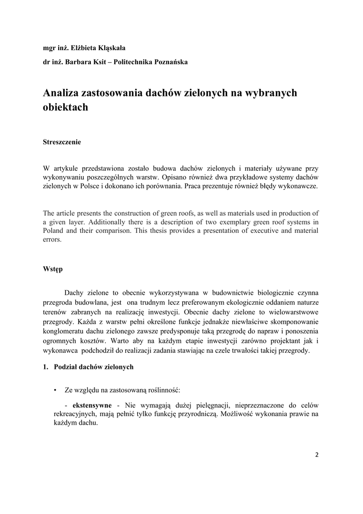 mgr inż. Elżbieta Kląskała dr inż. Barbara Ksit – Politechnika Poznańska Analiza zastosowania dachów zielonych na wybranych obiektach Streszczenie W artykule przedstawiona zostało budowa dachów zielonych i materiały używane przy wykonywaniu poszczególnych warstw. Opisano również dwa przykładowe systemy dachów zielonych w Polsce i dokonano ich porównania. Praca prezentuje również błędy wykonawcze. The article presents the construction of green roofs, as well as materials used in production of a given layer. Additionally there is a description of two exemplary green roof systems in Poland and their comparison. This thesis provides a presentation of executive and material errors. Wstęp Dachy zielone to obecnie wykorzystywana w budownictwie biologicznie czynna przegroda budowlana, jest ona trudnym lecz preferowanym ekologicznie oddaniem naturze terenów zabranych na realizację inwestycji. Obecnie dachy zielone to wielowarstwowe przegrody. Każda z warstw pełni określone funkcje jednakże niewłaściwe skomponowanie konglomeratu dachu zielonego zawsze predysponuje taką przegrodę do napraw i ponoszenia ogromnych kosztów. Warto aby na każdym etapie inwestycji zarówno projektant jak i wykonawca podchodził do realizacji zadania stawiając na czele trwałości takiej przegrody. 1. Podział dachów zielonych • Ze względu na zastosowaną roślinność: ekstensywne Nie wymagają dużej pielęgnacji, nieprzeznaczone do celów rekreacyjnych, mają pełnić tylko funkcję przyrodniczą. Możliwość wykonania prawie na każdym dachu. 2 półintensywne Stanowi wariant pośredni pomiędzy dachem ekstensywnym a intensywnym, cięższy od ekstensywnego i wymaga więcej pielęgnacji niż ekstensywny, czasem udostępniony dla celów rekreacyjnych. intensywne Dachy intensywne zwany ogrodami na dachu, które wymagają dużej pielęgnacji i odpowiedniej konstrukcji (1500 kg/m2). Dodatkowe elementy które można umieścić na takim dachu to baseny, oczka wodne, fontanny, ławeczki itp. • Ze względy na sposób ich wykonania systemowe zastosowana cała technologia przez producenta. Są to dachy droższe w realizacji, ale zapewniają większe bezpieczeństwo użytkowników w przypadku wystąpienia wad dachu zielonego, gwarancja na zastosowany system. niesystemowe projektowane indywidualnie a poszczególne warstwy wykonywane i kompletowane z różnych dostawców i technologii. Takie dachy są tańsze, ale jest większa możliwość jego awarii. Problem z odpowiednim doborem technologii, aby wzajemnie się nie niszczyły np. przez reakcję chemiczną między nimi. • Ze względu na warstwę izolacyjną tradycyjne odwrócone. Dachy tradycyjne od odwróconych różnią się miejscem umieszczenia termoizolacji, w dachach odwróconych termoizolacją jest nad hydroizolacją a dachach tradycyjnych pod termoizolacją. • Kolejną kategoria są dachy bagienne. 2. Dach tradycyjny Jeden z bardziej popularnych rozwiązań konstrukcyjnych występujących w naszym kraju. Budowa takiej przegrody składa się z następujących warstw: • Roślinność • Warstwa wegetacyjna – ma za zadanie zapewnić roślinności jak najlepsze warunki do ich rozwoju. • Warstwa filtrująca – ochrona systemów drenażowych przed zamuleniem. • Warstwa drenażowa – gromadzi wodę i odprowadza jej nadmiar • Warstwa ochronna – chroni hyrdoizolację przed uszkodzeniami 3 • Hydroizolacja chroni i zabezpieczać dach przed przerastaniem korzeni i gwarantuje wodoszczelność. Każda warstwa jest istotna aby dach zielony pracował prawidłowo. Można stosować różne materiały, jednakże nie wszystkie są jednakowo trwałe i dobrze ze sobą współpracują. Przykładem zastosowania materiału hydroizolacyjnego jest wykorzystanie EPDM ‘u do renowacji zabytkowego Fortu Austriackiego Skotniki w którym mieści się Muzeum oraz Archiwum Zsyłek, Wpędzeń i Przesiedleń. Zdjęcie 1 : Dach przed naprawą – pokryty papą i smołą [fot. Firma Karol Tabor] 4 Zdjęcie 2 : Dach po naprawą – pokryty EPDM’em [fot. Firma Karol Tabor] • Termoizolacja musi być odporna na zmienną temperaturę, na wilgoć, na zmiany obciążenie, nie mogą również zmieniać swoich wymiarów ani formy. Powinny być układane szczelnie a najlepiej dwie warstwy naprzemiennie ,aby uniknąć mostków termicznych. Nie wszystkie materiały termoizolacyjne mogą być zastosowane w dachach odwróconych, ponieważ nie wszystkie materiały są odporne na wilgoć, tracą swoje właściwości kiedy nasiąkną wodą. Do dachów odwróconych świetnie nadają się Polistyren ekstrudowany XPS , styropian EPS 100 oraz płyty warstwowe PIR. Do dachów tradycyjnych świetnie nadaje się Płyta warstwowe PIR. Stosując warstwę termoizolacyjną z płyt PIR mamy możliwość przyklejenia do niej bezpośrednio warstwy termoizolacyjnej z papy samoprzylepnej (np. firmy Bauder TEC która występuje w wielu wersjach ) lub membrany zgrzewalnej samoprzylepnej firmy CARLISLE Resitrix SK lub SKW, jedynie styropian EPS laminowany papą nadaje się do cało powierzchniowego łączenia z hydroizolacją. Połączenie termoizolacji z hydroizolacją na całej powierzchni wyklucza fałdowanie się izolacji czyli zahamowania wody a to daje możliwość stosowania takiego systemu przy niewielkich spadkach. Zastosowanie takiego systemu daje projektantom duże pole popisu do zagospodarowania dachu np. w łączeniu dachu zielonego z tarasami w których można stosować deski tarasowe lub płytki tarasowe na dystansach jako trakcje komunikacyjne lub jako część użytkową. Dodatkowa zaleta stosowania płyt PIR to ich właściwości termoizolacyjne zwłaszcza przy zastosowaniu płyt z osnową aluminiową co umożliwia stosowanie mniejszych grubości , płyty te występują również w wersji pióro wpust, dzięki osnowie z aluminium zwiększa się wytrzymałość płyty co zapobiega wgniataniu się np. legarów podtrzymujących deski tarasowe lub podkładki pod