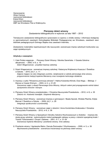 Opracowanie: Alicja Ciempa nauczyciel bibliotekarz Edyta Kilian nauczyciel bibliotekarz DBP we Wrocławiu Filia w Wałbrzychu Pierwszy dzień wiosny Zestawienie bibliograficzne w wyborze za lata 1997 – 2012 Tematyczne zestawienie bibliograficzne opracowano w oparciu o źródła wiedzy i informacji dostępnej w zgromadzonych zasobach Dolnośląskiej Biblioteki Pedagogicznej we Wrocławiu, zasobach sieci bibliotek pedagogicznych Dolnego Śląska oraz zasobach Internetu. Zestawienie materiałów repertuarowych dla nauczycieli, scenariusze imprez szkolnych konkursów czy zajęć dydaktycznych. Artykuły z czasopism 1. Cała Polska wagaruje... : Pierwszy Dzień Wiosny / Monika Sarwińska // Gazeta Szkolna : aktualności. – 2000, nr 6, s. 15 Dzień Wagarowicza - przykład imprezy szkolnej. 2. Dzień Wagarowicza : scenariusz imprezy szkolnej / Katarzyna Wojkiewicz-Huszcza // Świetlica w Szkole. – 2010, [nr] 1, s. 11 Zajęcia mające na celu integracje uczniów, świętowanie w szkole pierwszego dnia wiosny, przypomnienie tradycji topienia Marzanny oraz rozwijanie twórczego działania. 3. Imprezy z cyklu "Wiosenna promocja zdrowia" / Halina Kubarska-Klimek, Ewa Noga. – Bibliogr. // Klanza w Czasie Wolnym. – 2003, nr 2, s. 21-25 Scenariusz zajęć z okazji Pierwszego Dnia Wiosny, których celem jest propagowanie wśród dzieci spożywania owoców i warzyw. 4. Pierwszy Dzień Wiosny przedszkolaka // Doradca Nauczyciela Przedszkola. – 2012, nr 6, s. 35 Zielono mi. Hodowla nowalijek. Utopienie Marzanny. 5. Pierwszy Dzień Wiosny : scenariusz imprezy w gimnazjum / Beata Sporek, Wioleta Płachta, Edyta Biernat // Świetlica w Szkole. – 2009, [nr] 1, s. 29 Integracja społeczności uczniowskiej. 6. Pierwszy Dzień Wiosny : scenariusz zajęć z dziećmi / Anna Kordzińska-Grabowska // Doradca Nauczyciela Przedszkola. - 2012, nr 6, s. 36 7. Pierwszy Dzień Wiosny w Specjalnym Ośrodku Szkolno-Wychowawczym w Sokółce - impreza dla dużej grupy szkolnej : wykorzystanie metod pedagogiki zabawy w pracy z dziećmi specjalnej troski / Teresa Tokarzewska // Grupa i Zabawa. - 2001, nr 1, s. 31-35 Scenariusz topienia Marzanny i powitania wiosny. Inne zabawy. 8. Powitanie wiosny / Agnieszka Balon, Danuta Żwirowska // Wychowawca. – 2009, nr 3, s. 30 Wychowanie przedszkolne - scenariusz inscenizacji na pierwszy dzień wiosny. 9. Pożegnanie zimy / Anna Kulbacka // Wychowanie w Przedszkolu. – 2007, nr 3, s. 44-45 Spacer z dziećmi pięcio- i sześcioletnimi z kukłą Marzanny. Układanie Marzanny do snu i Żegnanie zimy. Zaznajomienie dzieci z faktem, że 21 marca jest końcem zimy i pierwszym dniem wiosny. 10. Przyjemne z pożytecznym, czyli jak wykorzystać dzień wagarowicza / Bernarda Skalska, Magdalena Aszlar // Ekoświat. – 2004, nr 3, s. 10 Pierwszy dzień wiosny - dzień wagarowicza, dzień ekologiczny i promujący zdrowy tryb życia. 11. Przywitanie wiosny / Anna Nartowska. – Bibliogr. // Klocki Autonomiczne w Szkole. – 1999, nr 3 : Wychowanie, s. 67-70 Scenariusz imprezy szkolnej z okazji pierwszego dnia wiosny. Występ dzieci młodszych. 12. Szkolne Święto Matematyki propozycja na pierwszy dzień wiosny / Aleksandra Ossowska // Wychowanie na Co Dzień. – 2002, nr 2/3, dod. s. XII 13. Święto wiosny i radości : scenariusz imprezy na wesoło na Pierwszy Dzień Wiosny / Anna Matuszkiewicz. – Bibliogr. // Poradnik Bibliotekarza. – 2006, [nr] 2, s. 35-37 14. Święto wiosny i radości : scenariusz imprezy - turnieju klas na pierwszy Dzień Wiosny / Anna Matuszkiewicz. - Bibliogr. // Wszystko dla Szkoły. – 2004, nr 2, s. 18-19 15. Święto wiosny i radości - scenariusz turnieju / Anna Matuszkiewicz // Wychowanie na Co Dzień. – 2004, nr 4/5, dod. s. X-XII Dla uczniów gimnazjum do wykorzystania na szkolnych imprezach "Pierwszy dzień wiosny" lub "Dzień Ziemi". 16. Wkrótce wiosna : scenariusz zajęć zintegrowanych dla klasy trzeciej / Iwona Chłopek // Klanza w Zabawie i Edukacji Dzieci. – 2005, nr 1, s. 26-29 Scenariusz zajęć, które umożliwiają uczniom wesołe, interesujące, bezpieczne i pouczające spędzenie pierwszego dnia wiosny w murach szkoły. Wydawnictwa zwarte 1. Czarodziejski dzień :propozycje opracowań scenariuszy imprez dla dzieci / Jadwiga Lipińska, Bogdan Lipiński. Lublin : Polonijne Centrum Nauczycielskie, 2001. Publikacja zawiera osiem scenariuszy na różne okazje (m.in. Święto Ziemi, powitanie wiosny). 2. Edukacja muzyczna w przedszkolu : poradnik / Bożena Jaromin. – Katowice : Związek Nauczycielstwa Polskiego. Ośrodek Usług Pedagogicznych i Socjalnych, 2004. – 59 s. 3. Europa bez granic i inne scenariusze uroczystości szkolnych dla gimnazjum / Jan Jakub Należyty. dodr. do wyd. 1. Warszawa : Fraszka Edukacyjna, 2008. – 136 s. 10 autorskich scenariuszy dla teatru szkolnego wśród których umieszczono scenariusz na pierwszy dzień wiosny czy Dzień Ziemi. Ponadto zawiera teksty dialogów, teksty i nuty piosenek, krótkie wskazówki do realizacji. 4. Inscenizacje na każdą okazje :gimnazjum / Małgorzata Wieczorek, Dorota Wieczorek. Wyd. 2. Gdańsk : Wydawnictwo Harmonia, 2004. – 144 s. W treści m. in scenariusz inscenizacji na Święto wiosny (21marca). 5. Jak krok po kroku wprowadzać dzieci o specjalnych potrzebach edukacyjnych w świat zabawy i nauki / Elżbieta Maria Minczakiewicz. Wyd 2. Kraków: Oficyna Wydawnicza "Impuls", 2009. – 196 s. Propozycje pracy z dziećmi przedszkolnymi i starszymi z różnymi deficytami rozwoju intelektualnego adresowane do nauczycieli, pedagogów specjalnych, logopedów, rodziców. Przykładowe charakterystyki dzieci z trudnościami w uczeniu sie ze wskazówkami dla rodziców. Scenariusze zajęć logopedycznych, konspekty zajęć z zakresu rewalidacji indywidualnej, scenariusz zajęć z rozwoju funkcji manualnych, kręgi tematyczne związane ze świętami (andrzejki, Boże Narodzenie, Nowy Rok, Wielkanoc), wiosną, warzywami, przygotowaniem do pisania. 6. Malowane wierszem :scenariu