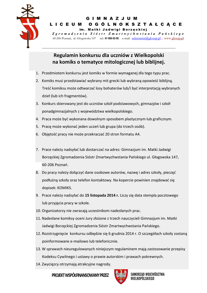 L I C E U M G I M N A Z J U M O G Ó L N O K S Z T A Ł C Ą C E im . M a t k i J a d w i g i B o r z ę c k i e j Zgromadzenia Sióstr Zmartwychwstania Pańskiego 60-206 Poznań, ul. Głogowska 147 tel.: 61 866-52-59, e-mail: [email protected] ; www.gloszp.pl ________________________________________________________________ Regulamin konkursu dla uczniów z Wielkopolski na komiks o tematyce mitologicznej lub biblijnej. 1. Przedmiotem konkursu jest komiks w formie wymaganej dla tego typu prac. 2. Komiks musi przedstawiać wybrany mit grecki lub wybraną opowieść biblijną. Treść komiksu może odtwarzać losy bohaterów lub/i być interpretacją wybranych dzieł (lub ich fragmentów). 3. Konkurs skierowany jest do uczniów szkół podstawowych, gimnazjów i szkół ponadgimnazjalnych z województwa wielkopolskiego. 4. Praca może być wykonana dowolnym sposobem plastycznym lub graficznym. 5. Pracę może wykonać jeden uczeń lub grupa (do trzech osób). 6. Objętość pracy nie może przekraczać 20 stron formatu A4. 7. Prace należy nadsyłać lub dostarczać na adres: Gimnazjum im. Matki Jadwigi Borzęckiej Zgromadzenia Sióstr Zmartwychwstania Pańskiego ul. Głogowska 147, 60-206 Poznań. 8. Do pracy należy dołączyć dane osobowe autorów, nazwę i adres szkoły, pieczęć podłużną szkoły oraz telefon kontaktowy. Na kopercie powinien znajdować się dopisek: KOMIKS. 9. Prace należy nadsyłać do 15 listopada 2014 r. Liczy się data stempla pocztowego lub przyjęcia pracy w szkole. 10. Organizatorzy nie zwracają uczestnikom nadesłanych prac. 11. Nadesłane komiksy oceni Jury złożone z trzech nauczycieli Gimnazjum im. Matki Jadwigi Borzęckiej Zgromadzenia Sióstr Zmartwychwstania Pańskiego. 12. Rozstrzygnięcie konkursu odbędzie się 6 grudnia 2014 r. O szczegółach szkoły zostaną poinformowane e-mailowo lub telefonicznie. 13. W sprawach nieuregulowanych niniejszym regulaminem mają zastosowanie przepisy Kodeksu Cywilnego i ustawy o prawie autorskim i prawach pokrewnych. 14. Zwycięzcy otrzymają atrakcyjne nagrody. PROJEKT WSPÓŁFINANSOWANY PRZEZ 15. Autor zwycięskiej pracy wyraża zgodę na nieodpłatne opublikowanie pracy przez Gimnazjum i Liceum im. Matki Jadwigi Borzęckiej Zgromadzenia Sióstr Zmartwychwstania Pańskiego. 16. Uczestnik Konkursu wyraża zgodę na przetwarzanie swoich danych osobowych, zgodnie z ustawą o ochronie danych osobowych z dn. 29.08.1997 r. (o ochronie danych osobowych - Dz.U. nr 133 poz. 883). 17. Wzięcie przez Uczestnika udziału w Konkursie oznacza akceptację postanowień niniejszego Regulaminu. KRYTERIA OCENY PRAC KONKURSOWYCH Zespół nauczycieli dokona oceny prac konkursowych zgodnie z następującymi kryteriami: 1. Zgodność tematu pracy z tematyką konkursową (zob. pkt 2 Regulaminu). 2. Połączenie obrazu i pisma w jedną spójną całość. 3. Jasność przekazu graficznego i słownego. 4. Oryginalność ujęcia tematu - umiejętność ciekawego opowiedzenia w formie komiksu mitu lub historii biblijnej lub/i ciekawa ich interpretacja. 5. Pomysłowe i celowe wykorzystanie techniki plastycznej i graficznej. 6. Oryginalność kompozycji (układ poszczególnych plansz składających się na komiks, związki między planszami). 7. Poprawność językowa, ortograficzna i interpunkcyjna. Skala punktacji 0 – 5. Maksymalna liczba punktów - 35. Agnieszka Kuźma Joanna Pawłowska PROJEKT WSPÓŁFINANSOWANY PRZEZ