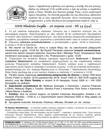 Synu, z łagodnością wykonuj swe sprawy, a każdy, kto jest prawy, będzie cię miłował. O ile wielki jesteś, o tyle się uniżaj, a znajdziesz łaskę u Pana. Wielka jest bowiem potęga Pana i przez pokornych bywa chwalony. Na chorobę pyszałka nie ma lekarstwa, albowiem nasienie zła w nim zapuściło korzenie. Serce rozumnego rozważa przypowieści, a ucho słuchacza jest pragnieniem mędrca. (Syr 3) XXII Niedziela Zwykła – 28 sierpnia 2016 - Nr 34 (534) 1. To już ostatnia wakacyjna niedziela. Cieszmy się z ostatnich wolnych dni, ze sprzyjającej pogody. Wykorzystajmy je, aby nabrać sił do codziennych obowiązków w nowym roku szkolnym i katechetycznym. Już dziś podczas nieszporów podziękujemy za piękne, szczęśliwe wakacje i poprosimy o potrzebne łaski i dary w nowym roku pracy 2. Zebranie rodziców przedszkolaków: w poniedziałek o godz. 18.00 w Kamionku, w środę o 16.00 w Kamieniu 3. We wtorek na Górze św. Anny w czasie Mszy św. na zakończenie pielgrzymki ministrantów o godz. 12.00 Ks. Bp Rudolf Pierskała ustanowi nowych ceremoniarzy, wśród nich dwóch naszych lektorów: Szymona Buk i Mikołaja Tkotz. Gratulujemy! Nasi ministranci wyruszają na rowerach z Ks. Proboszczem o godz. 10.00 4. Tradycyjnie we wrześniu Biskup zaprasza tegorocznych Srebrnych i Złotych Jubilatów Małżeńskich na modlitewne dziękczynienie za dar małżeńskiej miłości podczas Pielgrzymki Jubilatów Małżeńskich. Srebrni Jubilaci wraz z najbliższymi zaproszeni są do Opola w niedzielę 4 września na godz. 14.00 do kościoła seminaryjnoakademickiego pw. św. Jadwigi Śląskiej przy ul. Drzymały 1. Małżonkowie obchodzący Złote Gody spotkają się w tym samym miejscu w niedzielę 11 września o 14.00 5. Parafia nasza organizuje samolotową pielgrzymkę do Rzymu z okazji 1050-lecia Chrztu Polski w dniach 19-23 października 2016. Koszt 1300 zł i 300 EUR (zapisy do wtorku) oraz do Ziemi Świętej w dniach 9-16 listopada. Koszt 3300 zł i 100 USD Szczegóły na ulotkach 6. Zapowiedzi przedślubne (I): Mateusz Szwugier z Kamionka i Joanna Polaczek z Otmic; Mateusz Śląski z Toszka i Sandra Franc z Kamienia; Piotr Szice z Kamionka i Maria Mania z Kadłuba 7. Kolekty: dziś na remont zegara, za tydzień instytucje diecezjalne. Kolekta z ub. niedzieli (Parafia) – 5700 zł, z z wypominkami wierni ofiarowali 2320 zł. Bóg zapłać za wszystkie ofiary! 8. Sprzątanie kościoła: Swoboda, Roskosz, Mikolas, Strzałek (ul. św. Jacka) W Gościu Niedzielnym: - w kościele rzadko możemy usłyszeć o piekle, a przecież nie przestało ono istnieć. Czy wiara w piekło jest warunkiem miłości do Boga? - „Powiedzcie mojej babci, że zachowałam się jak trzeba” – napisała z więzienia Inka. Czym jeszcze fascynuje Danuta Siedzikówna, która dopiero siedemdziesiąt lat po śmierci zostanie godnie pogrzebana; - czy marihuana, o której ostatnio tak głośno, może być skutecznym lekarstwem? Parafia św. Jacka, Pl. Myśliwca 30, 47-325 Kamień Śląski, tel. 77 467 11 07, 604 107 358; www.parafia.swjacek.eu [email protected], Konto 23 8884 0004 2003 0031 7573 0001, Kancelaria czynna we wtorek i piątek po mszy porannej oraz od 16 do 18. Spowiedź św. przed każdą Mszą świętą. Transmisja nabożeństw: www.msza.swjacek.eu 28 VIII XXII NIEDZIELA ZWYKŁA (Kolekta na remont zegara) 7.30 Msza św. za ++ męża i ojca Bernarda Kauf, jego rodz. Annę i Alojzego, rodz. Jadwigę i Jana Spiller, ich rodz. i rodzeństwo, szwagra Sławomira Olek i dusze w cz. c. 10.00 Msza św. za ++ Ojca, Babcię i Dziadków z obu stron 14.30 Chrzest: Kacper Piotr Wach 15.00 Nieszpory niedzielne 16.00 Msza św. za ++ żonę Marię Lysek, z rodzin Lysek, Borowczyk, Grossmann, Sleziona i Grobosz oraz o powrót do zdrowia ojca Huberta PONIEDZIAŁEK Męczeństwo św. Jana Chrzciciela 29 VIII 7.00 Msza św. za + Józefa Glik od mieszkańców ulic św. Jacka, Wapiennej i Krótkiej ora za zmarłych z tych ulic 17.00 Kamionek: Msza św. za ++ męża i ojca Jacka Konieczny, córkę Teresę Malorny, rodz. Konieczny i Machura, siostry i brata, 3 szwagrów, chrześniaka i dusze w cz. c. WTOREK 30 VIII 7.00 Msza św. ++ matkę Łucję Skrobocz, jej rodz. i rodzeństwo, męża i ojca Franciszka Kałuża, bratową Elżbietę, Marię Przybyła i jej męża, pokr. z obu storn i dusze w cz. c. ŚRODA 31 VIII 7.00 Msza św. w jęz. niem.: do B. Op. (…) w intencji Marioli i Hermana z okazji pierwszej rocznicy ślubu 1 CZWARTEK 1 IX Odpust bł. Bronisławy 7.30 Spowiedź dzieci klas IV-VI 8.00 Msza św. na rozpoczęcie roku szkolnego: w intencji uczniów, nauczycieli, rodziców i pracowników Szkoły Podstawowej w Kamieniu 17.00 Spowiedź młodzieży i dorosłych 18.00 Suma odpustowa za żyjących i ++ Parafian oraz w int. młodzieży 1 PIĄTEK 2 IX 7.00 Msza św. w intencji czcicieli Najświętszego Serca Pana Jezusa 8.30 Odwiedziny chorych 18.00 Msza św. za ++ Łucję Sprancel i Dawida Machura od mieszkańców ulicy Polnej i za zmarłych z tej ulicy Grzegorza Wielkiego 1 SOBOTA 3 IX 7.00 Msza św. za ++ męża i ojca Alfreda Sleziona w 2 rocznicę śmierci 11.00 Msza św. ślubna: Krystyna Niedworok i Łukasz Grandek 16.00 Św. Barbara: Msza św. 17.00 Kamionek: za ++ rodz. Martę i Pawła Rygol, Annę i Pawła Tkocz, brata Jerzego, szwagrów Roberta Zajonz, Henryka Woś, dziadków i dusze w cz. c. XXIII NIEDZIELA ZWYKŁA (Kolekta dla Kurii) 4 IX 7.30 Msza św. za ++ męża i ojca Edwarda Cichoń w 4 rocznicę śmierci 9.15 wyjście procesji na Odpust ku czci bł. Bronisławy do Miedzianej (powrót autobusem o godz. 12.30) 10.00 Msza św. do B. Op. (…) w intencji Beaty Przemus z okazji 40 urodzin, męża i córki 16.00 Msza św. koncelebrowana: 1) za ++ męża i ojca Franciszka Zimon, rodz. Jadwigę i Ryszarda Matuszek, teściów Małgorzatę i Antoniego Zimon, kuzynkę Hildegardę i jej męża Gintra; 2) do B. Op. (…) w intencji Ireny i Mariana z okazji 55 rocznicy ślubu i całej rodziny