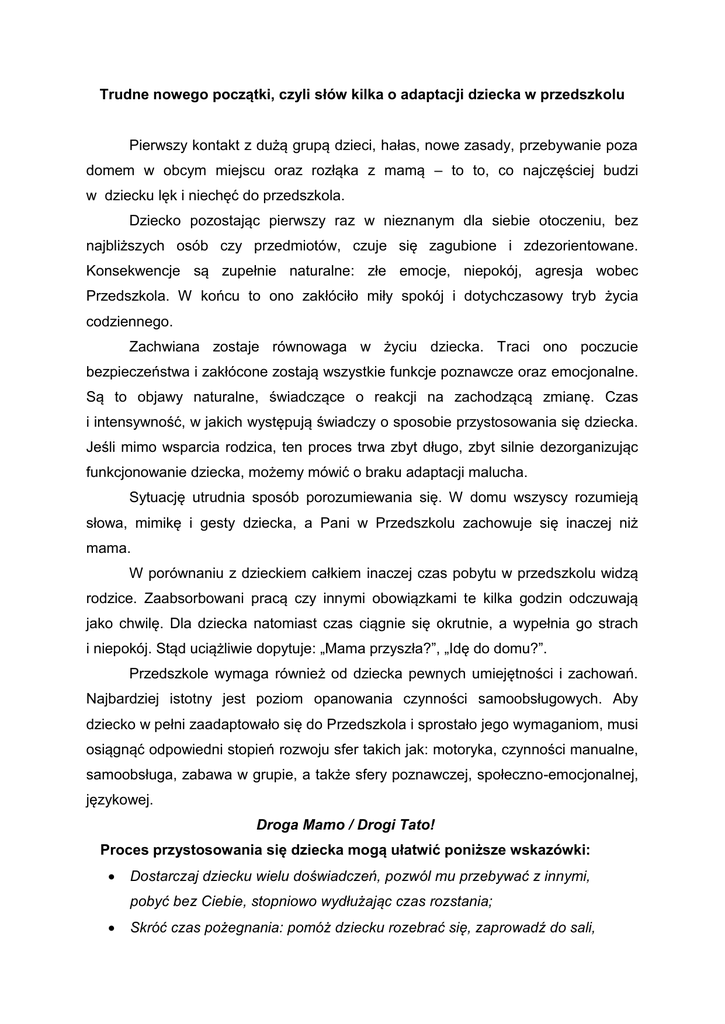 Trudne nowego początki, czyli słów kilka o adaptacji dziecka w przedszkolu Pierwszy kontakt z dużą grupą dzieci, hałas, nowe zasady, przebywanie poza domem w obcym miejscu oraz rozłąka z mamą – to to, co najczęściej budzi w dziecku lęk i niechęć do przedszkola. Dziecko pozostając pierwszy raz w nieznanym dla siebie otoczeniu, bez najbliższych osób czy przedmiotów, czuje się zagubione i zdezorientowane. Konsekwencje są zupełnie naturalne: złe emocje, niepokój, agresja wobec Przedszkola. W końcu to ono zakłóciło miły spokój i dotychczasowy tryb życia codziennego. Zachwiana zostaje równowaga w życiu dziecka. Traci ono poczucie bezpieczeństwa i zakłócone zostają wszystkie funkcje poznawcze oraz emocjonalne. Są to objawy naturalne, świadczące o reakcji na zachodzącą zmianę. Czas i intensywność, w jakich występują świadczy o sposobie przystosowania się dziecka. Jeśli mimo wsparcia rodzica, ten proces trwa zbyt długo, zbyt silnie dezorganizując funkcjonowanie dziecka, możemy mówić o braku adaptacji malucha. Sytuację utrudnia sposób porozumiewania się. W domu wszyscy rozumieją słowa, mimikę i gesty dziecka, a Pani w Przedszkolu zachowuje się inaczej niż mama. W porównaniu z dzieckiem całkiem inaczej czas pobytu w przedszkolu widzą rodzice. Zaabsorbowani pracą czy innymi obowiązkami te kilka godzin odczuwają jako chwilę. Dla dziecka natomiast czas ciągnie się okrutnie, a wypełnia go strach i niepokój. Stąd uciążliwie dopytuje: „Mama przyszła?”, „Idę do domu?”. Przedszkole wymaga również od dziecka pewnych umiejętności i zachowań. Najbardziej istotny jest poziom opanowania czynności samoobsługowych. Aby dziecko w pełni zaadaptowało się do Przedszkola i sprostało jego wymaganiom, musi osiągnąć odpowiedni stopień rozwoju sfer takich jak: motoryka, czynności manualne, samoobsługa, zabawa w grupie, a także sfery poznawczej, społeczno-emocjonalnej, językowej. Droga Mamo / Drogi Tato! Proces przystosowania się dziecka mogą ułatwić poniższe wskazówki: Dostarczaj dziecku wielu doświadczeń, pozwól mu przebywać z innymi, pobyć bez Ciebie, stopniowo wydłużając czas rozstania; Skróć czas pożegnania: pomóż dziecku rozebrać się, zaprowadź do sali, pożegnaj się, pocałuj je i wyjdź; Nie zabieraj dziecka do domu, kiedy płacze przy rozstaniu, bo jeśli zrobisz to choć raz, będzie wiedziało, że łzami można wiele wymusić; daj mu „kawałek domu” - może to być np. ulubiona maskotka, wspólne zdjęcie; Pamiętaj: żegnaj i witaj swoje dziecko zawsze z uśmiechem, twój spokój/niepokój może mu się udzielić; Jeśli dziecko przy pożegnaniu płacze, postaraj się, żeby przez kilka dni odprowadzał je do przedszkola drugi rodzic; Nie obiecuj: Jak pójdziesz do przedszkola to coś dostaniesz! - nie może to być forma przekupywania; Jeśli mimo wszystko maluch ma problemy podczas rozstania okaż zrozumienie, a nie zniecierpliwienie, a ponadto postaraj się znaleźć jak najwięcej czasu na aktywne bycie z nim po odebraniu z przedszkola; Kontroluj to, co mówisz: staraj się mówić o przedszkolu z wydźwiękiem pozytywnym, a nie negatywnym, nie odbieraj ewentualnych uwag, obserwacji czy sugestii nauczycielki jako ataku na Ciebie czy Twoje dziecko; Nie naciskaj na dziecko, aby od razu opowiedziało, co wydarzyło się w przedszkolu - to powoduje niepotrzebny stres; Ubieraj dziecko wygodnie, aby ubieranie się było dla niego proste; Zawsze dotrzymuj danego słowa – Twoje dziecko może nie mieć jeszcze poczucia czasu, ale wiąże fakty ze zdarzeniami; Wprowadź podobną organizację dnia w domu z przedszkolnym; Okaż zrozumienie dla mogących się zdarzyć „niespodzianek”, takich jak moczenie, obgryzanie paznokci. Porozmawiaj o źródle tych zachowań zarówno z dzieckiem jak i z wychowawcą, ponieważ przyczyny mogą być różne. Proces przystosowania się dziecka utrudniają: niepewność rodzica i brak konsekwencji w podejmowaniu decyzji, brak doświadczeń społecznych dziecka w kontaktach z nowymi osobami, nadopiekuńczość rodzica np. wyręczanie dziecka w czynnościach związanych z samoobsługą, straszenie dziecka przedszkolem, nieznajomość i brak zaufania do placówki oraz wobec kadry, traktowanie dziecka przedmiotowo, emocje rodzica: wyrzuty sumienia, niepokój, lęk, poczucie zagrożenia, brak jasno określonych granic, pośpiech, zdenerwowanie, spóźnianie - brak czasu dla dziecka, brak zrozumienia dla trudnych zachowań, obrażanie się na dziecko, unikanie bądź odrzucenie. Istotną rolę w procesie adaptacji odgrywa ciągłość przychodzenia dziecka do przedszkola. Częsta nieobecność w przedszkolu opóźnia adaptację. W wielu przypadkach powoduje konieczność powtórnego rozpoczęcia tego procesu. Adekwatna reakcja rodziców i podjęcie współdziałania z wychowawcą pomoże maluchowi we wspólnym pokonywaniu problemów. Rodzicu pamiętaj, że z każdym dniem może być tylko lepiej! Anna Mikocka