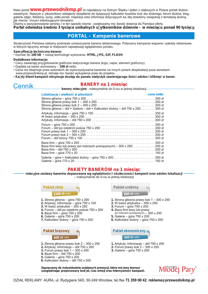 Nasz portal www.przewodnikmp.pl to największy na Dolnym Śląsku i jeden z większych w Polsce portali ślubnoweselnych. Naszym użytkownikom oddajemy bezpłatnie do dyspozycji kalkulator kosztów budżetu ślubnego, forum ślubne, blog, galerie zdjęć, felietony, quizy, setki porad, inspiracji oraz informacji dotyczących każdej dziedziny związanej z tematyką ślubną, jak również innymi interesującymi tematami. Dbamy o pozycjonowanie serwisu i w ten sposób również zwiększamy możliwość dotarcia do Państwa oferty. Portal odwiedza średnio 3 tysiące unikalnych użytkowników dziennie – w miesiącu ponad 90 tysięcy. PORTAL – Kampanie banerowe Skuteczność Państwa reklamy podniesie umieszczenie banera reklamowego. Polecamy kampanie wiązane i pakiety reklamowe, w których łączymy emisje w miejscach największej oglądalności portalu. Specyfikacja techniczna banera: • rozmiar do 100 kB • rodzaj technologii wykonania: HTML, JPG, GIF, FLASH. Dodatkowe informacje: • Ceny zawierają przygotowanie graficzne statycznego banera (logo, napis, element graficzny). • Dopłata za baner animowany – 100 zł netto. • Cena nie obejmuje praw autorskich do wykorzystywania banerów na innych polach eksploatacji poza serwisem www.przewodnikmp.pl. Istnieje możliwość wykupienia praw do projektu. • Każdy klient kampanii otrzymuje dostęp do panelu statystyk zawierającego ilości odsłon i kliknięć w baner. Cennik BANERY na 1 miesiąc banery rotacyjne - maksymalnie do 5-ciu w jednej lokalizacji cena netto Lokalizacja i wielkość w pikselach Strona główna – góra 750 x 200 . . . . . . . . . . . . . . . . . . . . . . . . . . . . . . . . . . . . . . . 300 zł Strona główna prawy bok 1 – 300 x 250 . . . . . . . . . . . . . . . . . . . . . . . . . . . . . . . . . 250 zł Strona główna prawy bok 2 – 300 x 250 . . . . . . . . . . . . . . . . . . . . . . . . . . . . . . . . . 200 zł Strona główna – dół + Galerie – dół + Kalkulator ślubny – dół 750 x 200 . . . . . . . . 300 zł Artykuły, informacje – góra 750 x 100 . . . . . . . . . . . . . . . . . . . . . . . . . . . . . . . . . . . 250 zł W treści artykułów – 300 x 250 . . . . . . . . . . . . . . . . . . . . . . . . . . . . . . . . . . . . . . . . 300 zł Artykuły, informacje – dół 750 x 200 . . . . . . . . . . . . . . . . . . . . . . . . . . . . . . . . . . . . 200 zł Forum – góra 750 x 200 . . . . . . . . . . . . . . . . . . . . . . . . . . . . . . . . . . . . . . . . . . . . . 350 zł Forum – dół po ostatnim poście 750 x 200 . . . . . . . . . . . . . . . . . . . . . . . . . . . . . . . 300 zł Forum prawy bok 1 – 300 x 250 . . . . . . . . . . . . . . . . . . . . . . . . . . . . . . . . . . . . . . . 250 zł Forum prawy bok 2 – 300 x 250 . . . . . . . . . . . . . . . . . . . . . . . . . . . . . . . . . . . . . . . 200 zł Forum – dół strony 750 x 100 . . . . . . . . . . . . . . . . . . . . . . . . . . . . . . . . . . . . . . . . . 200 zł Baza firm – góra 750 x 200 . . . . . . . . . . . . . . . . . . . . . . . . . . . . . . . . . . . . . . . . . . . 300 zł Baza firm lewy lub prawy (po treściach powiązanych) – 300 x 250. . . . . . . . . . . . . 250 zł Baza firm – dół 750 x 200 . . . . . . . . . . . . . . . . . . . . . . . . . . . . . . . . . . . . . . . . . . . . 200 zł Baza firm – góra 770 x 20 . . . . . . . . . . . . . . . . . . . . . . . . . . . . . . . . . . . . . . . . . . . . 150 zł Galerie – góra + Kalkulator ślubny – góra 750 x 200. . . . . . . . . . . . . . . . . . . . . . . . 250 zł Galerie – góra 770 x 20 . . . . . . . . . . . . . . . . . . . . . . . . . . . . . . . . . . . . . . . . . . . . . . 150 zł PAKIETY BANERÓW na 1 miesiąc rotacyjne zestawy banerów dopasowane wg oglądalności i skuteczności kampanii oraz odsłon lokalizacji – maksymalnie do 5-ciu w jednej lokalizacji Pakiet złoty 1200 zł netto 1. Strona główna – góra 750 x 200 2. Artykuły, informacje – góra 750 x 100 3. W treści artykułów – 300 x 250 4. Forum – dół po ostatnim poście 750 x 200 5. Baza firm – góra 750 x 200 6. Galerie – góra 750 x 200 7. Kalkulator ślubny – góra 750 x 200 Pakiet brązowy 600 zł netto 1. Strona główna prawy bok 2 – 300 x 250 2. Artykuły, informacje – dół 750 x 200 3. Forum prawy bok 1 – 300 x 250 4. Baza firm – dół 750 x 200 5. Galerie – góra 750 x 200 6. Kalkulator ślubny – dół 750 x 200 Pakiet srebrny 800 zł netto 1. Strona główna prawy bok 1 – 300 x 250 2. W treści artykułów – 300 x 250 3. Forum – góra 750 x 200 4. Baza firm lewy lub prawy (po treściach powiązanych) – 300 x 250 5. Galerie – góra 750 x 200 6. Kalkulator ślubny – góra 750 x 200 Pakiet ekonomiczny 350 zł netto 1. Artykuły, informacje – dół 750 x 200 2. Forum prawy bok 2 – 300 x 250 3. Galerie – góra 750 x 200 Zapraszamy do indywidualnie ustalanych promocji, które możemy tworzyć uwzględniając proponowany budżet, czas emisji oraz intensywność kampanii. DZIAŁ REKLAMY: AURA, ul. Rydygiera 34D, 50-249 Wrocław, tel./fax 71 359 00 42, [email protected] PORTAL – Baner Peel-Ad Baner typu Peel-Ad. Baner znajduje się się w prawym, górnym rogu naszej strony, rozwija się on (po najechaniu myszką) do trójkąta o długości boków 500 x 500 pikseli. baner zwinięty Reklama imituje efekt odginania się rogu kartki – zwija się, gdy przesuniemy kursor myszki w inne miejsce strony. Cennik 500 zł netto miesięcznie Reklama Peel-Ad pojawia się na wszystkich stronach naszego serwisu. baner rozwinięty PORTAL – Artykuły sponsorowane Klientów naszego wydawnictwa zachęcamy do umieszczania z poziomu strony głównej oraz podstron artykułowych (w menu działu) artykułów sponsorowanych wraz ze zdjęciami i linkiem do Państwa strony www. Tego typu reklama wyróżnia Państwa ofertę, bezpośrednio zwróci uwagę na poszczególne usługi oraz produkty i ułatwi dotarcie 