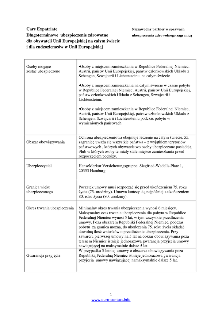 Care Expatriate Długoterminowe ubezpieczenie zdrowotne dla obywateli Unii Europejskiej na całym świecie i dla cudzoziemców w Unii Europejskiej Osoby mogące zostać ubezpieczone Niezawodny partner w sprawach ubezpieczenia zdrowotnego zagranicą •Osoby z miejscem zamieszkania w Republice Federalnej Niemiec, Austrii, państw Unii Europejskiej, państw członkowskich Układu z Schengen, Szwajcarii i Lichtensteinu na całym świecie. •Osoby z miejscem zamieszkania na całym świecie w czasie pobytu w Republice Federalnej Niemiec, Austrii, państw Unii Europejskiej, państw członkowskich Układu z Schengen, Szwajcarii i Lichtensteinu. •Osoby z miejscem zamieszkania w Republice Federalnej Niemiec, Austrii, państw Unii Europejskiej, państw członkowskich Układu z Schengen, Szwajcarii i Lichtensteinu podczas pobytu w wymienionych państwach. Obszar obowiązywania Ochrona ubezpieczeniowa obejmuje leczenie na całym świecie. Za zagranicę uważa się wszystkie państwa – z wyjątkiem terytoriów państwowych , których obywatelstwo osoby ubezpieczone posiadają i/lub w których osoby te miały stałe miejsce zamieszkania przed rozpoczęciem podróży. Ubezpieczyciel HanseMerkur Versicherungsgruppe, Siegfried-Wedells-Platz 1, 20353 Hamburg Granica wieku ubezpieczonego Początek umowy musi rozpocząć się przed ukończeniem 75. roku życia (75. urodziny). Umowa kończy się najpóźniej z ukończeniem 80. roku życia (80. urodziny). Okres trwania ubezpieczenia Minimalny okres trwania ubezpieczenia wynosi 6 miesięcy. Maksymalny czas trwania ubezpieczenia dla pobytu w Republice Federalnej Niemiec wynosi 5 lat, w tym wszystkie przedłużenia umowy. Poza obszarem Republiki Federalnej Niemiec, podczas pobytu za granica można, do ukończenia 75. roku życia składać dowolną ilość wniosków o przedłużenie ubezpieczenia. Przy zawarciu pierwszej umowy na 5 lat na obszar obowiązywania poza terenem Niemiec istnieje jednorazowa gwarancja przyjęcia umowy nawiązującej na maksymalnie dalsze 5 lat. W przypadku 5-letniej umowy o obszarze obowiązywania poza Republiką Federalną Niemiec istnieje jednorazowa gwarancja przyjęcia umowy nawiązującej namaksymalnie dalsze 5 lat. Gwarancja przyjęcia 1 www.euro-contact.info Care Expatriate – Przegląd ważniejszych świadcze wiadczeń * świadczenia Care Basic Comfort Premium Expatriate Niezbędne medyczne leczenie ambulatoryjne w 100% edno-/dwuosobowy jedno pok poza granicami pokój RFN Leczenie stacjonarne w szpitalu powszechnej kasy chorych do 500,-EUR /urządzenia pomocnicze słuchu i mowy oraz wózki inwalidzkie do 1000,EUR przepisane przez lekarza uwarunkowane warunkowane wypadkiem do 500,-EUR EUR środki lecznicze do 250,-EUR 250, do 500,-EUR do1500, o1500,-EUR do 500,-EUR 500, (do 100,-EUR 100, za konsultacj sultację) do 1000,-EUR (do 100,-EUR za konsultację) do 1500,-EUR (do 100,-EUR 100, za konnsultację) środki leczenia Psychoterapia 100% do 2.500,-EUR 2.500, Medycznie uzasadniony transport ubezpieczonego do domu Transport zwłok ubezpieczonego i koszty pogrzebu doo 10.000,10.000, EUR do 10.000,- EUR do 15.000,15.000, EUR Urlop w ojczyźnie do 30 dni do 45 dni do 90 dni Odpowiedzialność późniejsza (do przywrócenia zdolności do transportu) 1 miesiąc miesi 3 miesiące nieograniczona Leczenie dentystyczne w tym coroczne badanie kontrolne do 600,600, EUR 2 www.euro-contact.info Proteza dentystyczna uwarunkowana wypadkiem 80% do 1.000,1.000, EUR 80% do 2.000,- EUR 100% do 3.000,- EUR Proteza dentystyczna włącznie z naprawą - 60% 80% Badania profilaktyczne - do 250,- EUR doo 500,500, EUR Artykuły wspomagające wzrok - do 100,- EUR do 300,300, EUR Kwota pieniężna za dzień pobytu w szpitalu - 20,- EUR (do 20 dni) 30, EUR (do 30 dni) 30,- Prawo do dalszego ubezpieczenia - *Wyciąg z katalogu świadczeńń. Dokładny zakres świadczeń znajduje się w ogólnych og warunkach ubezpieczenia. Wszelkie ograniczenia dotyczą dotycz roku ubezpieczenia . 3 www.euro-contact.info