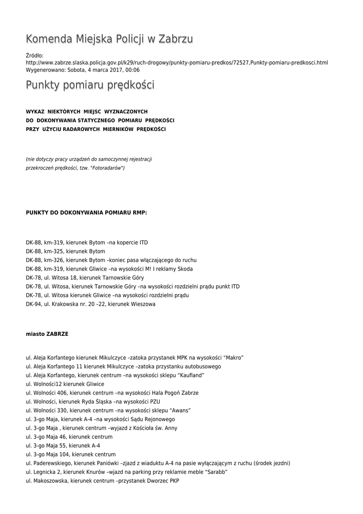 Komenda Miejska Policji w Zabrzu Punkty pomiaru prędkości