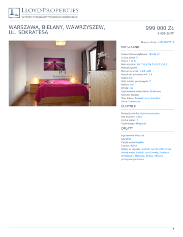 WARSZAWA, BIELANY, WAWRZYSZEW, UL. SOKRATESA 999 000 ZŁ 9 656 ZŁ/M2 Numer oferty: LL/22120/2016 MIESZKANIE Powierzchnia użytkowa: 103.46 m2 Liczba pokoi: 5 Piętro: 1 (z 6) Metraż pokoi: 26.7/12.67/9.71/10.11/14.1 Metraż kuchni: Metraż łazienek: 4.63, 4.81 Wysokość pomieszczeń: 2.6 Skosy: nie Ilość miejsc garażowych: 2 Balkon: nie Winda: tak Usytuowanie mieszkania: Środkowe Kierunki świata: Stan lokalu: Podwyższony standard Okna: Drewniane BUDYNEK Rodzaj budynku: Apartamentowiec Rok budowy: 2014 Liczba pięter: 6 Technologia: Mieszana OPŁATY Ogrzewanie Miejskie Gaz Brak Ciepła woda Miejska Czynsz: 900 zł Opłaty w czynszu: Zaliczki na CO, Zaliczki na zimną wodę, Zaliczki na c/z wodę, Fundusz remontowy, Ochrona, Śmieci, Miejsce postojowe/garażowe 1 Ewa Domarecka Property Advisor + 48 533 340 324 [email protected] OPIS Mieszkanie 5-pokojowe o pow. 103,46 m2 na 1. piętrze w 6-piętrowym budynku z 2014 r. przy ul. Sokratesa na Bielanach. Ciche, położone w części budynku oddalonej od głównej ulicy. Apartament został przeprojektowany przez architekta z dbałością o szczegóły i z podkreśleniem funkcjonalności poszczególnych pomieszczeń. Do jego wykończenia użyto najwyższej jakości materiałów. Zakup apartamentu w tej inwestycji będzie doskonałą lokatą kapitału i zapewni prestiż i satysfakcję jej przyszłym użytkownikom. W skład apartamentu wchodzą: Część dzienną stanowi salon z aneksem kuchennym - 26,7m2 z wyjściem na balkon - 9m2, 3 pokoje o powierzchni 12,67m2; 9,71m2; 10,11m2; toaleta dla gości 4,81m2 oraz osobne pomieszczenie zaaranżowane na pralnię i suszarnię 1,93m2 Część prywatną stanowi główna sypialnia - 14,10 z wewnętrzną łazienką 4,81m2, Wszystkie pomieszczenia łączy przestronny hol - 14,36m2. W cenie lokalu komórka lokatorska o powierzchni 4,25m2. W okolicy pełna infrastruktura: sklepy, szkoły, przedszkola, biblioteka, basen, Banki, bankomaty, sklepy, restauracja, kawiarnia, salon fryzjerski, urody, optyk, dentysta, rehabilitant, lekarz, biuro podróży. Park, Puszcza Kampinoska. W pobliżu powstaje największe centrum handlowo-rekreacyjne w Warszawie - Galeria Młociny. 10 min do stacji metra Młociny, 2 min do autobusu, 5 min do tramwaju. Przystanek autobusowy znajduje się przed wejściem do osiedla. Kameralne, stylowe osiedle położone w bardzo cichym, spokojnym otoczeniu. Budynki wykonano w podwyższonym standardzie. Osiedle jest zamknięte i monitorowane. Do osiedla prowadzi wejście przez ekskluzywną recepcję. Dla mieszkańców na osiedlu znajduje się strefa fitness z siłownią i sauną, piękny plac zabaw dla dzieci oraz kwitnący ogród wewnątrz strzeżonego patio. Do lokalu przynależą dwa położone koło siebie, wygodne miejsca postojowe. Koszt ich nabycia to 70 000PLN. Dodatkowo w cenie dwa miejsca dla motocykli (rowerów). 2