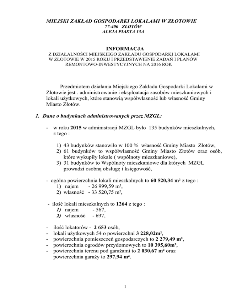 MIEJSKI ZAKŁAD GOSPODARKI LOKALAMI W ZŁOTOWIE 77-400 ZŁOTÓW ALEJA PIASTA 15A INFORMACJA Z DZIAŁALNOŚCI MIEJSKIEGO ZAKŁADU GOSPODARKI LOKALAMI W ZŁOTOWIE W 2015 ROKU I PRZEDSTAWIENIE ZADAŃ I PLANÓW REMONTOWO-INWESTYCYJNYCH NA 2016 ROK Przedmiotem działania Miejskiego Zakładu Gospodarki Lokalami w Złotowie jest : administrowanie i eksploatacja zasobów mieszkaniowych i lokali użytkowych, które stanowią współwłasność lub własność Gminy Miasto Złotów. 1. Dane o budynkach administrowanych przez MZGL: - w roku 2015 w administracji MZGL było 135 budynków mieszkalnych, z tego : 1) 43 budynków stanowiło w 100 % własność Gminy Miasto Złotów, 2) 61 budynków to współwłasność Gminy Miasto Złotów oraz osób, które wykupiły lokale ( wspólnoty mieszkaniowe), 3) 31 budynków to Wspólnoty mieszkaniowe dla których MZGL prowadzi osobną obsługę i księgowość, - ogólna powierzchnia lokali mieszkalnych to 60 520,34 m² z tego : 1) najem - 26 999,59 m², 2) własność - 33 520,75 m², - ilość lokali mieszkalnych to 1264 z tego : 1) najem - 567, 2) własność - 697, - ilość lokatorów - 2 653 osób, lokali użytkowych 54 o powierzchni 3 228,02m², powierzchnia pomieszczeń gospodarczych to 2 279,49 m², powierzchnia ogrodów przydomowych to 10 395,60m², powierzchnia terenu pod garażami to 2 030,67 m² oraz powierzchnia garaży to 297,94 m². 1 2. Informacja o dochodach i kosztach : Dochody w 2015 roku wyniosły ogółem 4 213 692,63 zł na które składają się opłaty czynszowe, zaliczki na remonty oraz zaliczki na media dostarczane do lokali. Koszty w 2015 roku wyniosły ogółem 4 202 960,09 zł są to : - media dostarczane do lokali takie jak energia cieplna, energia elektryczna, woda ciepła i zimna na kwotę 1 278 574,49 zł , - usługi obce takie jak – ścieki, wywóz nieczystości stałych, utrzymanie terenów zielonych, omiatanie chodników, ścieki, deratyzacja przeglądy instalacji gazowej i elektrycznej, przeglądy kominiarskie itp. na kwotę 759 748,39 zł, - usługi remontowe to – roboty budowlane, roboty malarskie, roboty dekarskie, remonty mieszkań socjalnych, wymiana stolarki okiennej i drzwi, roboty zduńskie, roboty rozbiórkowe co daje kwotę 1 184 282,44 zł, - pozostałe koszty to – płace + pochodne, podatek od towarów i usług, podatek od nieruchomości, amortyzacja różne opłaty i składki co daje kwotę 980 354,77 zł. Wydatki za wykonane roboty budowlane to: 1. roboty dekarskie i ogólnobudowlane 80 995,25 zł, 2. roboty budowlane –docieplenie - 565 141,75 zł, 3. roboty hydrauliczne i elektryczne - 54 907,06 zł, 4. roboty stolarskie+ szklarskie - 11 437,20 zł, 5. roboty zduńskie 27 780,13 zł, 6. wykonanie węzła co i c.w.u. 3 280,00 zł, 7. wymiana drzwi i okien - 75 100,81 zł, 8. różne naprawy - 60 621,96 zł, 9. roboty własne 28 642,97 zł, 10.remonty mieszkań - 106 866,94 zł, 11.remonty klatek schodowych 23 372,70 zł, 12.fundusz remontowy Wspólnot - 146 135,67 zł. Oprócz remontów budynków zakład nasz – zgodnie z obowiązującymi przepisami dokonuje przeglądów i badań – w tym: 1. przeglądy kominiarskie – 4 razy w roku przegląd i czyszczenie przewodów dymowych, raz w roku przewodów wentylacyjnych. W roku 2014 wydano na ten cel – 50,058,00 zł. 2. Przegląd instalacji gazowej, elektrycznej i budowlane – na kwotę – 64 337,95 zł. 3. Ścieki na kwotę – 398 831,51 zł. 4. Oczyszczanie chodników i utrzymanie terenów zielonych na kwotę – 56 271,67 zł. 2 5. Dokumentacje techniczne związane z przebudową i bieżącą eksploatacją budynków na kwotę – 7 670,00 zł. Zarówno wszystkie przeglądy jak i większe remonty odnotowywane są w książkach obiektu, które zgodnie z prawem budowlanym prowadzone są dla wszystkich budynków będących w naszym zarządzie. W wyniku przeprowadzonych przeglądów typowane są do rozbiórki budynki w bardzo złym stanie, których remont jest nieopłacalny zarówno pod względem technicznym jak i ekonomicznym. Rozbiórki te wykonywane są sukcesywnie, w roku 2015 rozbiórce uległa oficyna budynku przy Pl. Kościuszki 11 wraz z budynkami gospodarczymi. W zarządzanych przez nasz zakład budynkach znajdują się 53 lokale użytkowe, w tej liczbie 41 to lokale sprzedane stanowiące własność innych podmiotów, natomiast 12 to lokale będące własnością Gminy Miasto Złotów, własnością Miasta jest również 19 garaży. 3. Informacja o windykacji należności : Miejski Zakład Gospodarki Lokalami w Złotowie w roku 2015 zarządza 135 budynkami mieszkalnymi, z tego 43 budynków stanowi w 100 % własność Gminy Miasto Złotów, 61 budynków to współwłasność Gminy Miasto Złotów oraz osób, które wykupiły lokale ( wspólnoty mieszkaniowe) oraz 31 budynków wspólnotowych administrowanych przez MZGL, w których znajdują się lokale mieszkalne Gminy. W roku 2015 wysłano 3 razy wezwania do zapłaty za zwrotnym potwierdzeniem do osób zalegających z opłatami, ponad to do najbardziej opornych dłużników wysyłano upomnienia na bieżąco. Po upływie terminu zapłaty wyznaczonego w wezwaniach skierowano 31 pozwy do Sądu Rejonowego w Złotowie w postępowaniu upominawczym o zapłatę należności w kwocie 329 517,90 zł w tym 6 pozwy o eksmisję, po upływie terminu płatności drugich wezwań będą kierowane następne pozwy o zapłatę . Po uzyskaniu nakazów zapłaty sprawy skierowane zostaną do Komornika Sądowego celem ściągnięcia zasądzonych należności lub przeprowadzenia eksmisji. Ogółem na dzień 31.12.2015 roku 47 nakazów zapłaty są w realizacji u Komornika Sądowego. Komornik część nakazów zwrócił z powodu bezskutecznej egzekucji. Pozostałe nakazy realizowane są przez Komornika w formie miesięcznych wpłat, przekazywane kwoty w wielu przypadkach są bardzo niskie. Podkreślić należy, że ściąganie długów przez Komornika nie powoduje zmniejszenia zaległości, gdyż te same osoby nie pł