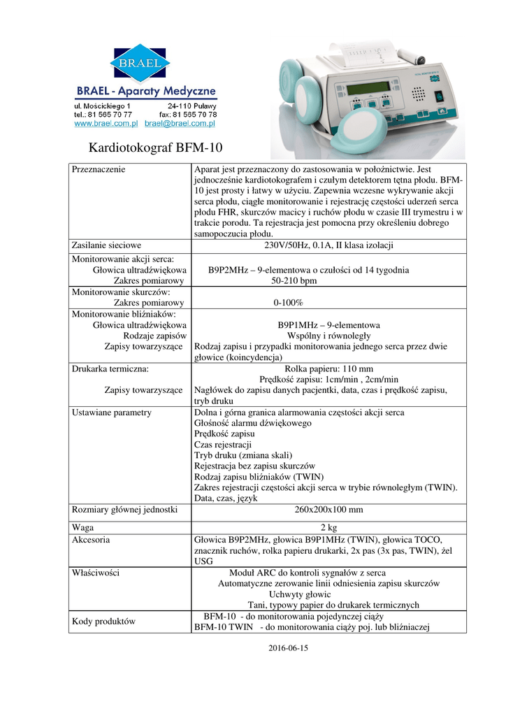 Kardiotokograf BFM-10 Przeznaczenie Zasilanie sieciowe Aparat jest przeznaczony do zastosowania w położnictwie. Jest jednocześnie kardiotokografem i czułym detektorem tętna płodu. BFM10 jest prosty i łatwy w użyciu. Zapewnia wczesne wykrywanie akcji serca płodu, ciągłe monitorowanie i rejestrację częstości uderzeń serca płodu FHR, skurczów macicy i ruchów płodu w czasie III trymestru i w trakcie porodu. Ta rejestracja jest pomocna przy określeniu dobrego samopoczucia płodu. 230V/50Hz, 0.1A, II klasa izolacji Monitorowanie akcji serca: Głowica ultradźwiękowa B9P2MHz – 9-elementowa o czułości od 14 tygodnia Zakres pomiarowy 50-210 bpm Monitorowanie skurczów: Zakres pomiarowy 0-100% Monitorowanie bliźniaków: B9P1MHz – 9-elementowa Głowica ultradźwiękowa Wspólny i równoległy Rodzaje zapisów Zapisy towarzyszące Rodzaj zapisu i przypadki monitorowania jednego serca przez dwie głowice (koincydencja) Drukarka termiczna: Rolka papieru: 110 mm Prędkość zapisu: 1cm/min , 2cm/min Zapisy towarzyszące Nagłówek do zapisu danych pacjentki, data, czas i prędkość zapisu, tryb druku Ustawiane parametry Dolna i górna granica alarmowania częstości akcji serca Głośność alarmu dźwiękowego Prędkość zapisu Czas rejestracji Tryb druku (zmiana skali) Rejestracja bez zapisu skurczów Rodzaj zapisu bliźniaków (TWIN) Zakres rejestracji częstości akcji serca w trybie równoległym (TWIN). Data, czas, język Rozmiary głównej jednostki 260x200x100 mm Waga Akcesoria Właściwości Kody produktów 2 kg Głowica B9P2MHz, głowica B9P1MHz (TWIN), głowica TOCO, znacznik ruchów, rolka papieru drukarki, 2x pas (3x pas, TWIN), żel USG Moduł ARC do kontroli sygnałów z serca Automatyczne zerowanie linii odniesienia zapisu skurczów Uchwyty głowic Tani, typowy papier do drukarek termicznych BFM-10 - do monitorowania pojedynczej ciąży BFM-10 TWIN - do monitorowania ciąży poj. lub bliźniaczej 2016-06-15