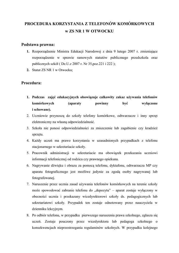 PROCEDURA KORZYSTANIA Z TELEFONÓW KOMÓRKOWYCH w ZS NR 1 W OTWOCKU Podstawa prawna: 1. Rozporządzenie Ministra Edukacji Narodowej z dnia 9 lutego 2007 r. zmieniające rozporządzenie w sprawie ramowych statutów publicznego przedszkola oraz publicznych szkół ( Dz.U.z 2007 r. Nr 35,poz.221 i 222 ); 2. Statut ZS NR 1 w Otwocku; Procedura: 1. Podczas zajęć edukacyjnych obowiązuje całkowity zakaz używania telefonów komórkowych (aparaty powinny być wyłączone i schowane). 2. Uczniowie przynoszą do szkoły telefony komórkowe, odtwarzacze i inny sprzęt elektroniczny na własną odpowiedzialność. 3. Szkoła nie ponosi odpowiedzialności za zniszczenie lub zagubienie czy kradzież sprzętu. 4. Każdy uczeń ma prawo korzystania w uzasadnionych przypadkach z telefonu stacjonarnego w sekretariacie szkoły. 5. Pracownik administracji w sekretariacie ma obowiązek przekazania uczniowi informacji telefonicznej od rodzica czy prawnego opiekuna. 6. Nagrywanie dźwięku i obrazu za pomocą telefonu, dyktafonu, odtwarzacza MP czy aparatu fotograficznego jest możliwe jedynie za zgodą osoby nagrywanej lub fotografowanej. 7. Naruszenie przez ucznia zasad używania telefonów komórkowych na terenie szkoły może spowodować zabranie telefonu do „depozytu” – aparat zostaje wyłączony w obecności ucznia i przekazany wicedyrektorowi szkoły ds. pedagogicznych lub sekretariatowi szkoły. Przypadek ten zostaje odnotowany przez nauczyciela w dzienniku lekcyjnym. 8. Po odbiór telefonu, w przypadku pierwszego naruszenia prawa szkolnego, zgłasza się uczeń. Zostaje pouczony przez wicedyrektora lub pedagoga szkolnego o konsekwencjach nieprzestrzegania regulaminów szkolnych. W przypadku kolejnego incydentu do szkoły zgłaszają się rodzice lub prawni opiekunowie ucznia. Zostają oni zapoznani z sytuacją i pouczeni o konsekwencjach ( w tym konsekwencjach prawnych związanych z naruszeniem prywatności pracowników szkoły). 9. Powyższe zasady dotyczą również nauczycieli i innych pracowników szkoły, którzy podczas lekcji nie mogą korzystać z tel. komórkowych. W przypadku ich naruszenia dyrektor udziela pracownikowi upomnienia. 10. Wszelkie objawy permanentnego łamania zasad współżycia społecznego w szkole mogą być traktowane jako przejaw demoralizacji i skutkować skierowaniem sprawy do sądu rodzinnego.