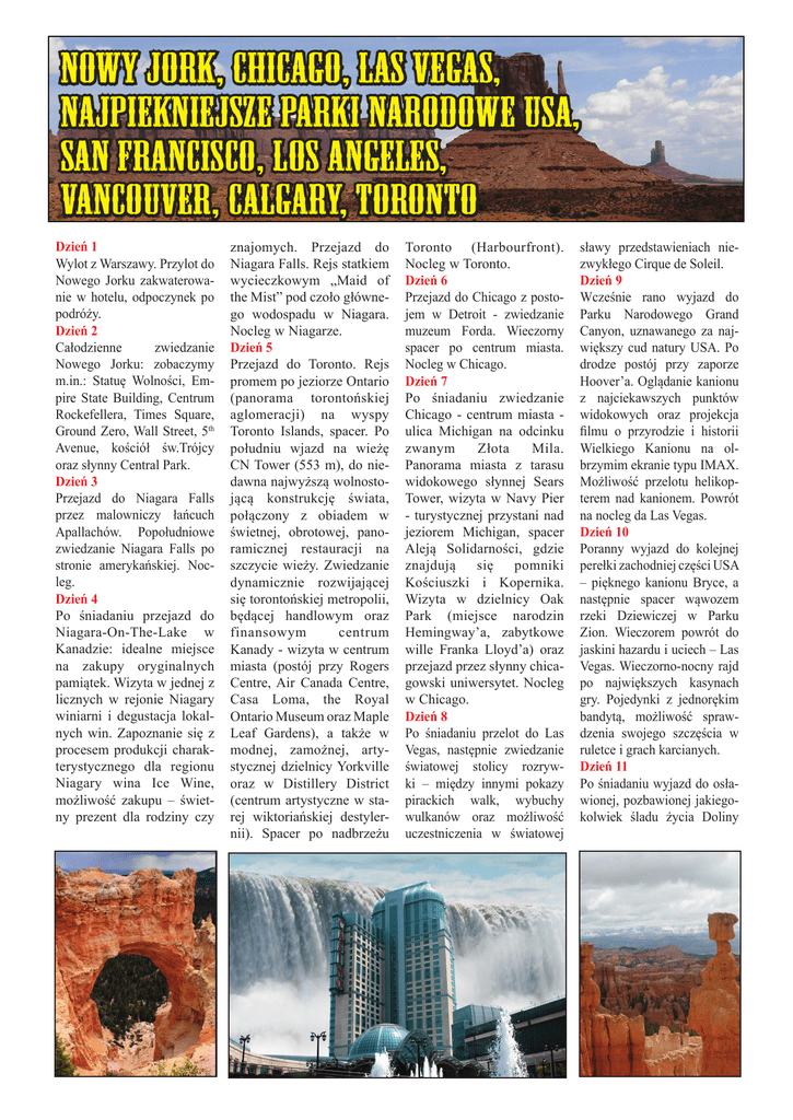 NOWY JORK, chicago, LAS VEGAS, najpiekniejsze PARKI NARODOWE USA, SAN FRANCISCO, LOS ANGELES, VANCOUVER, CALGARY, TORONTO Dzień 1 Wylot z Warszawy. Przylot do Nowego Jorku zakwaterowanie w hotelu, odpoczynek po podróży. Dzień 2 Całodzienne zwiedzanie Nowego Jorku: zobaczymy m.in.: Statuę Wolności, Empire State Building, Centrum Rockefellera, Times Square, Ground Zero, Wall Street, 5th Avenue, kościół św.Trójcy oraz słynny Central Park. Dzień 3 Przejazd do Niagara Falls przez malowniczy łańcuch Apallachów. Popołudniowe zwiedzanie Niagara Falls po stronie amerykańskiej. Nocleg. Dzień 4 Po śniadaniu przejazd do Niagara-On-The-Lake w Kanadzie: idealne miejsce na zakupy oryginalnych pamiątek. Wizyta w jednej z licznych w rejonie Niagary winiarni i degustacja lokalnych win. Zapoznanie się z procesem produkcji charakterystycznego dla regionu Niagary wina Ice Wine, możliwość zakupu – świetny prezent dla rodziny czy znajomych. Przejazd do Niagara Falls. Rejs statkiem wycieczkowym „Maid of the Mist” pod czoło głównego wodospadu w Niagara. Nocleg w Niagarze. Dzień 5 Przejazd do Toronto. Rejs promem po jeziorze Ontario (panorama torontońskiej aglomeracji) na wyspy Toronto Islands, spacer. Po południu wjazd na wieżę CN Tower (553 m), do niedawna najwyższą wolnostojącą konstrukcję świata, połączony z obiadem w świetnej, obrotowej, panoramicznej restauracji na szczycie wieży. Zwiedzanie dynamicznie rozwijającej się torontońskiej metropolii, będącej handlowym oraz finansowym centrum Kanady - wizyta w centrum miasta (postój przy Rogers Centre, Air Canada Centre, Casa Loma, the Royal Ontario Museum oraz Maple Leaf Gardens), a także w modnej, zamożnej, artystycznej dzielnicy Yorkville oraz w Distillery District (centrum artystyczne w starej wiktoriańskiej destylernii). Spacer po nadbrzeżu Toronto (Harbourfront). Nocleg w Toronto. Dzień 6 Przejazd do Chicago z postojem w Detroit - zwiedzanie muzeum Forda. Wieczorny spacer po centrum miasta. Nocleg w Chicago. Dzień 7 Po śniadaniu zwiedzanie Chicago - centrum miasta ulica Michigan na odcinku zwanym Złota Mila. Panorama miasta z tarasu widokowego słynnej Sears Tower, wizyta w Navy Pier - turystycznej przystani nad jeziorem Michigan, spacer Aleją Solidarności, gdzie znajdują się pomniki Kościuszki i Kopernika. Wizyta w dzielnicy Oak Park (miejsce narodzin Hemingway’a, zabytkowe wille Franka Lloyd’a) oraz przejazd przez słynny chicagowski uniwersytet. Nocleg w Chicago. Dzień 8 Po śniadaniu przelot do Las Vegas, następnie zwiedzanie światowej stolicy rozrywki – między innymi pokazy pirackich walk, wybuchy wulkanów oraz możliwość uczestniczenia w światowej sławy przedstawieniach niezwykłego Cirque de Soleil. Dzień 9 Wcześnie rano wyjazd do Parku Narodowego Grand Canyon, uznawanego za największy cud natury USA. Po drodze postój przy zaporze Hoover’a. Oglądanie kanionu z najciekawszych punktów widokowych oraz projekcja filmu o przyrodzie i historii Wielkiego Kanionu na olbrzymim ekranie typu IMAX. Możliwość przelotu helikopterem nad kanionem. Powrót na nocleg da Las Vegas. Dzień 10 Poranny wyjazd do kolejnej perełki zachodniej części USA – pięknego kanionu Bryce, a następnie spacer wąwozem rzeki Dziewiczej w Parku Zion. Wieczorem powrót do jaskini hazardu i uciech – Las Vegas. Wieczorno-nocny rajd po największych kasynach gry. Pojedynki z jednorękim bandytą, możliwość sprawdzenia swojego szczęścia w ruletce i grach karcianych. Dzień 11 Po śniadaniu wyjazd do osławionej, pozbawionej jakiegokolwiek śladu życia Doliny Śmierci (Death Valley National Park) i zwiedzanie jej najciekawszych zakątków. Po drodze kolejne urzekające, fotograficzne plenery w tajemniczej scenerii Red Rock Canyon. Nocleg w Las Vegas. Dzień 12 Rano wylot do Vancouver, następnie zwiedzania miasta, zwanego miastem ogrodów, malowniczo wciśniętego między pasmo Gór Nadbrzeżnych (Coast Mountains), a Pacyfik. Wizyta w największym na kontynencie amerykańskim parku miejskim im. Stanley’a z możliwością wejścia do Vancouver Aquarium Marine Science Centre. Spacer po najstarszej dzielnicy miasta – Gastown. Wizyta w Chinatown z możliwością zwiedzenia klasycznego chińskiego ogrodu. Spacer wokół kompleksu portowego uznanego za perełkę architektoniczną – Canada Place. Podczas spaceru po mieście zobaczymy gmach biblioteki przypominający kształtem rzymskie Koloseum, Stadion BC place, który do 1983 był największym na świecie stadionem z pneumatycznie podtrzymywanym dachem, następnie wjazd koleją Skyride na Grouse Mountain (na wysokość 1250m n.p.m), skąd roztacza się panorama Vancouver oraz pobliskich gór i wyspy Vancouver Island (widoczność nawet do 160km). Spacer po wiszą- cym 70 m nad wąwozem Capilano moście. Nocleg w Vancouver. Dzień 13 Po śniadaniu przejazd typowo kanadyjską, malowniczą trasą do Whistler, zwiedzanie obiektów olimpijskich, spacer po górzystej okolicy, przejazd na nocleg do Kamloops. Dzień 14 Po śniadaniu wyjazd do Parku Wells Gray w Clearwater, gdzie zobaczymy wodospady Helmcken. Następnie przejeżdżając przez Park Mt. Robson zatrzymamy się u stóp góry Robson (3954m n.p.m). Zatrzymamy się również w kanionie Maligne. Nocleg w Jasper. Dzień 15 Po śniadaniu wizyta w Columbia Ice Fields i relaks nad jeziorem Bow. Postoje w najciekawszych miejscach, m.in. nad jeziorem Peyto, spacer do wodospadów Athabasca i Sunwapta. Następnie przejazd malowniczą, przebogatą widokowo trasą Bow Valley Parkway do Banff na nocleg. Dzień 16 Po śniadaniu zwiedzanie Banff: wyjazd kolejką na szczyt Góry Sulphur z przepięknym widokiem na okolice oraz wodospad na rzecze Bow. Przejazd do najstarszego Parku Narodowego w Kanadzie – Banff National Park słynną drogą lodowcową Icefields Parkway. Trasa prowadzi przez sam środek Gór Skalistych i została uznana za jedną z najbardziej malowniczych dróg na świecie. Po poł