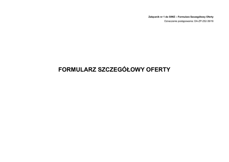 Załącznik nr 1 do SIWZ – Formularz Szczegółowy Oferty Oznaczenie postępowania: DA-ZP-252-39/16 FORMULARZ SZCZEGÓŁOWY OFERTY PAKIET 1 TESTY AUTOIMMUNOLOGICZNE DO ILOŚCIOWEGO OZNACZANIA PRZECIWCIAŁ PRZECIWKO OKREŚLONYM ANTYGENOM WRAZ Z DZIERŻAWĄ SPRZĘTU DO OZNACZANIA PRZECIWCIAŁ OKREŚLONYM ANTYGENOM. Wymagania Zamawiającego: 1. Każdy test posiada kontrole pozytywne i negatywne; 2. Jeden pasek testowy przeznaczony do diagnostyki jednego pacjenta (możliwość wykonania pojedynczych oznaczeń w celu skrócenia oczekiwania na wynik badania); 3. Odczynniki gotowe do uzycia, z wyjątkiem buforu płuczącego; 4. Panele pozwalające ocenić min. 20 parametrów; 5. Minimalna ilość surowicy 200µl; 6. Półautomat dostarczony wraz z niezbędnym oprogramowaniem i aplikacjami na wymagane testy; 7. Stosowane przeciwciała monoklonalne; 8. Brak reakcji krzyżowych z IgG, IgA, IgM; 9. Czułość i swoistość 90 %; 10. Profile paneli odczytywane automatycznie przez program; 11. Program do odczytu nieodpłatnie w języku polskim; 12. Wyniki wyrażone ilościowo lub półilościowo każdy parametr oceniany indywidualnie; 13. Niezbędny sprzęt nie starszy niż 2014 r.; 14. Nieodpłatne szkolenia personelu 15. Na czas trwania umowy wydzierżawiający udziela pełnej bezpłatnej naprawy i konserwacji sprzętów, Wymagania dotyczące półautomatu: • możliwość samodzielnej pracy; • wbudowany mechanizm kołyszący; • w pełni zautomatyzowany pobór odczynników; • załączone kanistry na odczynniki i odpady; • automatyczne dozowanie i aspiracja odczynników; • sprzęt dostarczany jako kompletny zestaw, bez konieczności dokupowania dodatkowego wyposażenia; • rynienki do półautomatu na paski testowe dostarczane bezpłatnie. Cżęść A. Testy autoimmunologiczne do ilościowego oznaczenia przeciwciał przeciwko okreslonym antygenom. 1 badanie = 1 panel Ilość L.p. Opis wyrobu J.m. badań 24 miesiące Panel pediatryczny 1 (zawierający między innymi p/ciała przeciw: mleko krowie, kazeina, białko jaja kurzego, żółtko jaja kurzego, marchew, ziemniak, bad. 1500 Cena jednostko wa netto Stawka Wartość Cena VAT netto jednostkowa brutto Wartość brutto jabłko, mąka, dorsz, orzech ziemny, soja, mix traw ( w tym bylica, tymotka łąkowa) , brzoza, pies, kot, koń, Dermaophagoides pteronyssinus, Dermatophagoides farinae, Aspergillus fumigatus, Cladosporum herbarum ) testy ilościowe lub półilościowe 2 Panel wziewny (zawierający między innymi p/ciała przeciwko: pyłek brzozy, pyłek olszyny, pyłek leszczyny, pyłek dębu, pyłek bylicy, żyto, pyłek babki lancetowatej, tymotka łąkowa, pies, kot, koń, świnka morska, chomik, D. pteronyssinus, D. farinae, Asp. fumigatus, Cladosprum herbarum, Alt. bad. 1500 Alternata) testy ilościowe lub półilościowe Panel pokarmowy (zawierający między innymi p/ciała przeciwko : mleko, białko i żółtko jaja 3 kurzego, dorsz, kazeina, soja, mąka, bad. 1000 ryż, jabłko, marchew, seler, ziemniak, pomidor, orzech ziemny i laskowy, migdał) testy ilościowe lub półilościowe Wartość pakietu (część A): netto ................................................................................. zł Słownie: ............................................................................................................. brutto ................................................................................ zł Słownie .............................................................................................................. Zastosowano stawkę VAT: ............ % Część B Dzierżawa sprzętu niezbędnego do wykonania oznaczeń (wytrząsarka laboratoryjna, pipeta 250µl, skaner do odczytu parametrów, drukarka) Wykonawca sporządzi dokument wg poniższego wzoru: - nazwa urządzenia:........................................................................................................ - typ: ......................................................................................................................... - producent: .............................................................................................................. - rok produkcji: ......................................................................................................... - wartość urządzenia: ............................................................................................... Przedmiot kwota za dzierżawy 1 miesiąc Ilość Stawka Wartość ogólna Kwota (netto) miesięcy VAT dzierżawy netto za 1 miesiąc Wartość ogólna dzierżawy brutto (brutto) Dzierżawa sprzętu niezbędnego do 24 wykonania oznaczeń (wytrząsarka laboratoryjna, pipeta 250µl, skaner do odczytu parametrów, drukarka ). Koszt dzierżawy (część B): netto ................................................................................. zł Słownie: ............................................................................................................. brutto ................................................................................ zł Słownie .............................................................................................................. Zastosowano stawkę VAT: ............ % Część C Dzierżawa sprzętu niezbędnego do wykonania oznaczeń (półautomatu do inkubacji ) Wykonawca sporządzi dokument wg poniższego wzoru: - nazwa urządzenia:........................................................................................................ - typ: ......................................................................................................................... - producent: .............................................................................................................. - rok produkcji: ......................................................................................................... - wartość urządzenia: .....................................................................................