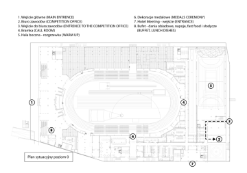 1. Wejście główne (MAIN ENTRENCE) 2. Biuro zawodów (COMPETITION OFFICE) 3. Wejście do biura zawodów (ENTRENCE TO THE COMPETITION OFFICE) 4. Bramka (CALL ROOM) 5. Hala boczna - rozgrzewka (WARM UP) 6. Dekoracje medalowe (MEDALS CEREMONY) 7. Hotel Meeting - wejście (ENTRANCE) 8. Bufet - dania obiadowe, napoje, fast food i słodycze (BUFFET, LUNCH DISHES) 5 1 4 3 8 6 2 Plan sytuacyjny poziom 0 7